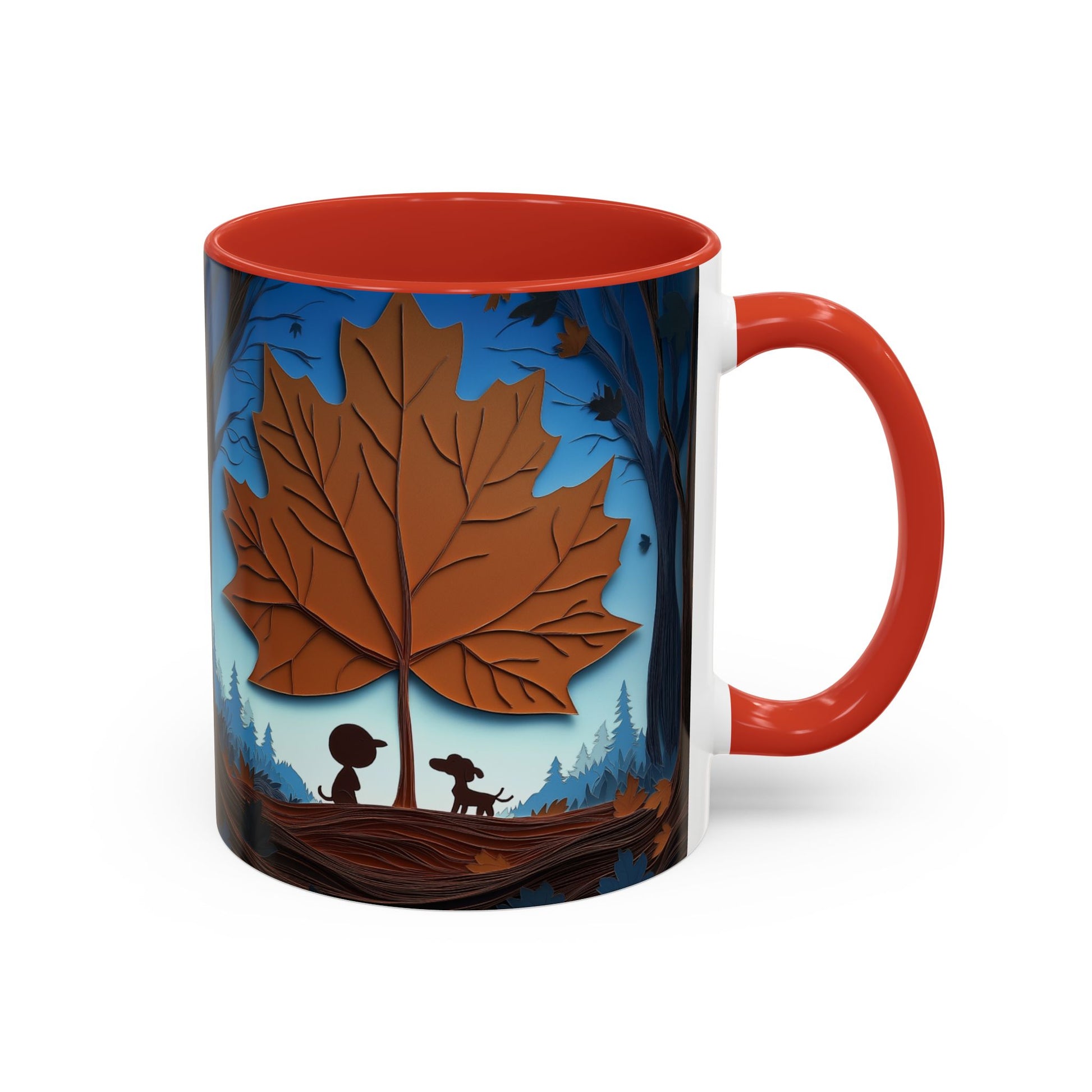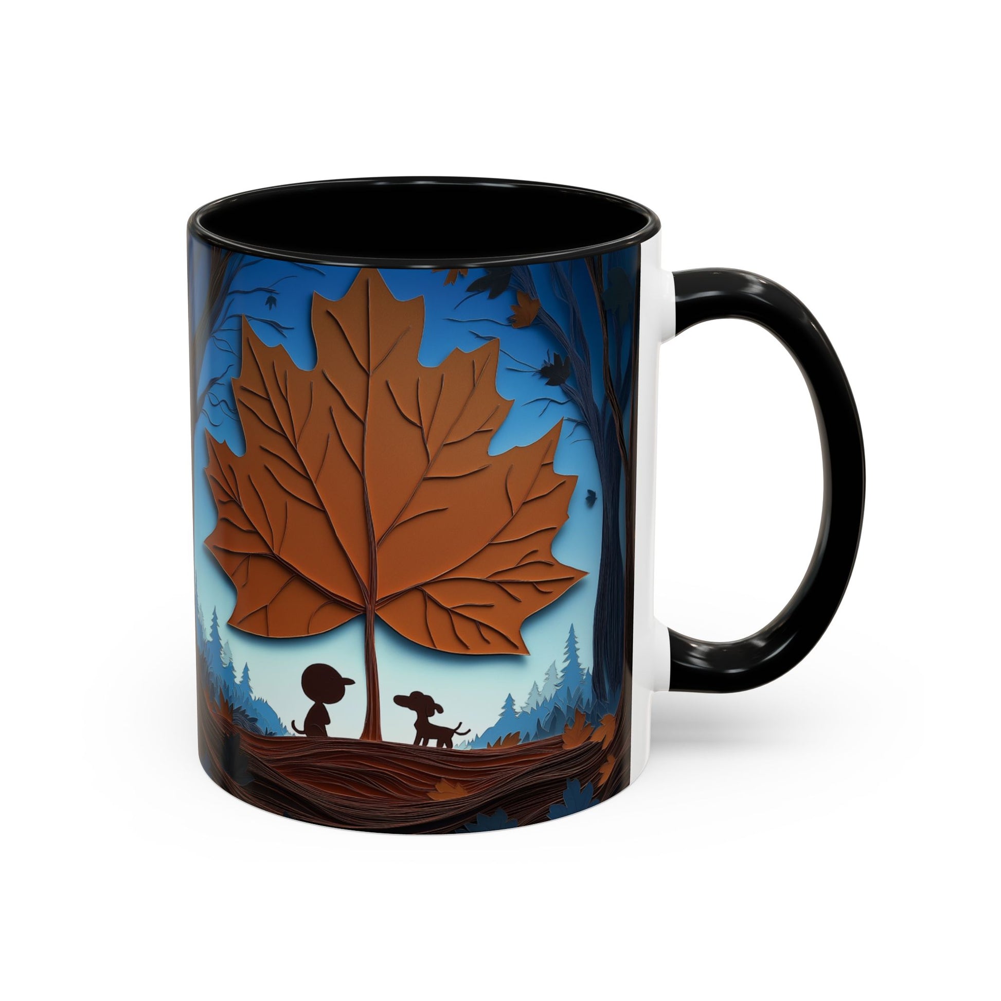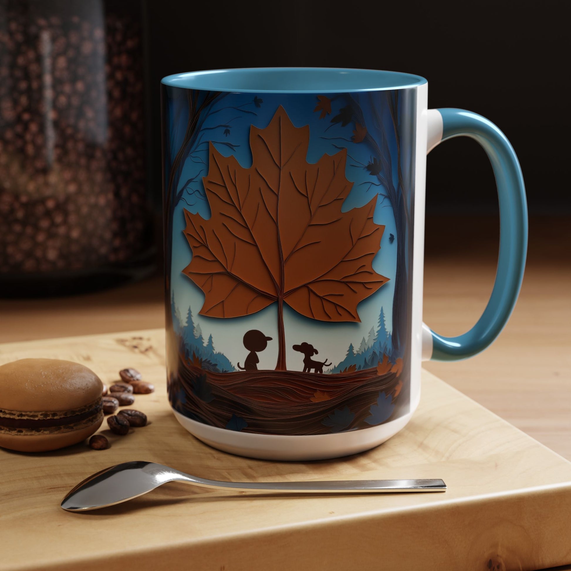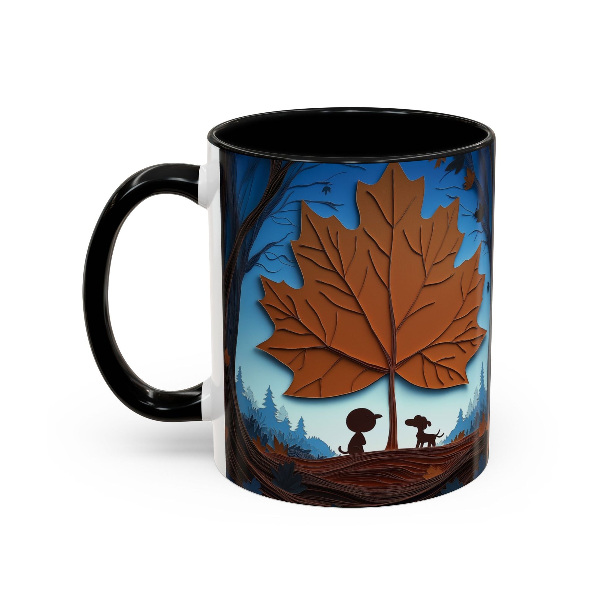 Embrace the nostalgic charm of autumn with the Autumn Ceramic Mug. This unique mug features a hand-crafted aesthetic with a brown leaf serving as a canvas for the iconic silhouettes. Set against a backdrop of stylized trees and a serene blue sky, this design captures the heartwarming essence of the classic cartoon. Perfect for your morning coffee, tea, or any comforting beverage, this mug brings a touch of childhood nostalgia and seasonal warmth to your daily routine, and the high-resolution mug makes an ideal gift or personal keepsake. Crafted from high-quality ceramic, it's both microwave and dishwasher safe for your convenience.