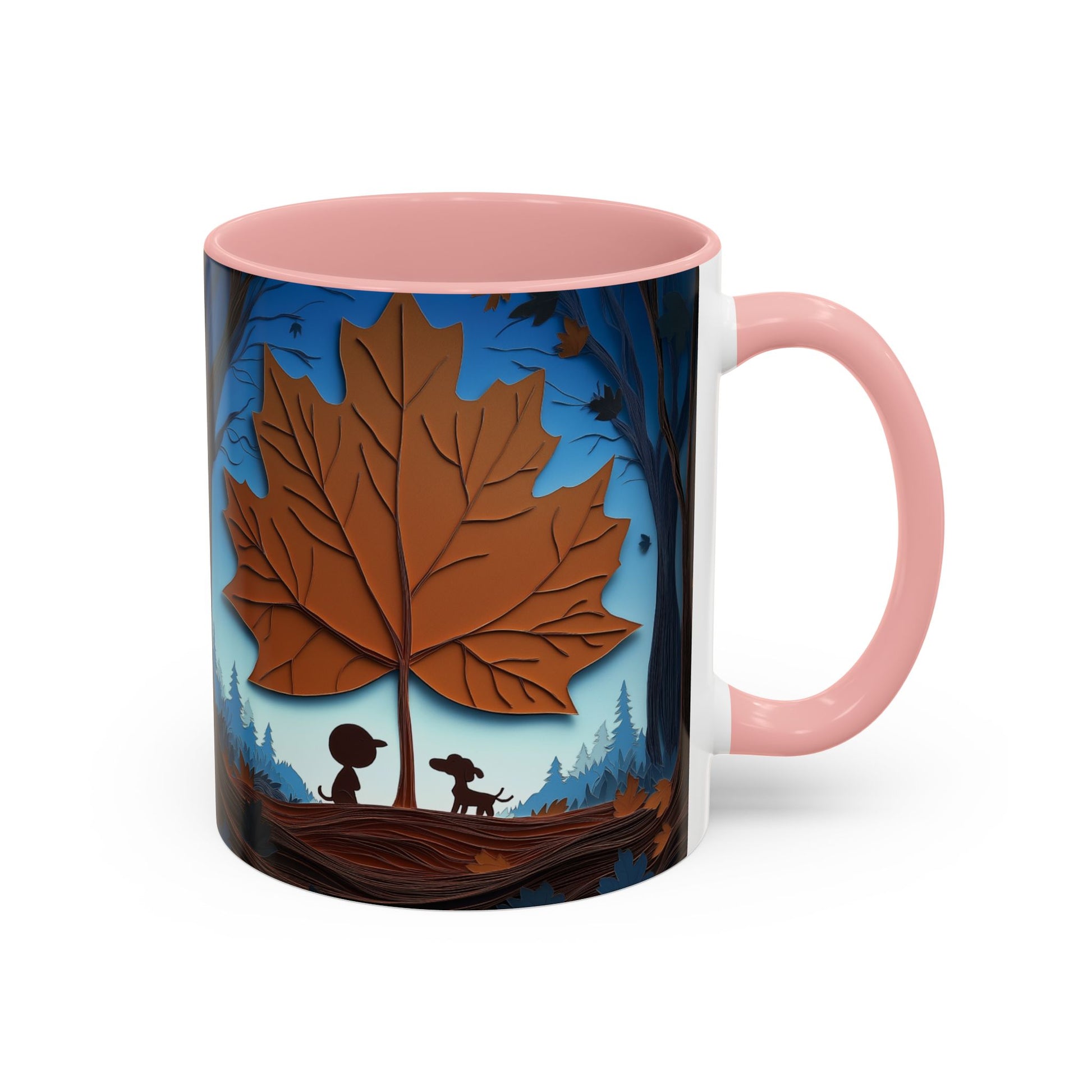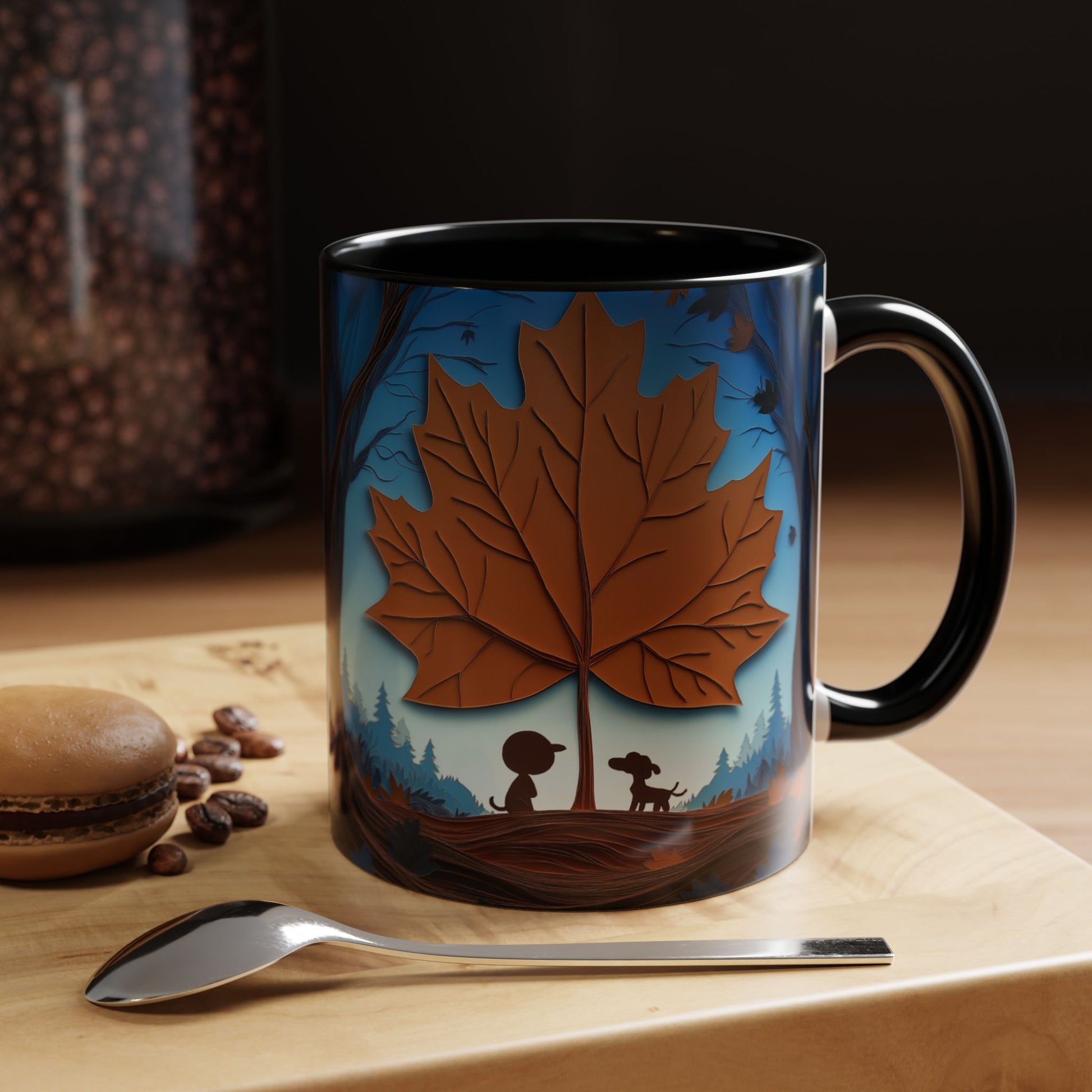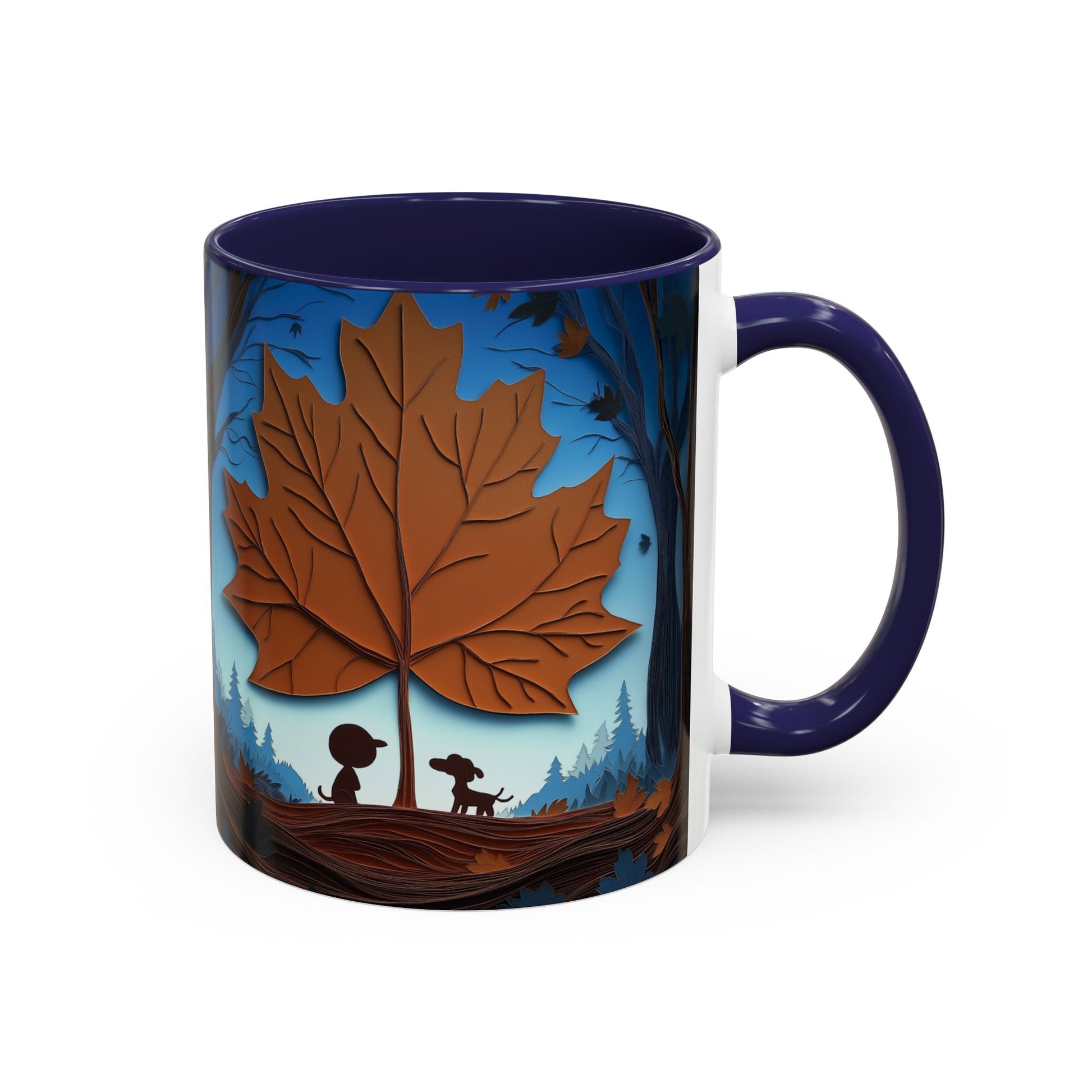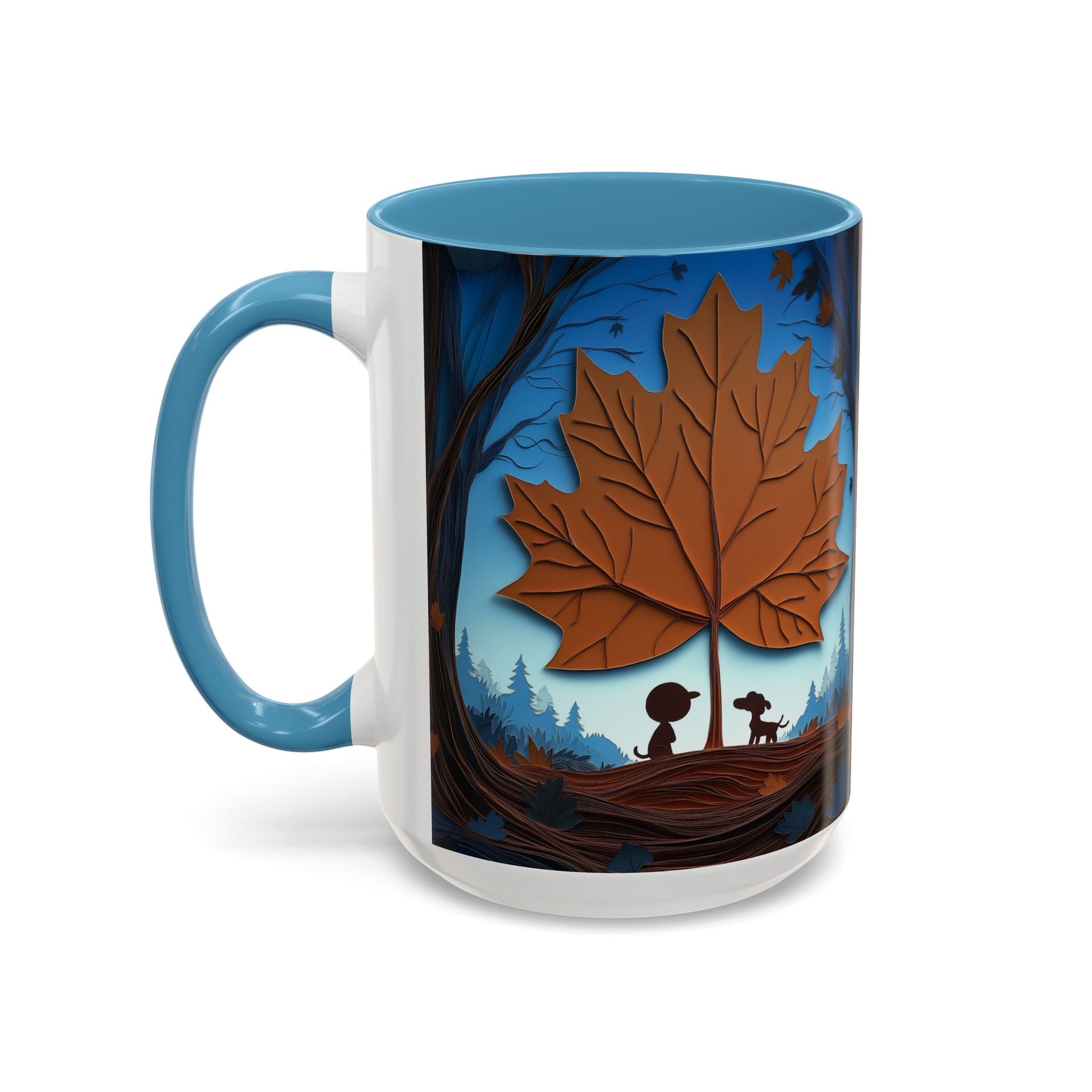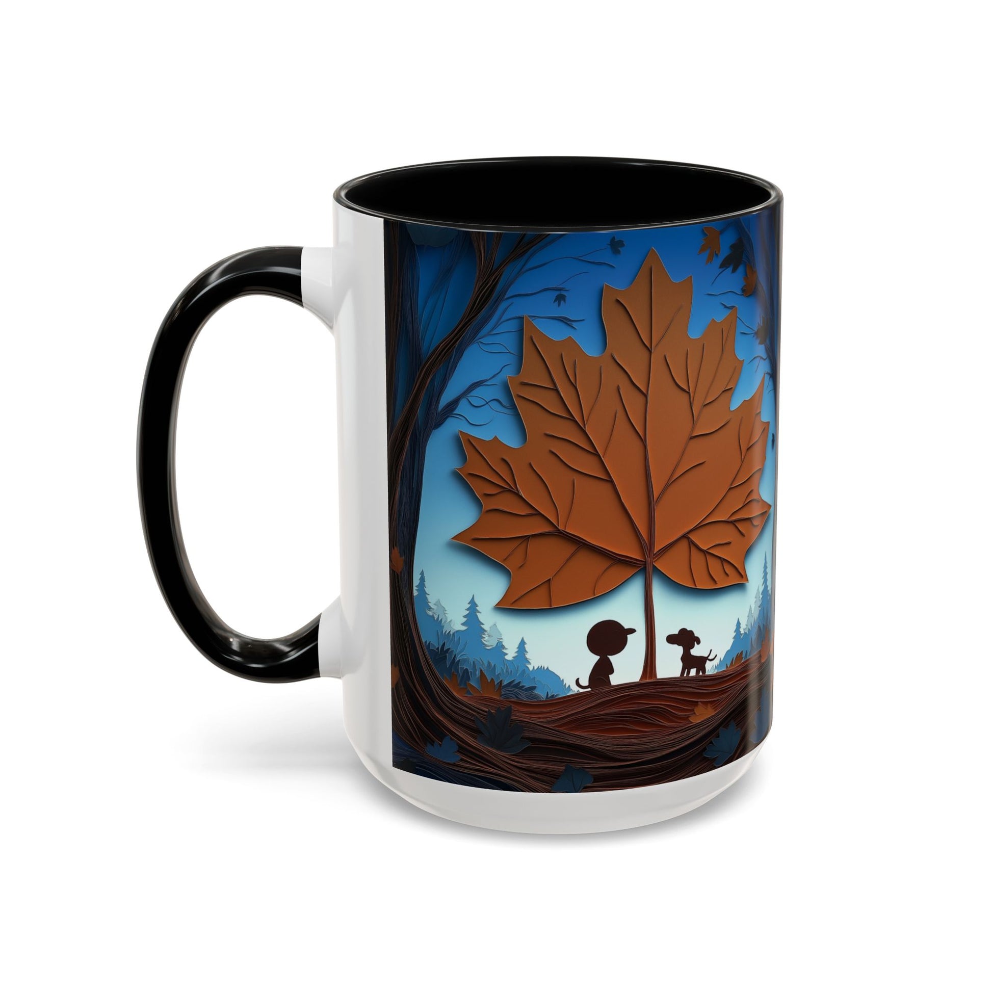 Embrace the nostalgic charm of autumn with the Autumn Ceramic Mug. This unique mug features a hand-crafted aesthetic with a brown leaf serving as a canvas for the iconic silhouettes. Set against a backdrop of stylized trees and a serene blue sky, this design captures the heartwarming essence of the classic cartoon. Perfect for your morning coffee, tea, or any comforting beverage, this mug brings a touch of childhood nostalgia and seasonal warmth to your daily routine, and the high-resolution mug makes an ideal gift or personal keepsake. Crafted from high-quality ceramic, it's both microwave and dishwasher safe for your convenience.