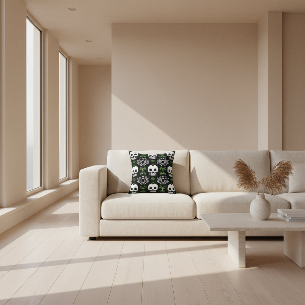 Enhance your Halloween decorations with this Black Spun Polyester Square Cushion, showcasing a bold black-and-white pattern of skulls, and spiders. This spooky yet chic pillow brings the perfect eerie vibe to your living space, making it great for Halloween gatherings or adding a gothic style year-round. Ideal for your couch, bed, or accent chair, this cushion combines comfort with an eye-catching design that's sure to make a statement.