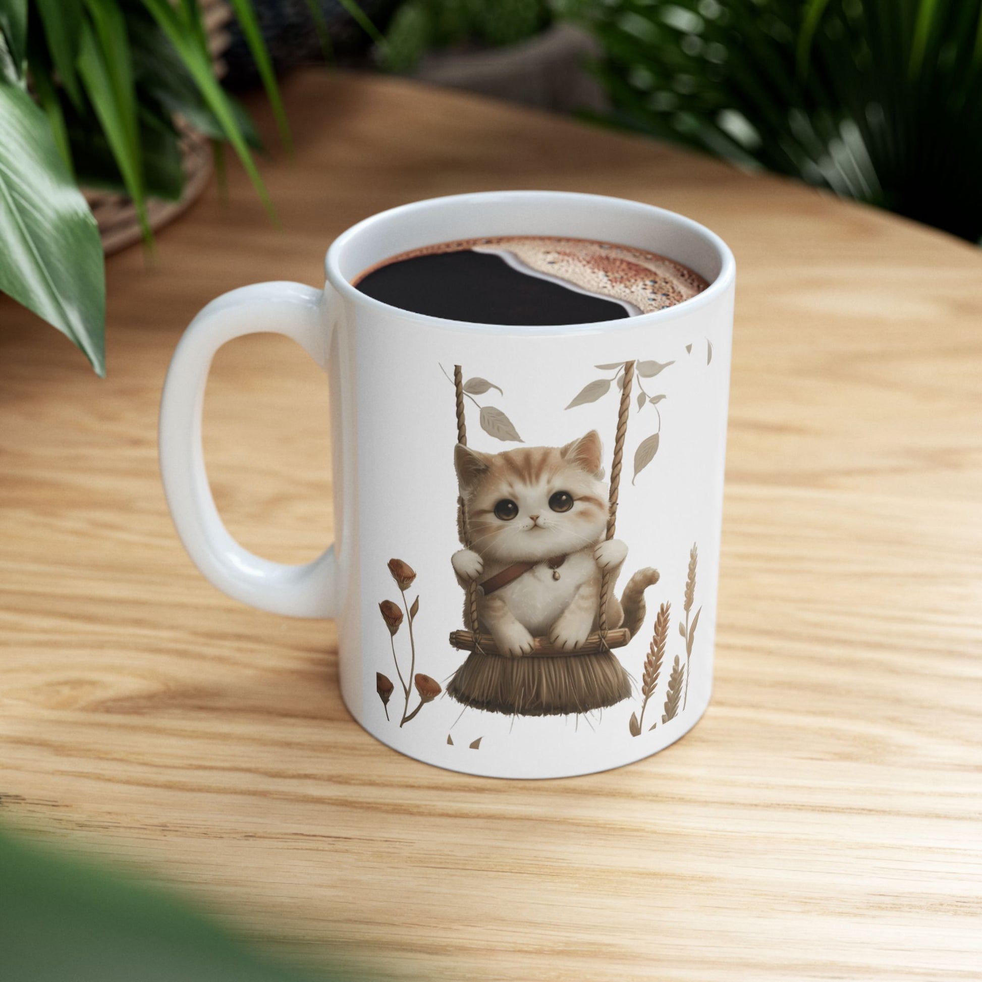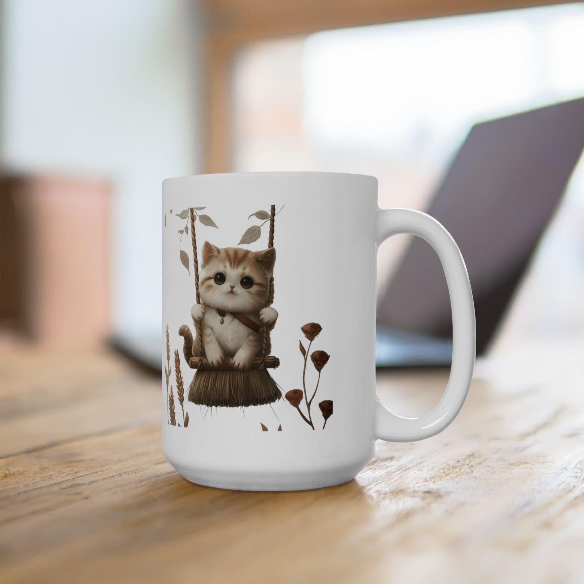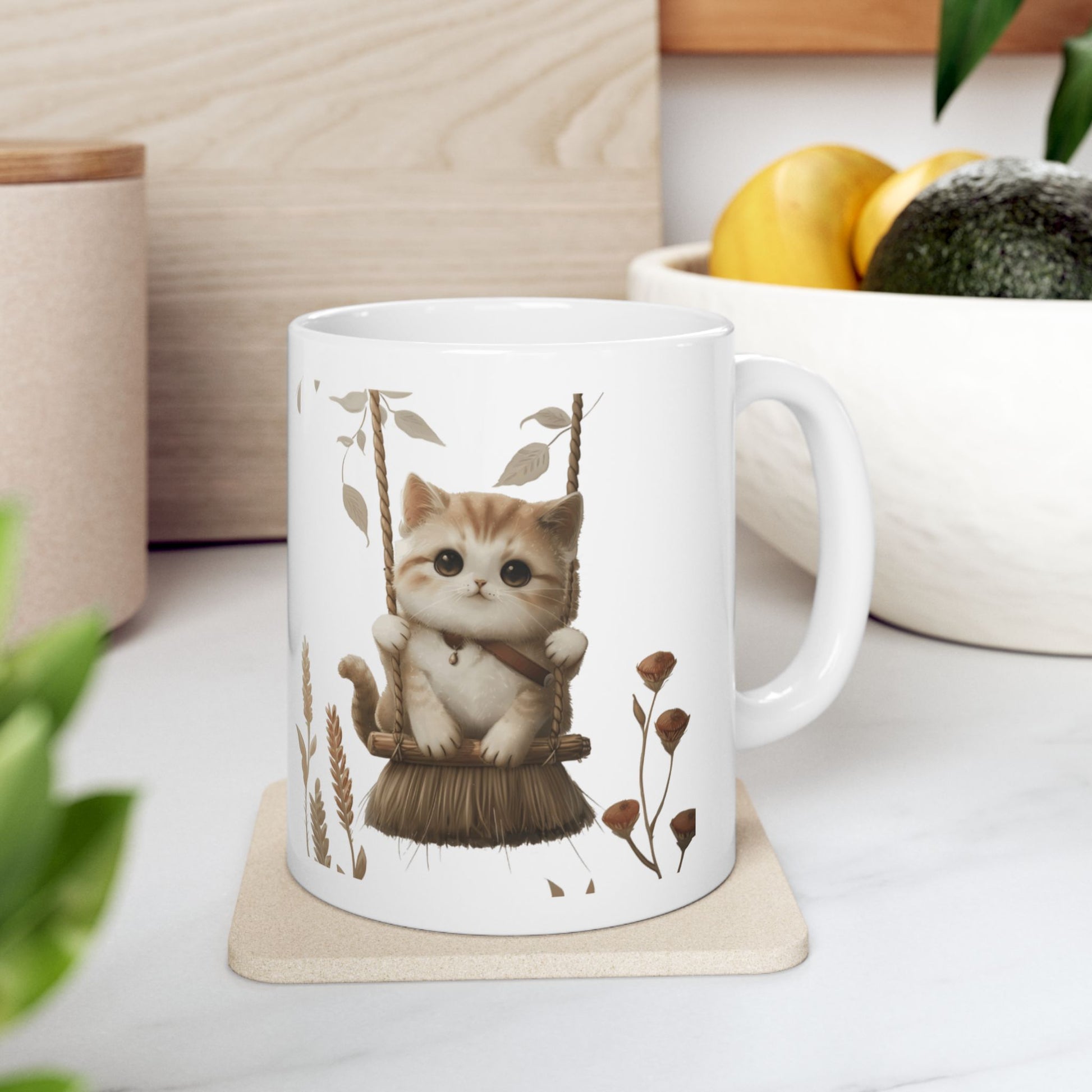 Calling all cat lovers and fans of whimsy! This delightful mug features a charming illustration of a playful cat perched on a broomstick bringing a magical vibe to your morning coffee or afternoon tea. This mug combines practicality with delightful style, perfect for cat lovers and fans of enchanting designs.