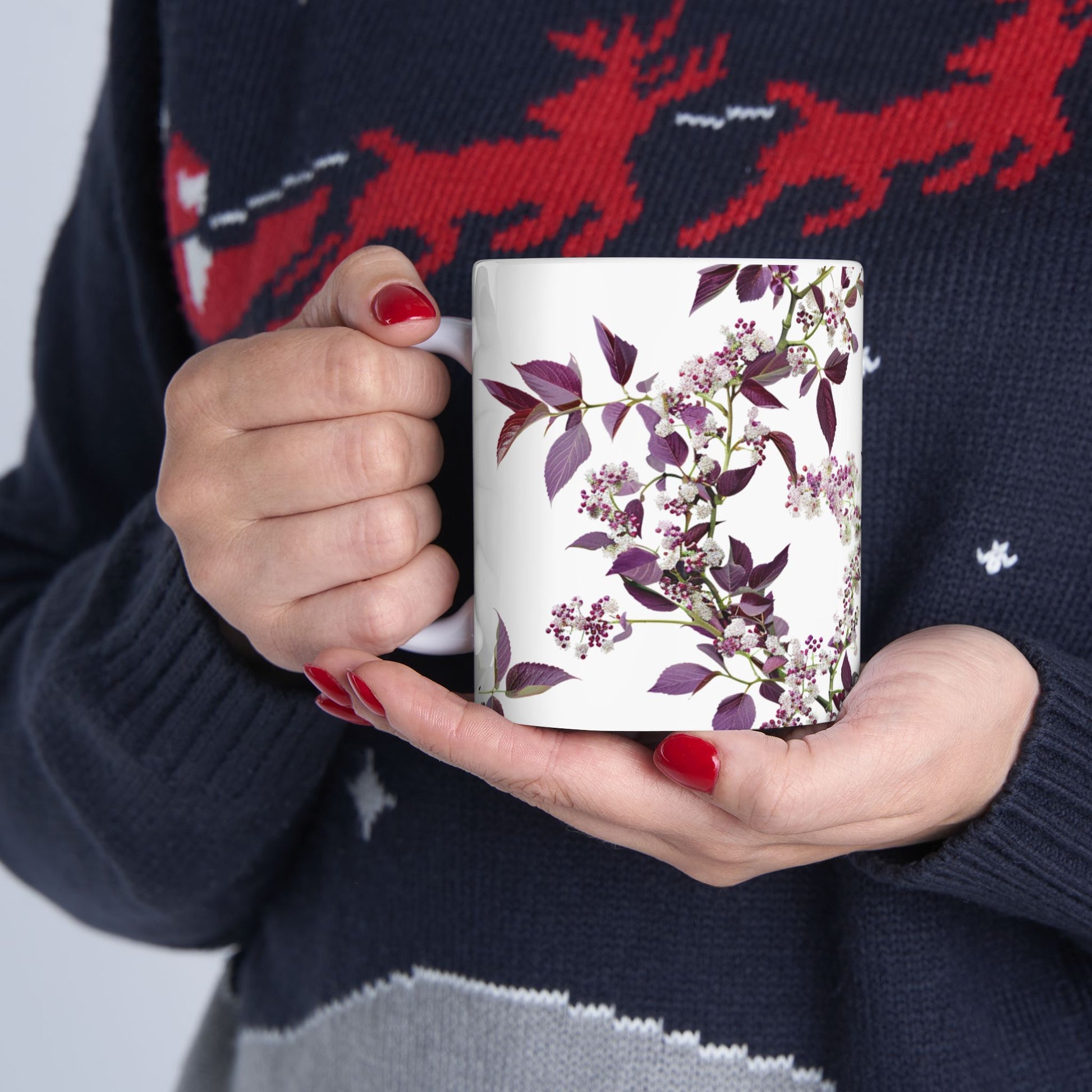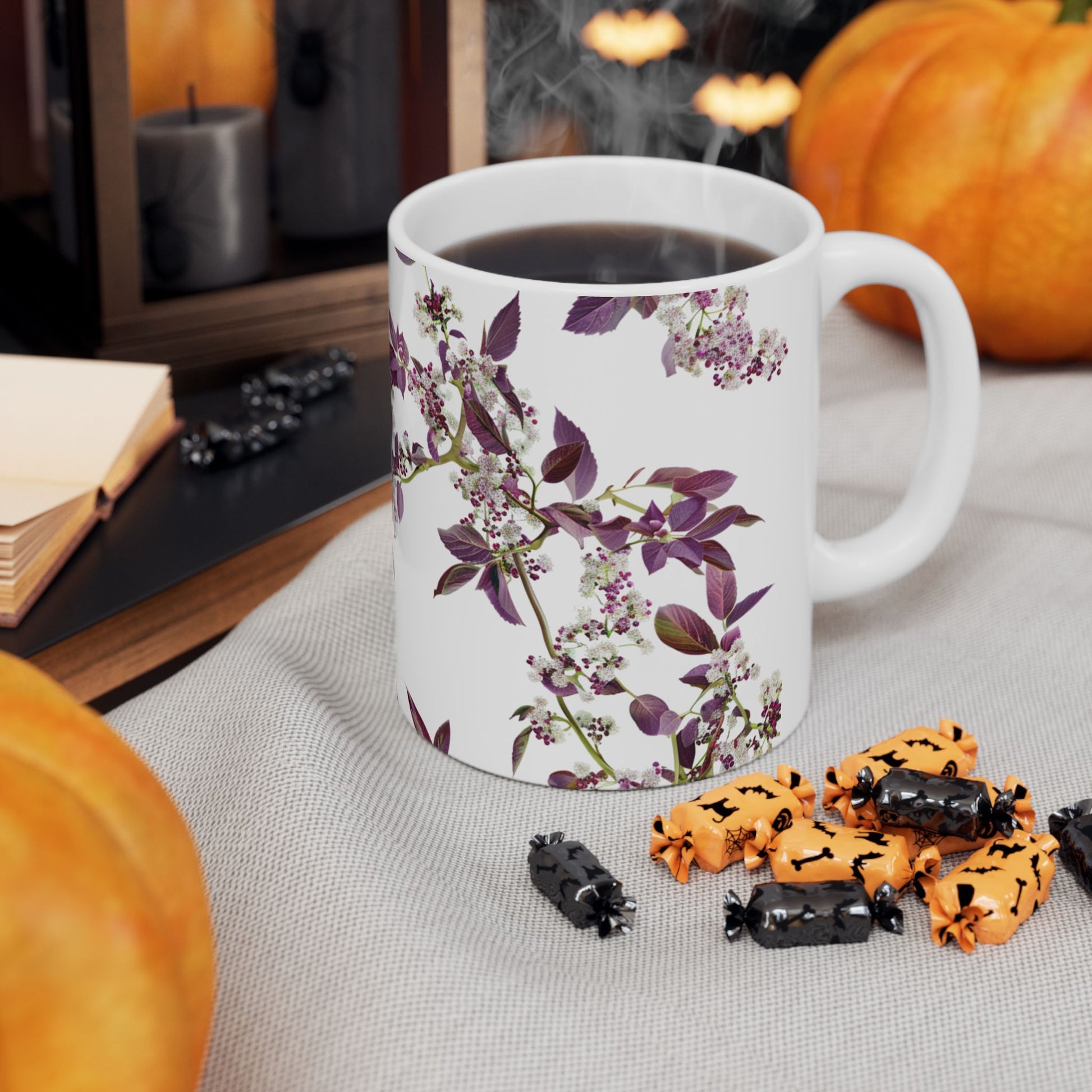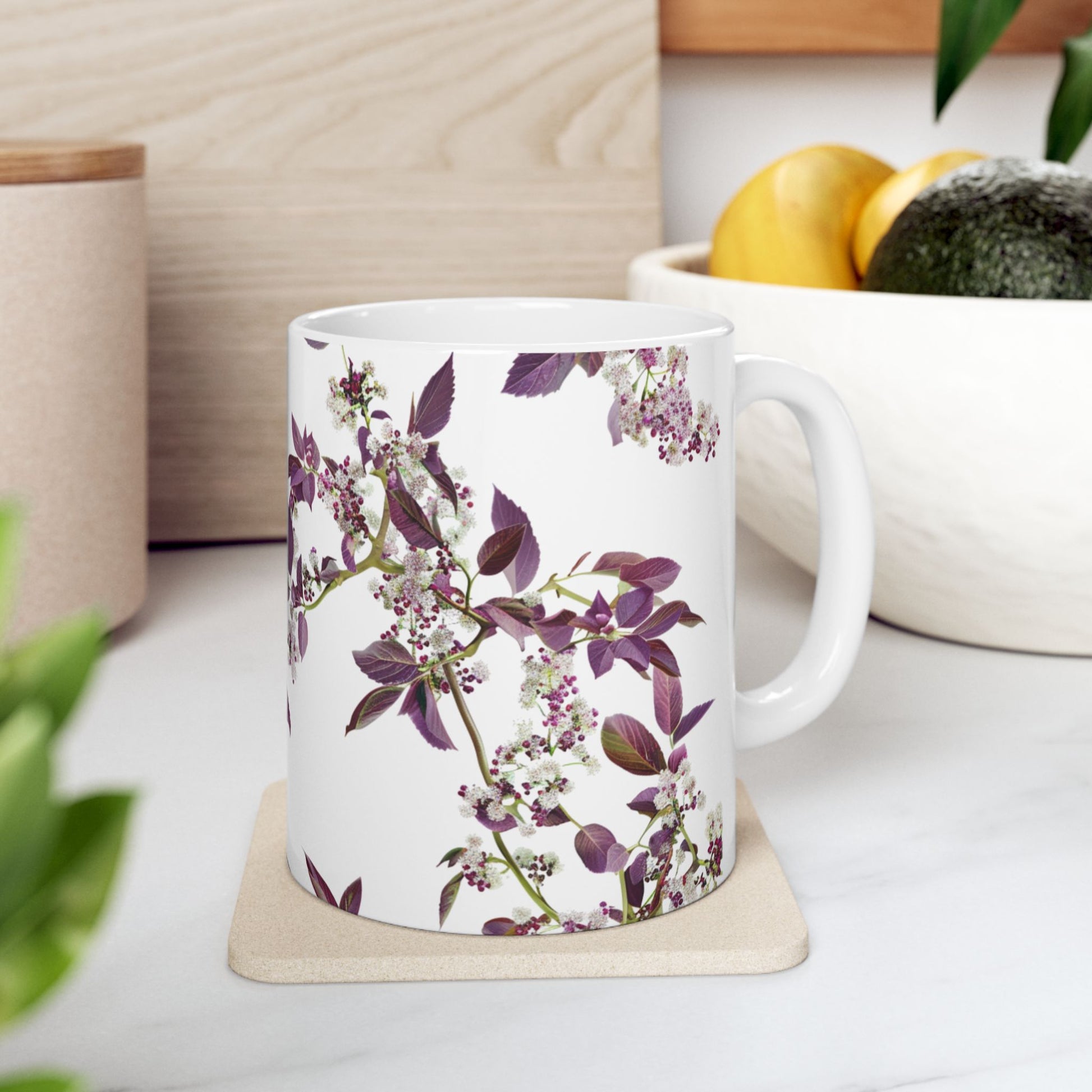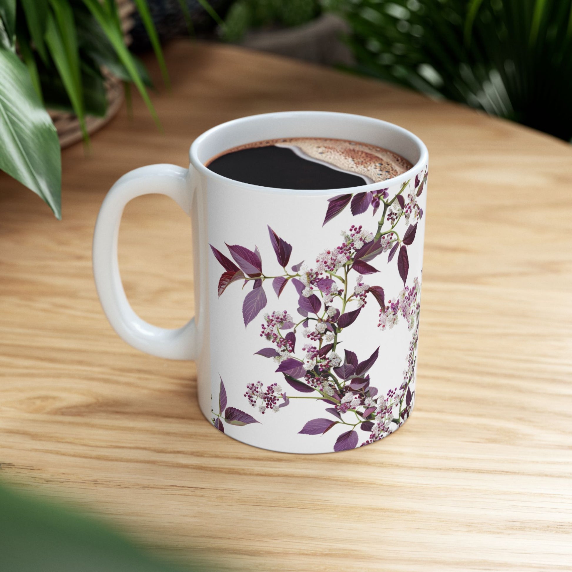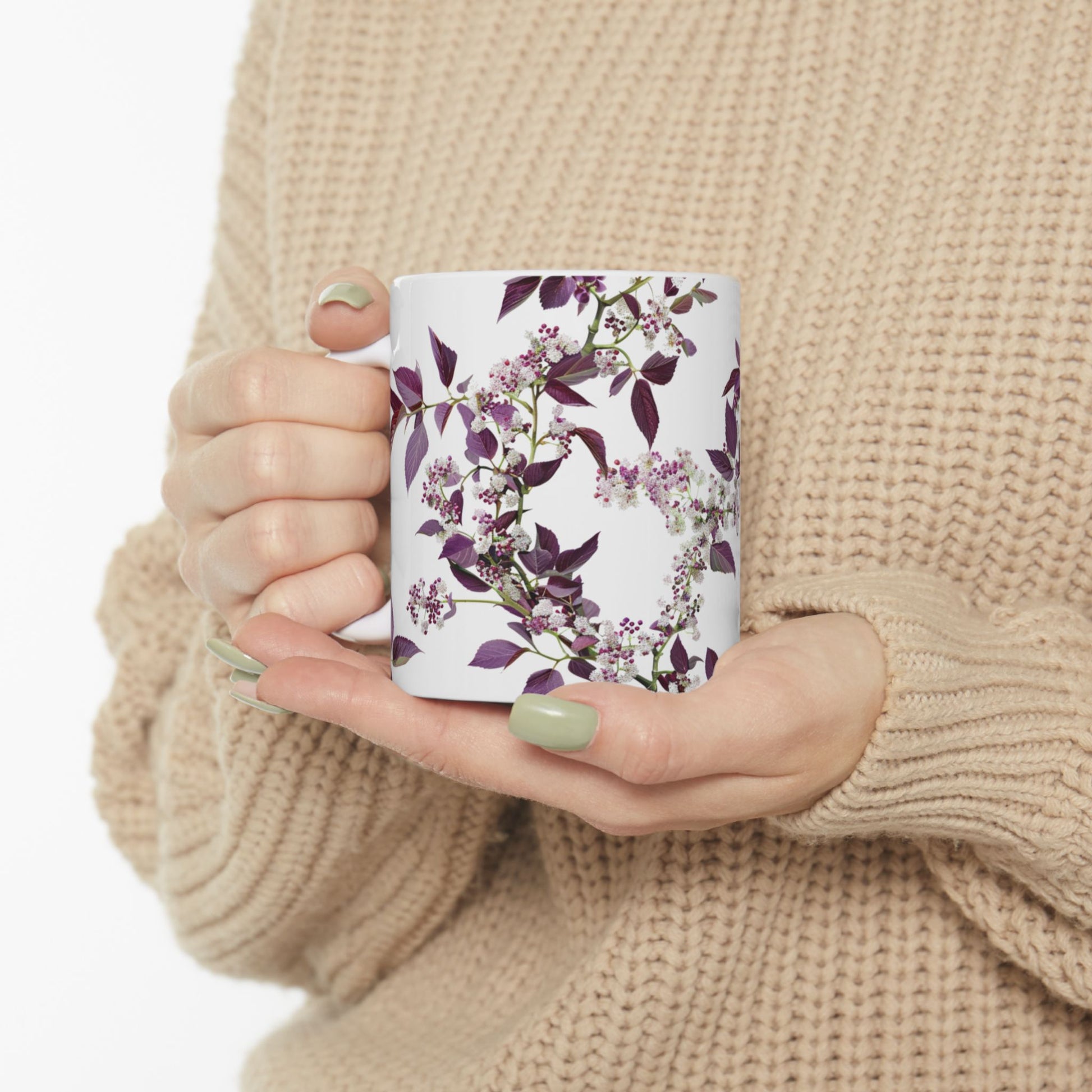Enjoy your morning coffee in this colorful ceramic mug adorned with small, dense flowers in shades of deep white and purple.