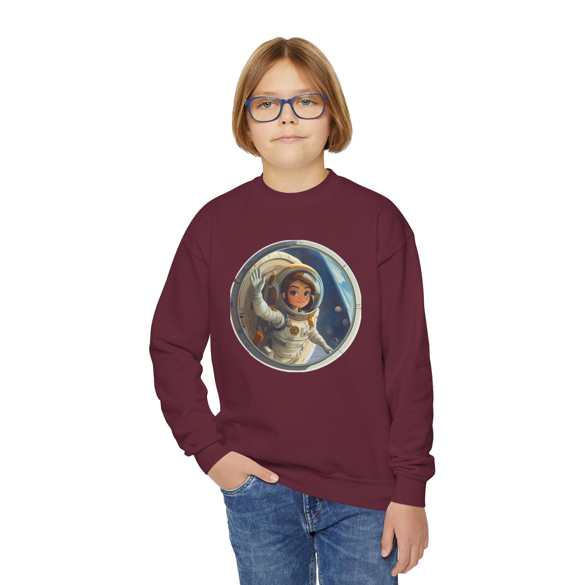 Inspire a love for adventure and exploration with this Youth Crewneck Sweatshirt featuring a cartoon-themed astronaut design. This sweatshirt showcases a realistic yet playful illustration of an astronaut in a space suit, waving within a circular space-themed backdrop. Perfect for young dreamers and space enthusiasts, it’s a standout piece for school, casual outings, or cozy days at home. Crafted from soft, breathable fabric, this crewneck sweatshirt offers comfort and durability. Its medium-heavy fabric delivers a cozy, warm feeling while each sweatshirt runs true to size for a great fit. Its unisex fit makes it ideal for boys and girls, while the vibrant astronaut design sparks creativity and wonder. Whether for daily wear or as a unique gift, this sweatshirt will surely delight kids who love all things outer space.