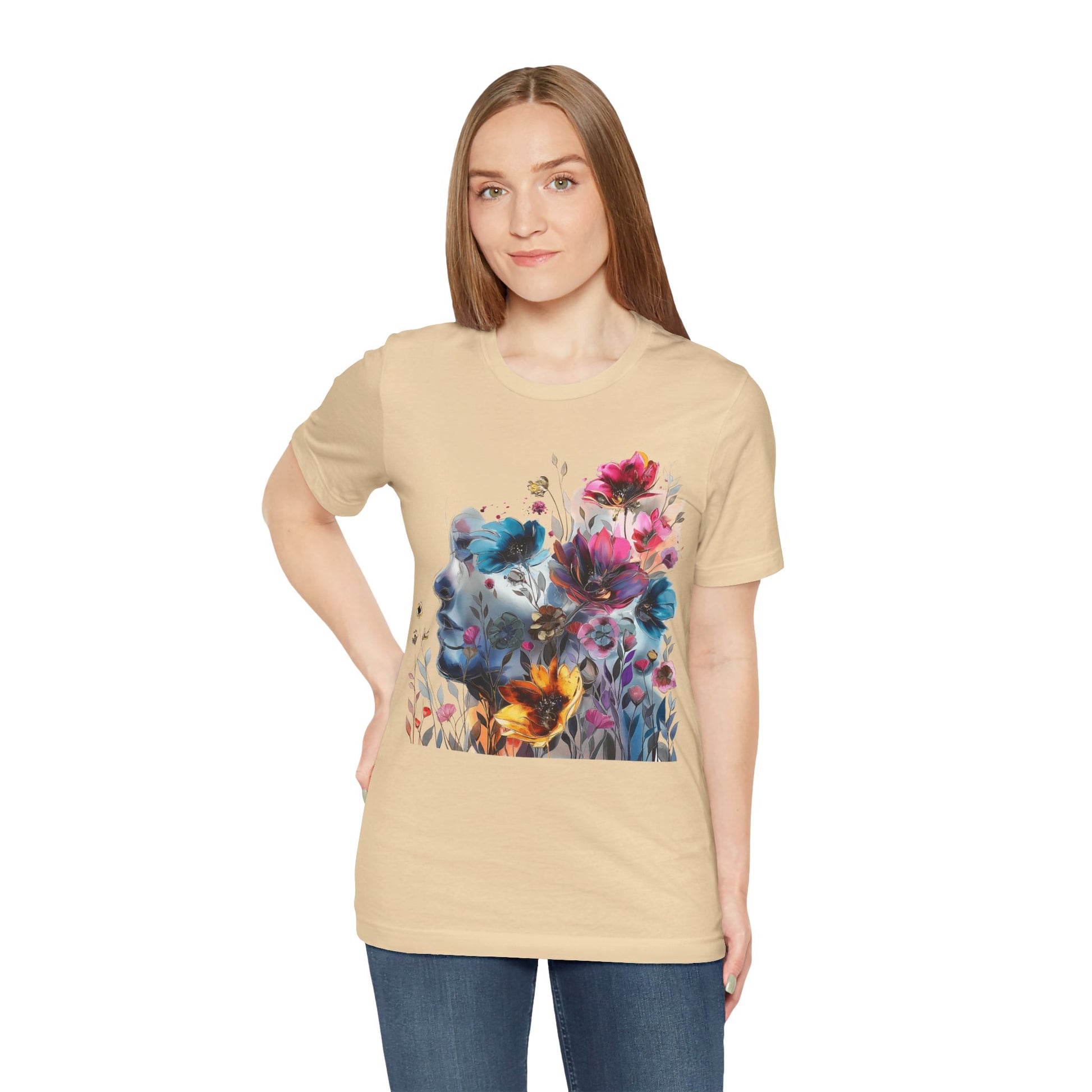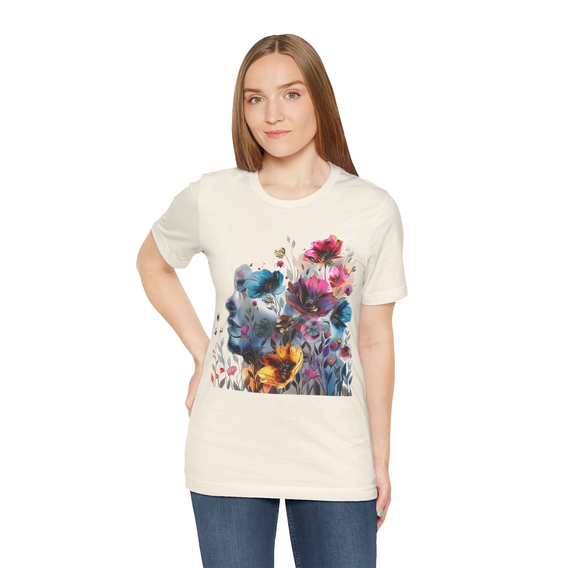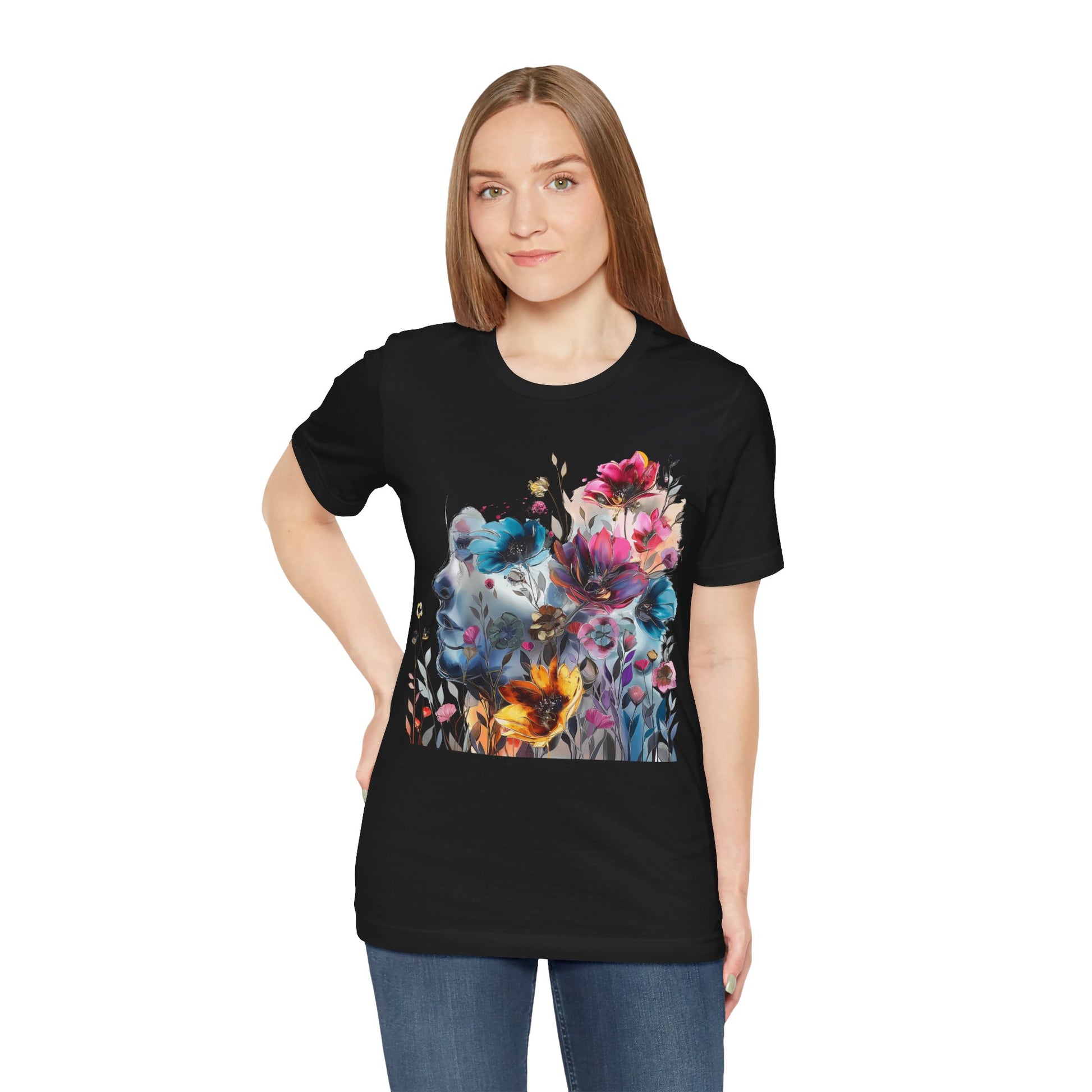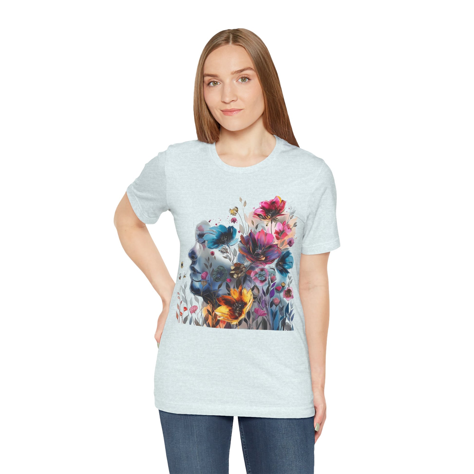 Elevate your wardrobe with our colorful painting miniature Jersey Tee a captivating watercolor illustration of a mysterious woman, featuring an attractive and inspirational design that will turn heads. Surrounding her are delicate, colorful flowers, adding a touch of vibrancy to the composition. The overall style of the illustration is reminiscent of a beautiful watercolor masterpiece, filled with soothing hues and subtle movements. Crafted from high-quality materials, this classic short-sleeved tee is comfortable for everyday wear. The vibrant colors and intricate miniature design evoke a sense of creativity and wonder, inspiring you to embrace your artistic side. Whether you're a lover of fine art or appreciate unique and eye-catching designs, this tee is the perfect choice to add a pop of inspiration to your outfit. Shop now and make a statement with our captivating watercolor illustration and beautiful colorful flowers!