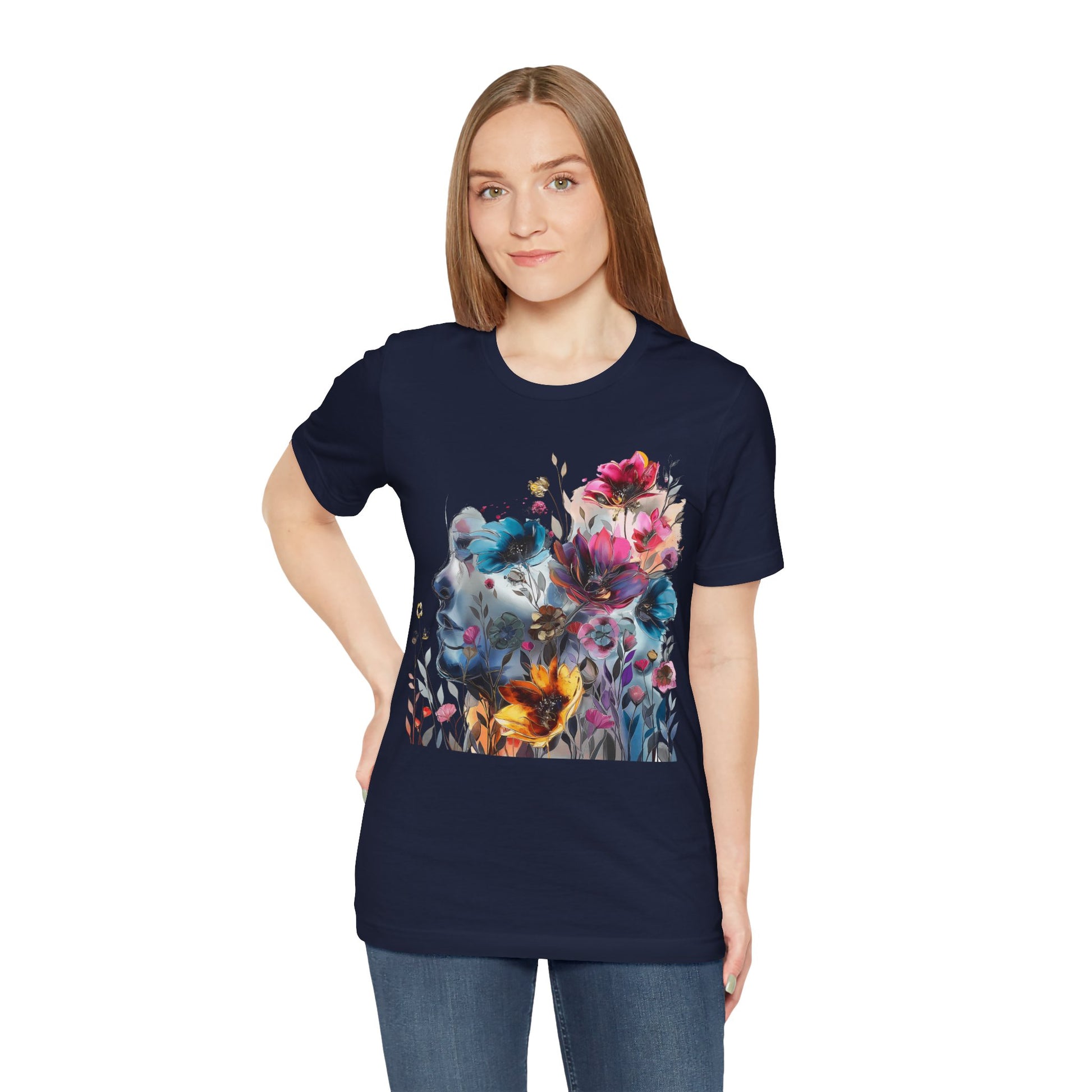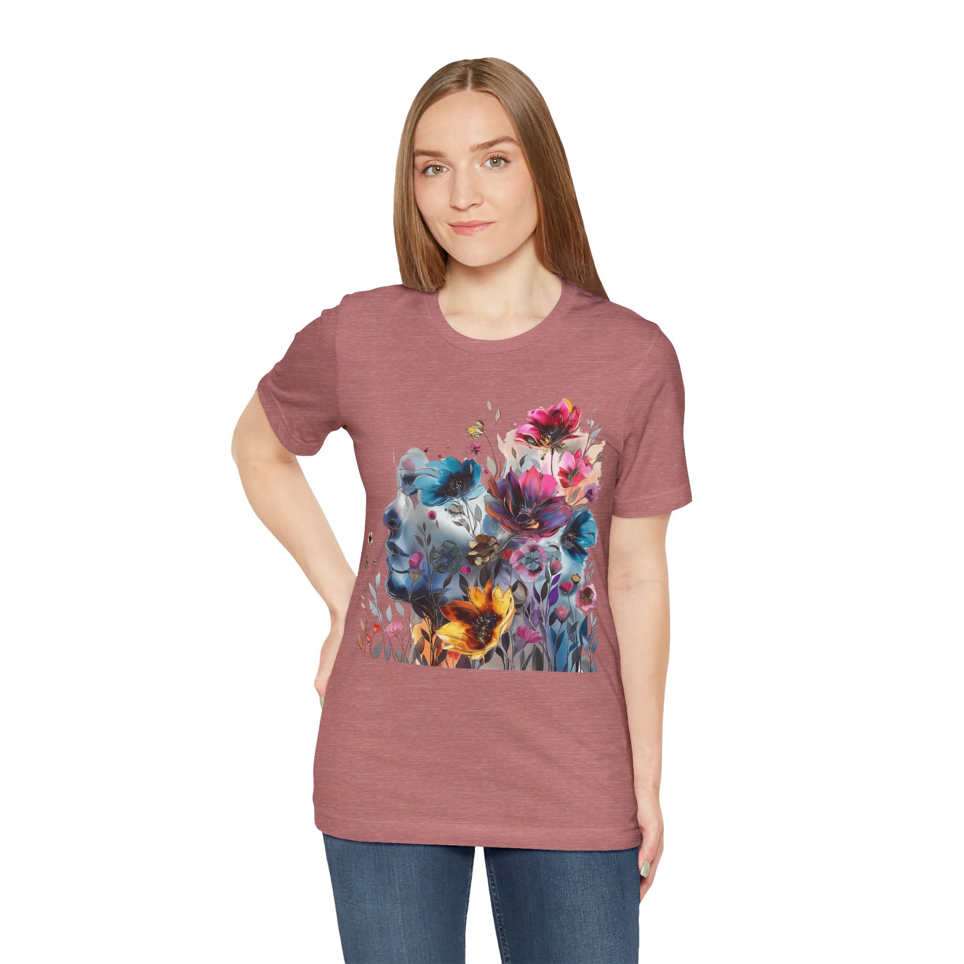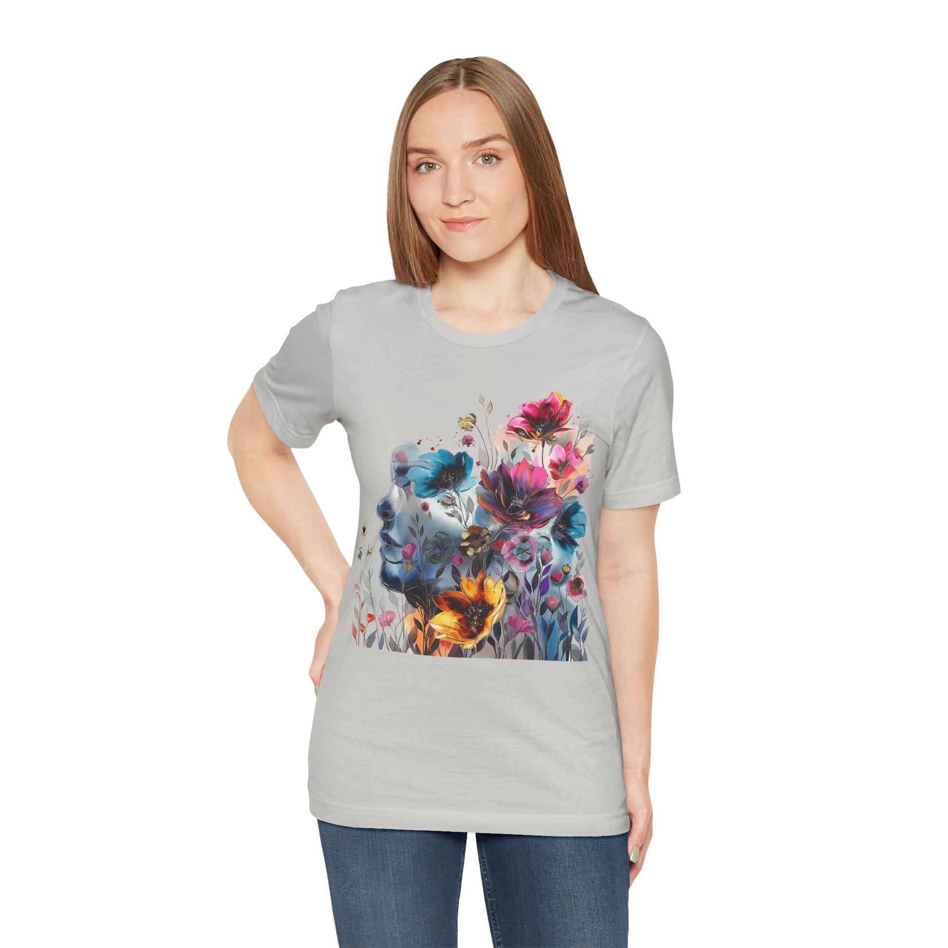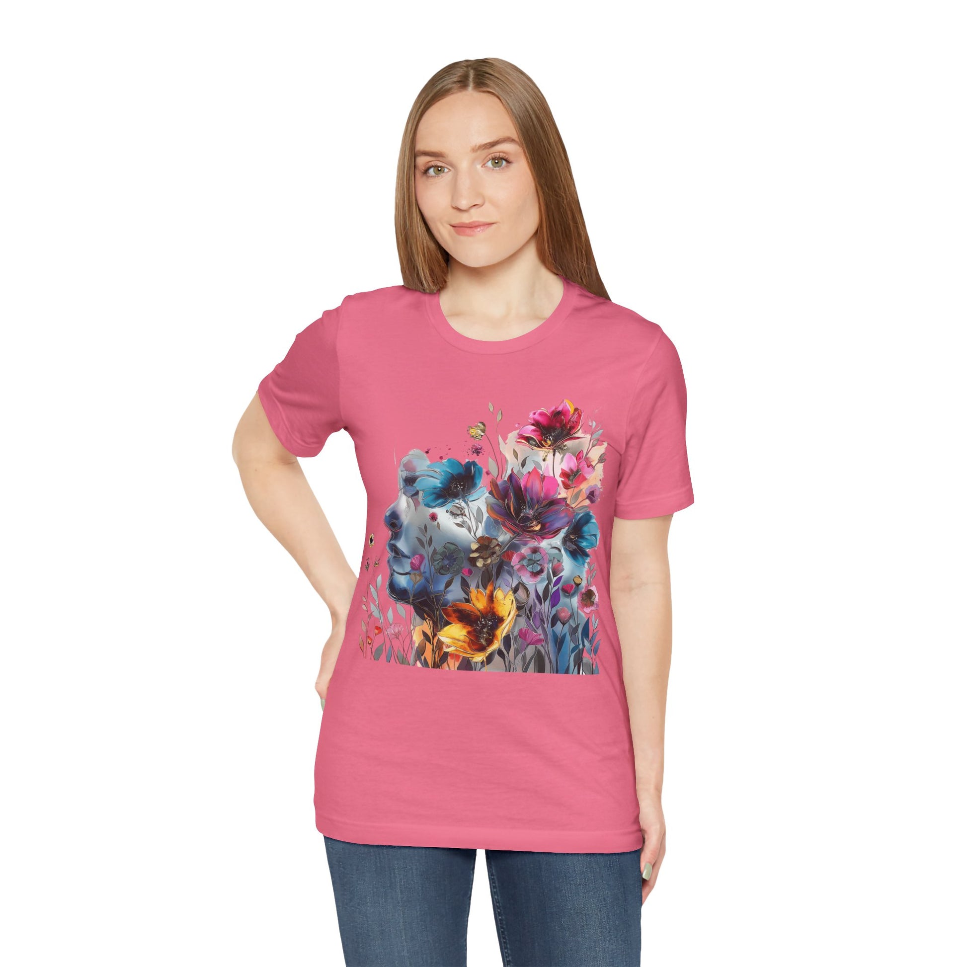 Elevate your wardrobe with our colorful painting miniature Jersey Tee a captivating watercolor illustration of a mysterious woman, featuring an attractive and inspirational design that will turn heads. Surrounding her are delicate, colorful flowers, adding a touch of vibrancy to the composition. The overall style of the illustration is reminiscent of a beautiful watercolor masterpiece, filled with soothing hues and subtle movements. Crafted from high-quality materials, this classic short-sleeved tee is comfortable for everyday wear. The vibrant colors and intricate miniature design evoke a sense of creativity and wonder, inspiring you to embrace your artistic side. Whether you're a lover of fine art or appreciate unique and eye-catching designs, this tee is the perfect choice to add a pop of inspiration to your outfit. Shop now and make a statement with our captivating watercolor illustration and beautiful colorful flowers!