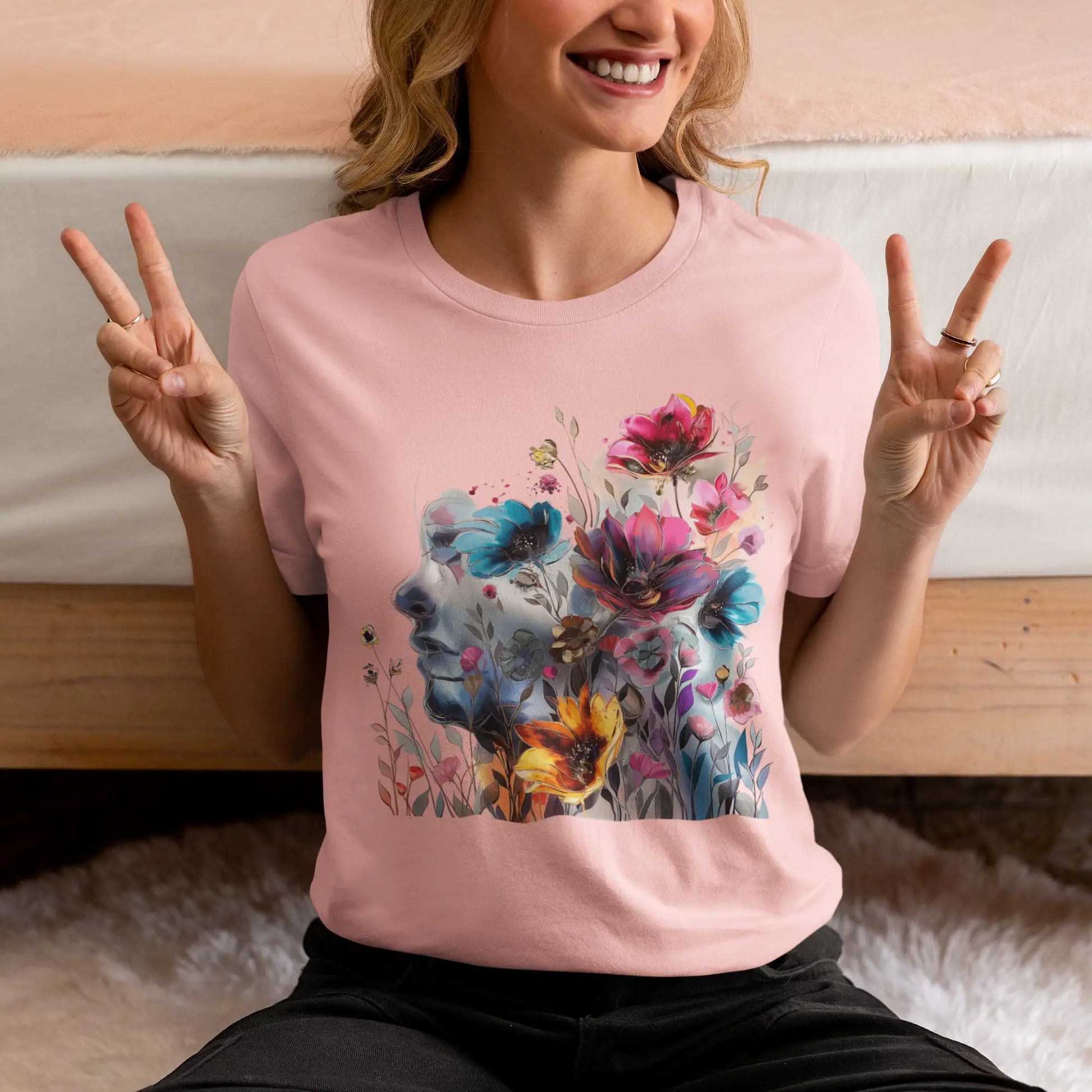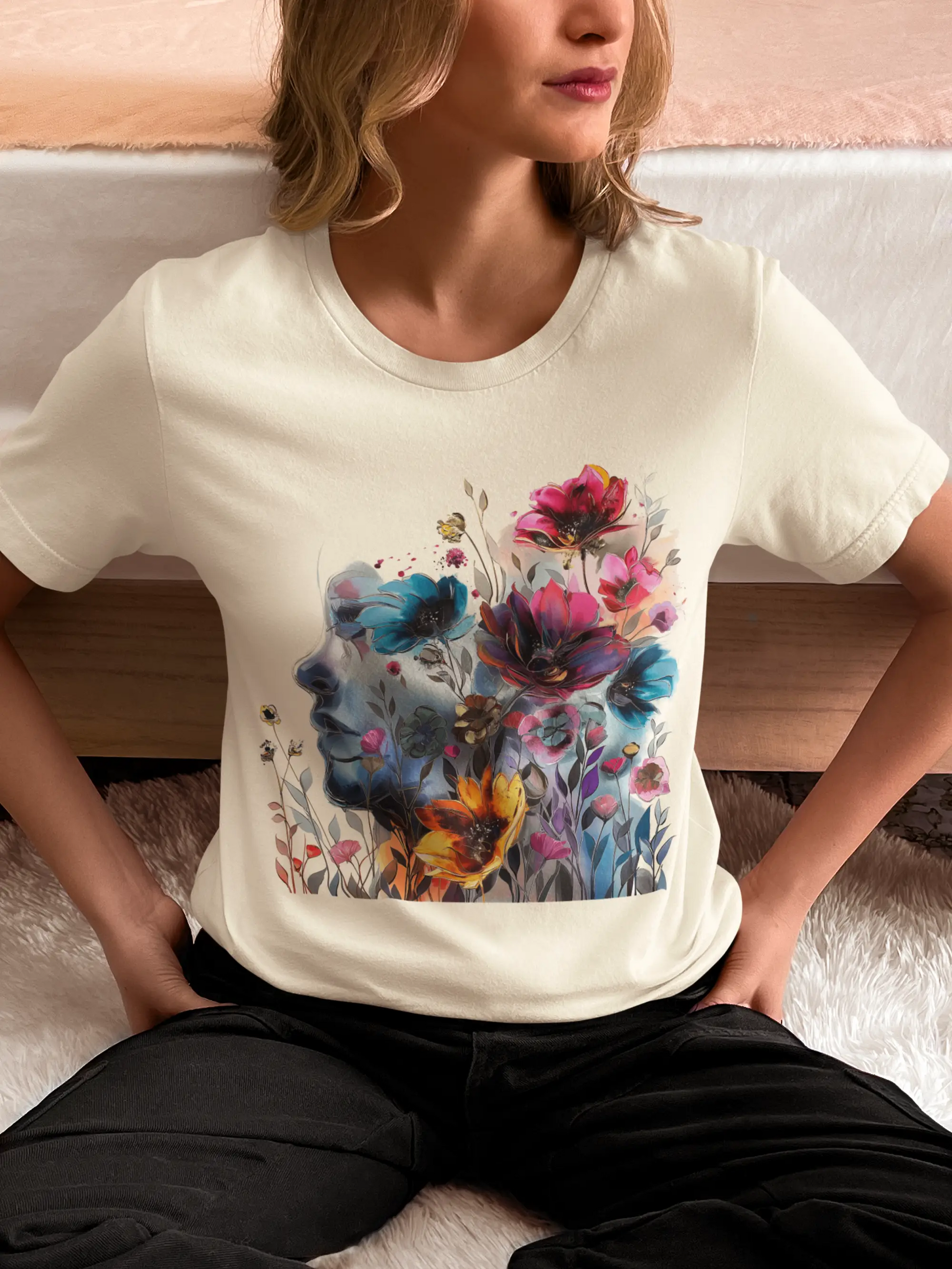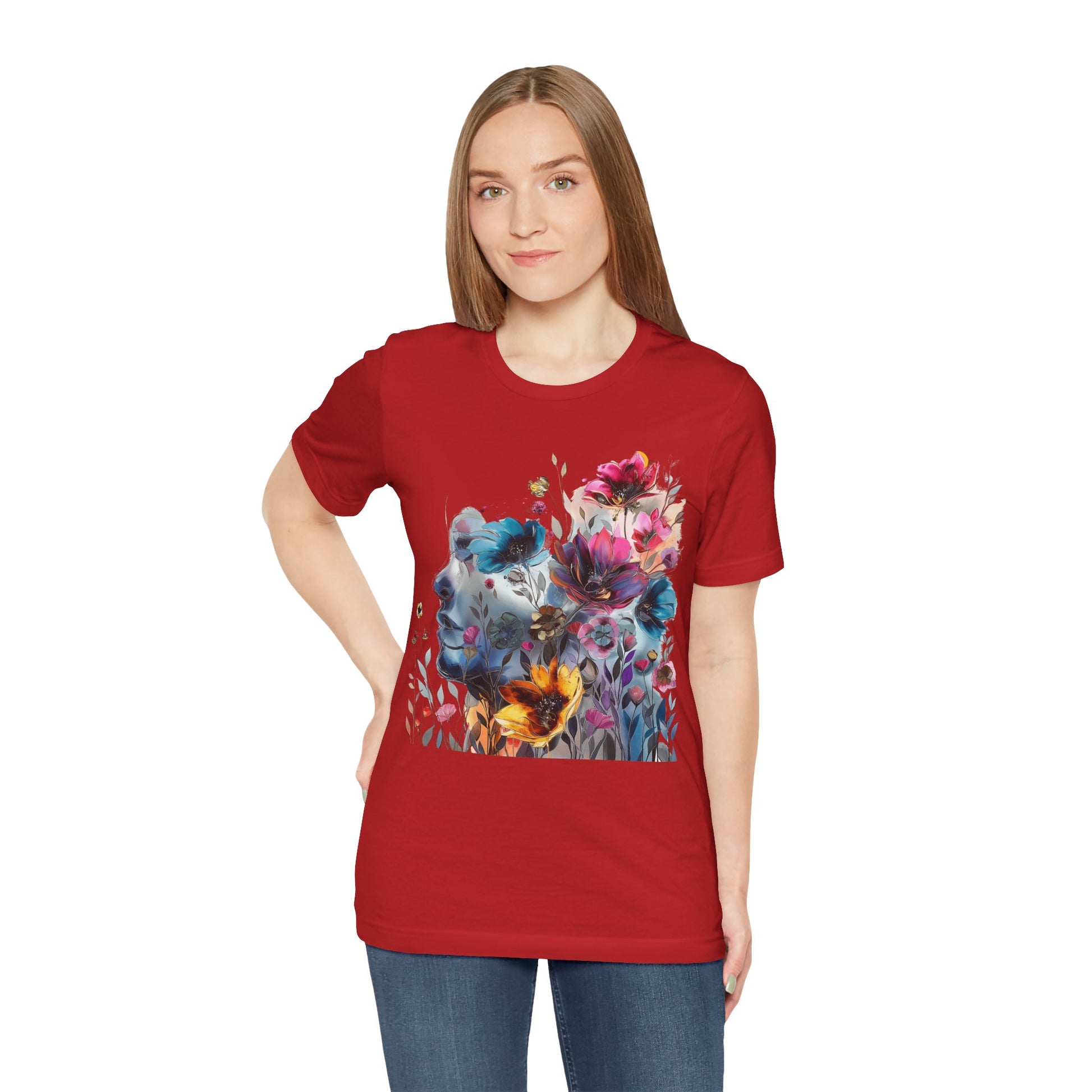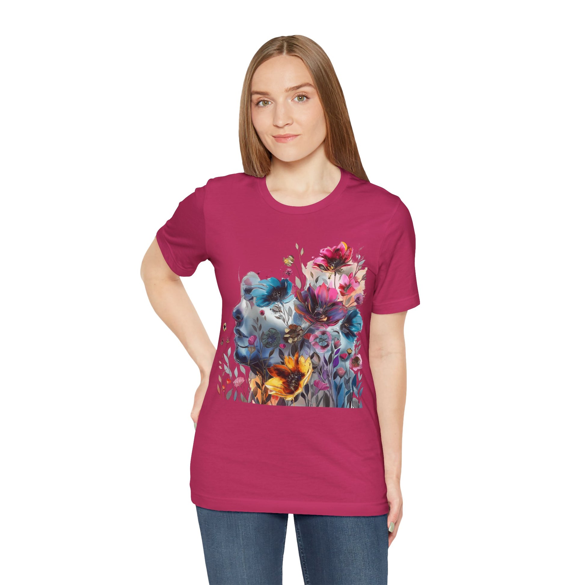 Elevate your wardrobe with our colorful painting miniature Jersey Tee a captivating watercolor illustration of a mysterious woman, featuring an attractive and inspirational design that will turn heads. Surrounding her are delicate, colorful flowers, adding a touch of vibrancy to the composition. The overall style of the illustration is reminiscent of a beautiful watercolor masterpiece, filled with soothing hues and subtle movements. Crafted from high-quality materials, this classic short-sleeved tee is comfortable for everyday wear. The vibrant colors and intricate miniature design evoke a sense of creativity and wonder, inspiring you to embrace your artistic side. Whether you're a lover of fine art or appreciate unique and eye-catching designs, this tee is the perfect choice to add a pop of inspiration to your outfit. Shop now and make a statement with our captivating watercolor illustration and beautiful colorful flowers!