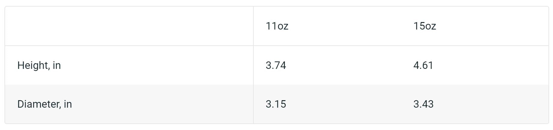 - Available in two sizes: 11oz (0.33 l) and 15oz (0.44 l)