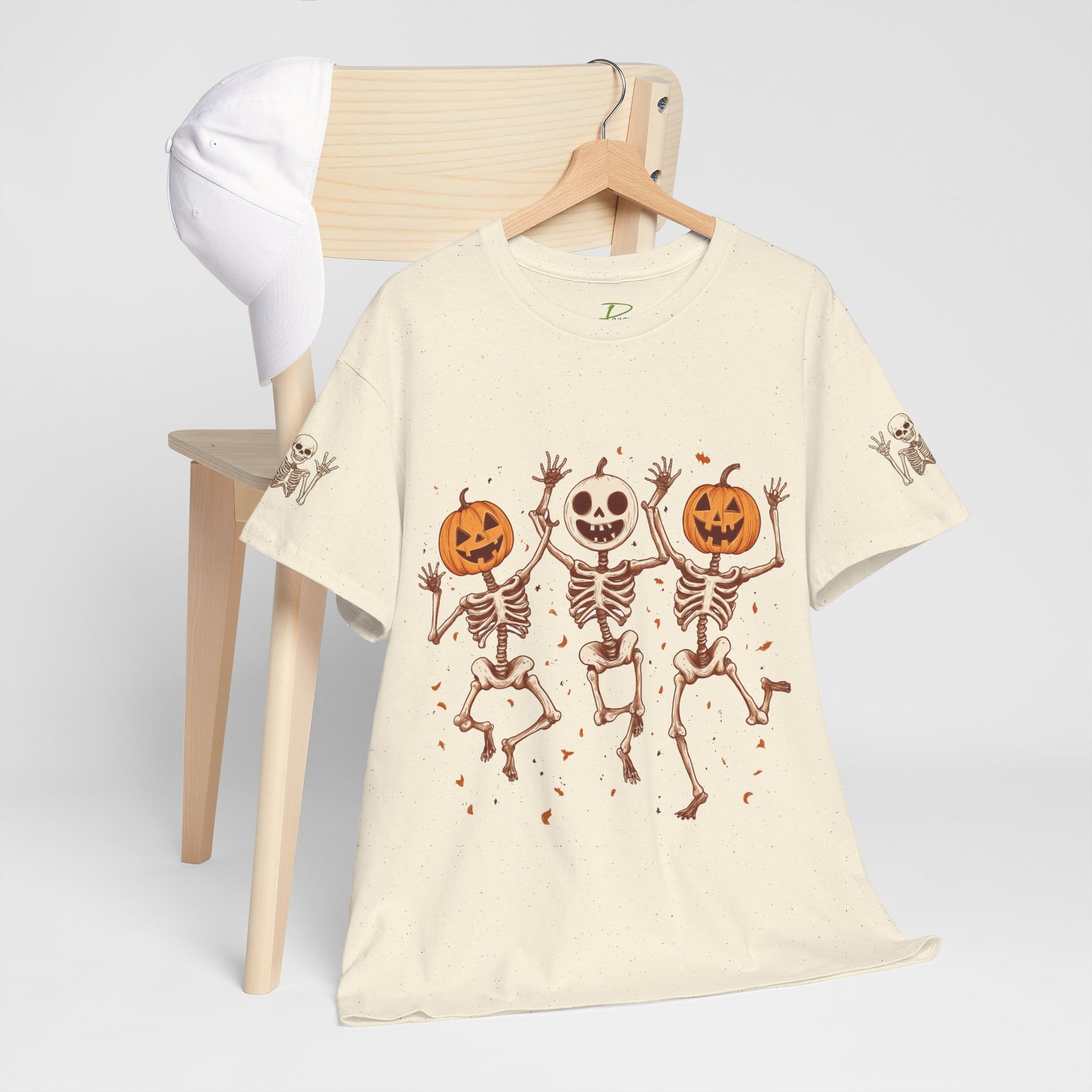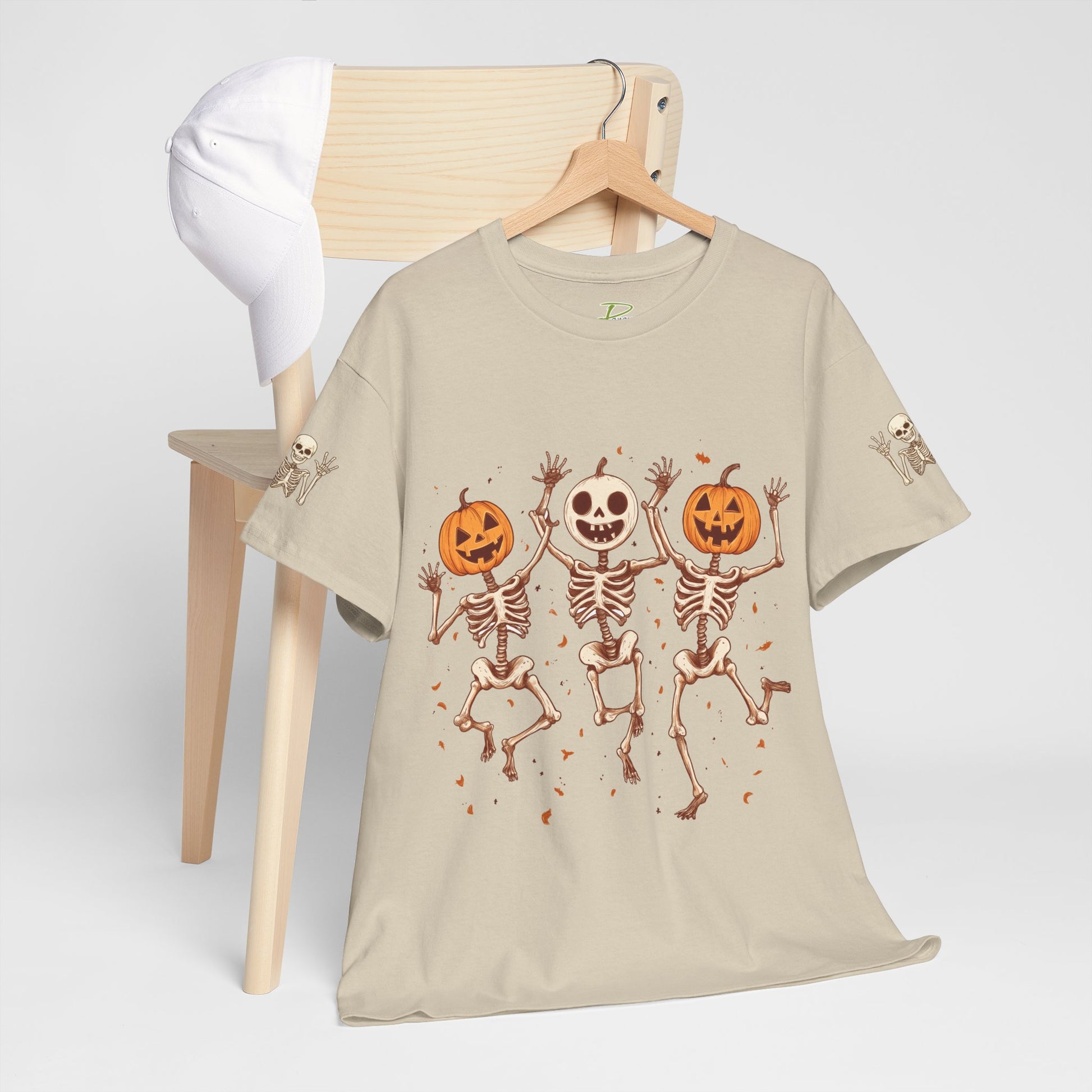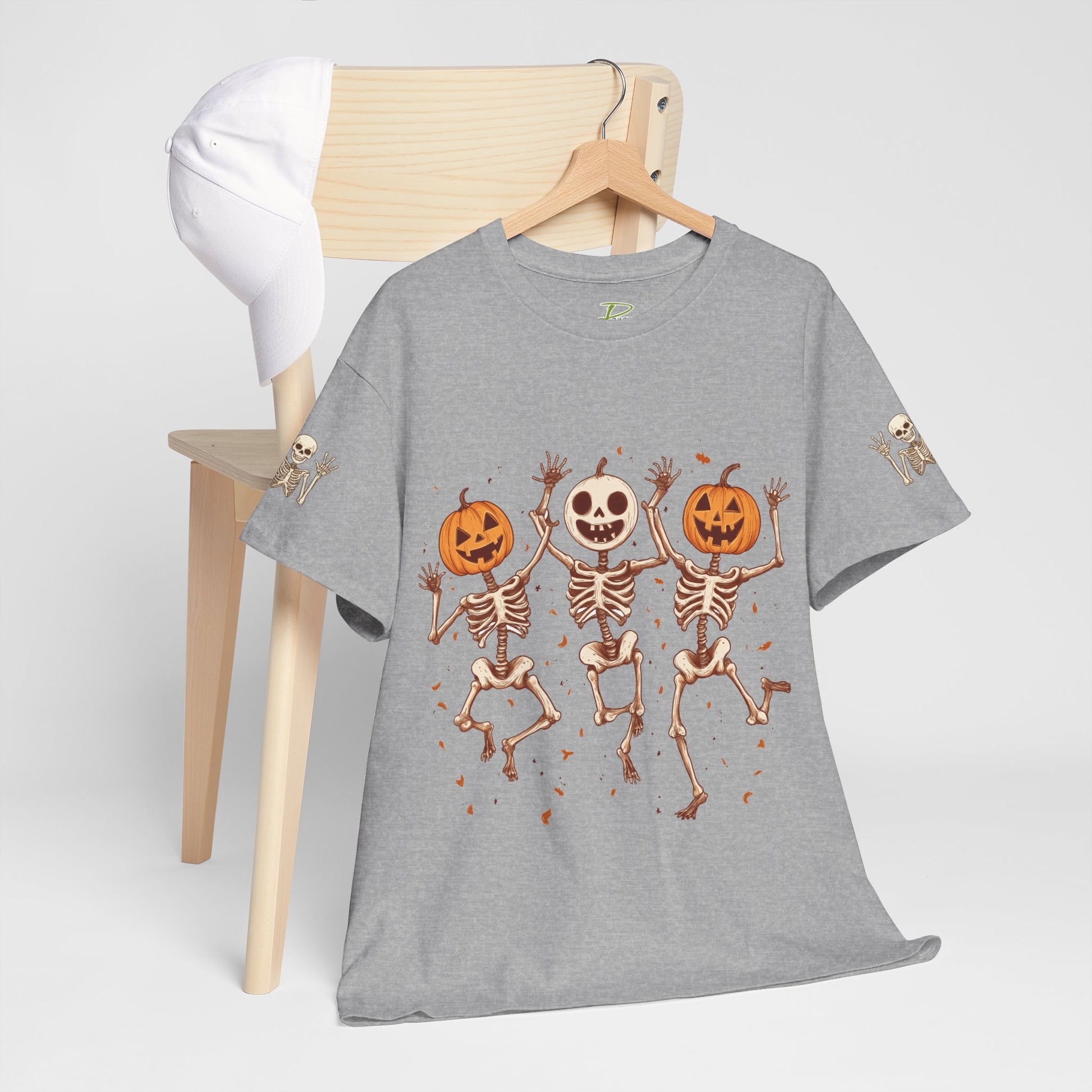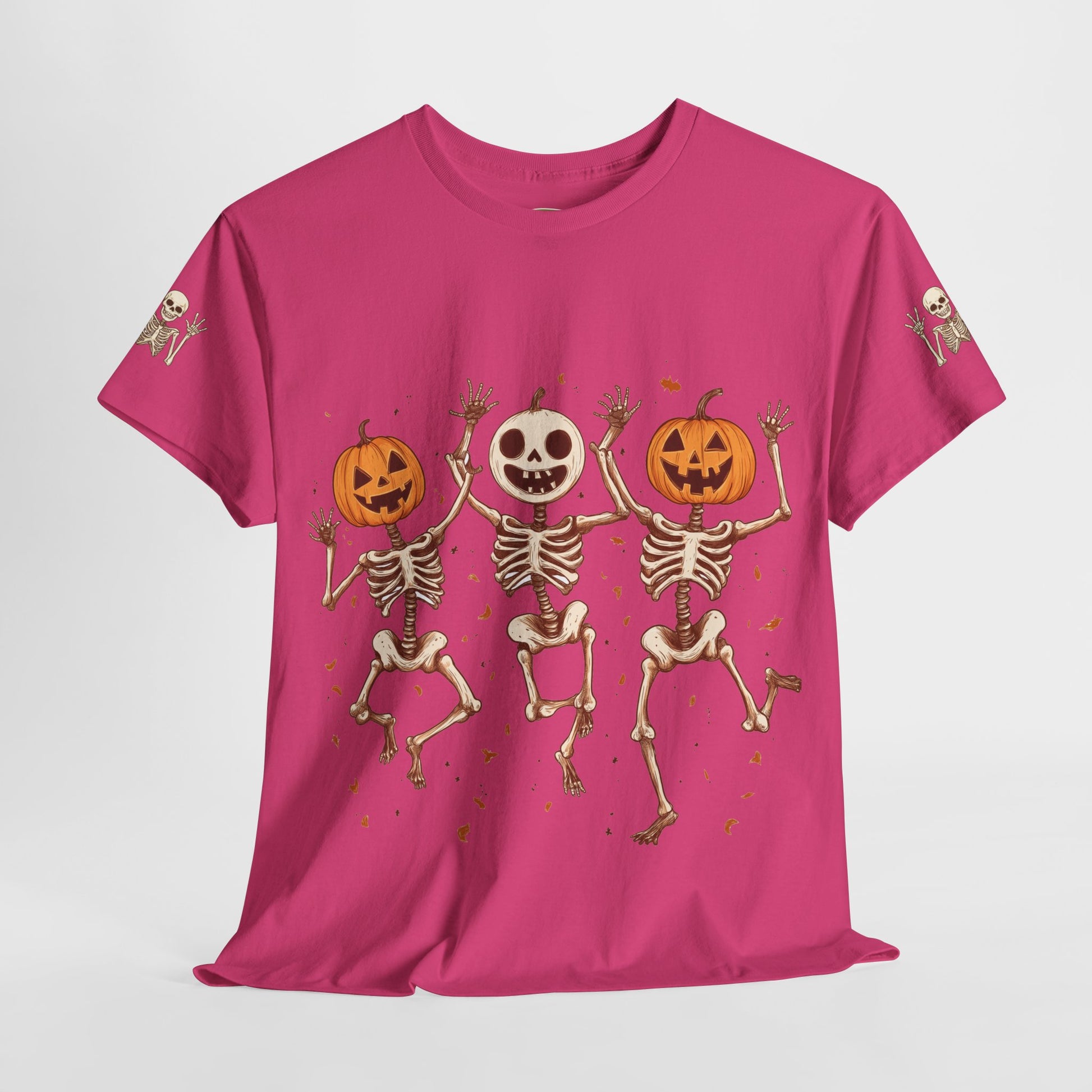 Join the Halloween party with our Unisex Heavy Cotton Tee! This t-shirt features three adorable pumpkin-head skeletons in different dance poses, adding a fun and stylish flair to your wardrobe. Whether you're going to a costume party or just enjoying a casual autumn day, this Halloween-themed tee is a must-have for trick-or-treating.