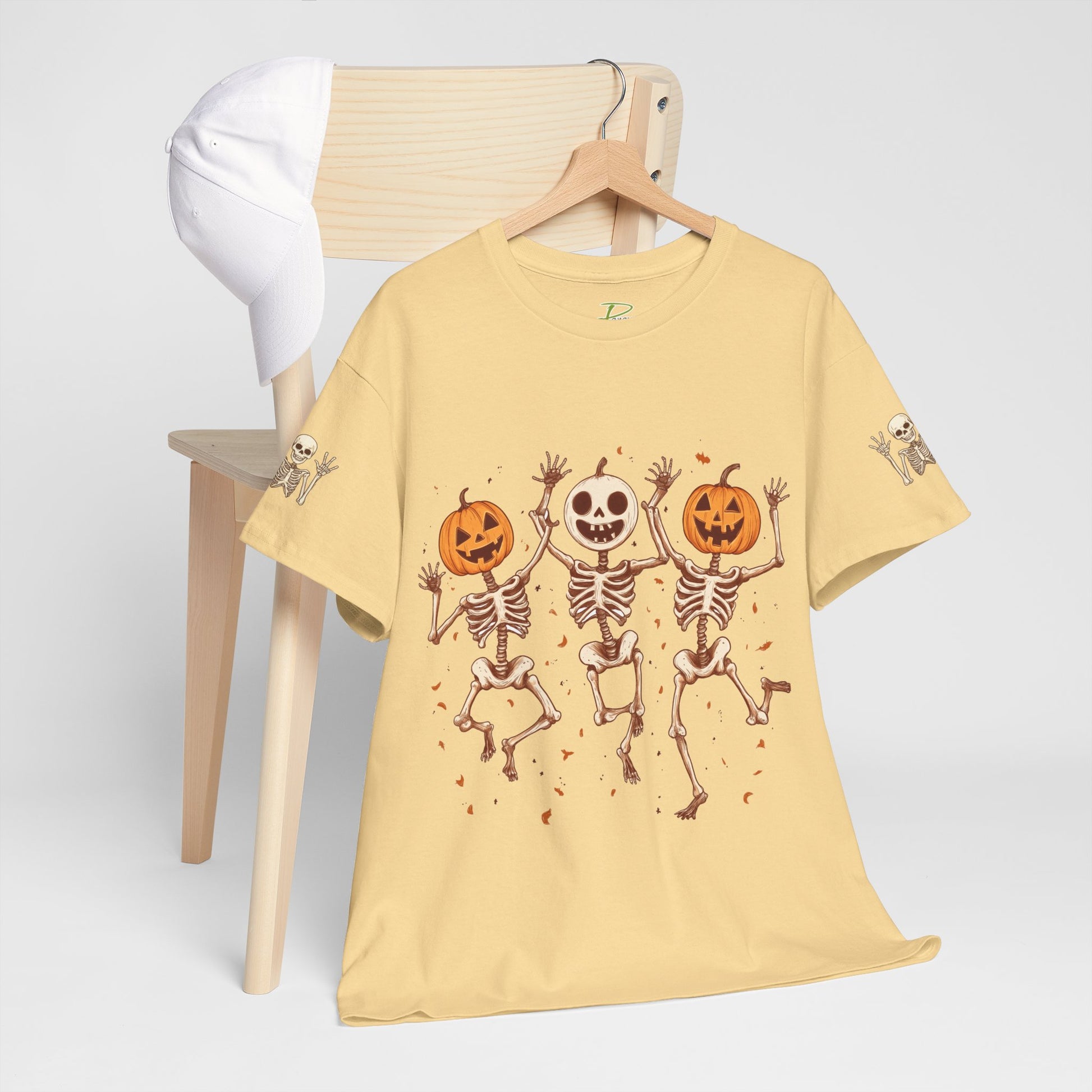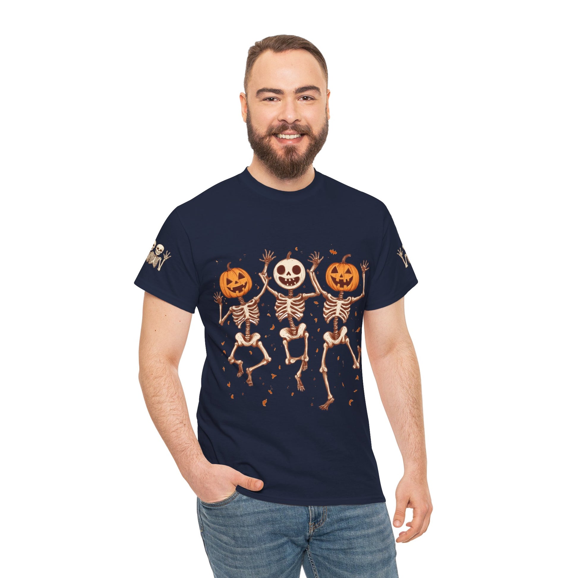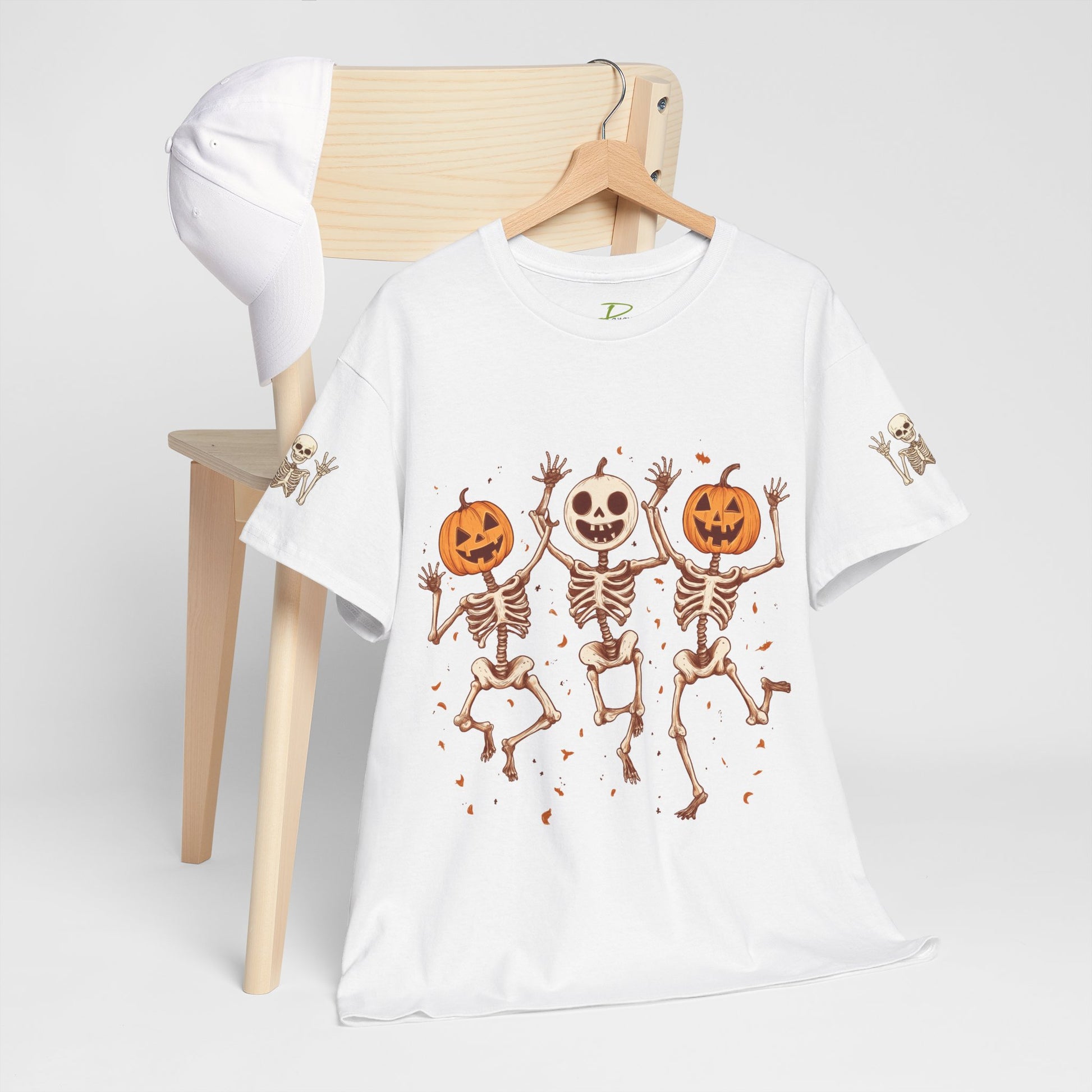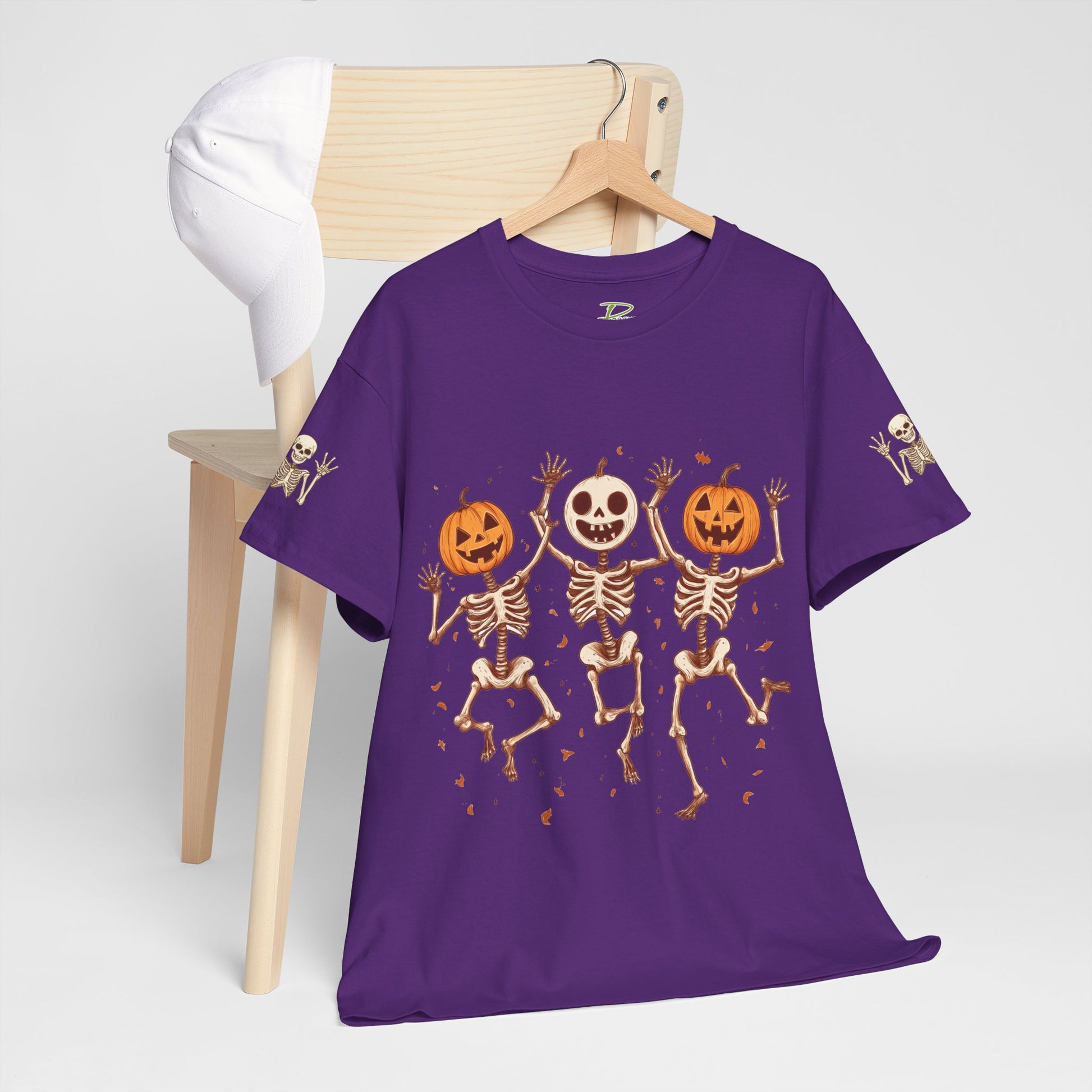 Join the Halloween party with our Unisex Heavy Cotton Tee! This t-shirt features three adorable pumpkin-head skeletons in different dance poses, adding a fun and stylish flair to your wardrobe. Whether you're going to a costume party or just enjoying a casual autumn day, this Halloween-themed tee is a must-have for trick-or-treating.