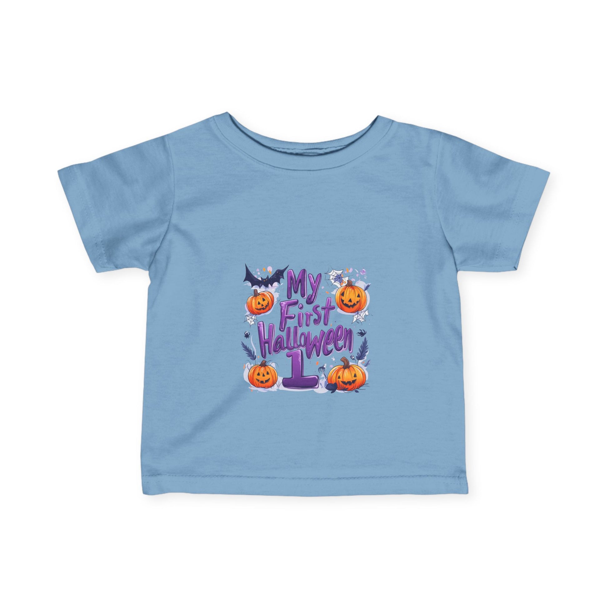 Celebrate your baby's first Halloween in style with our Infant Fine Jersey Tee, featuring a vibrant, kid-friendly cartoon design and the words "My First Halloween" making it the perfect outfit for your little one's first trick-or-treating adventure.