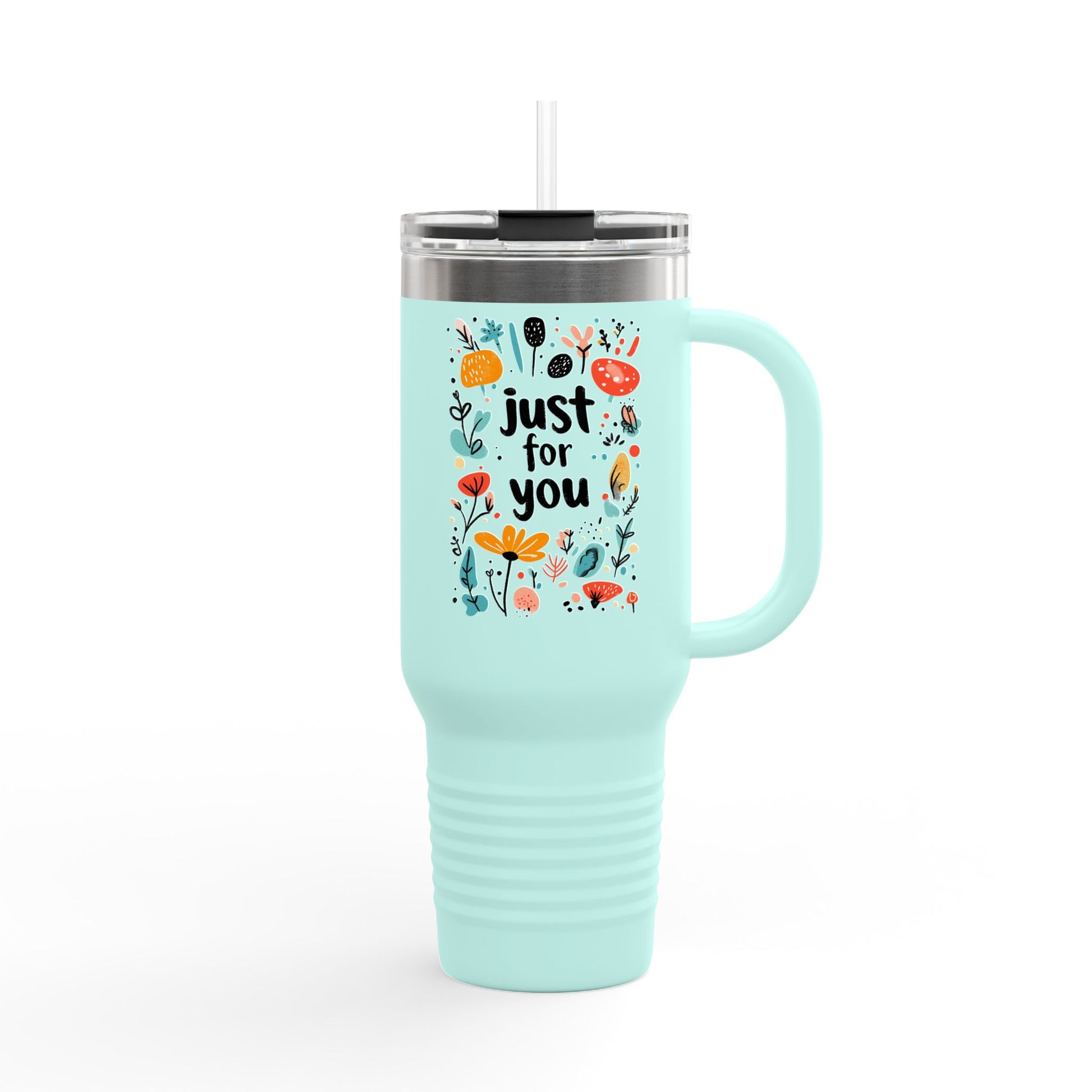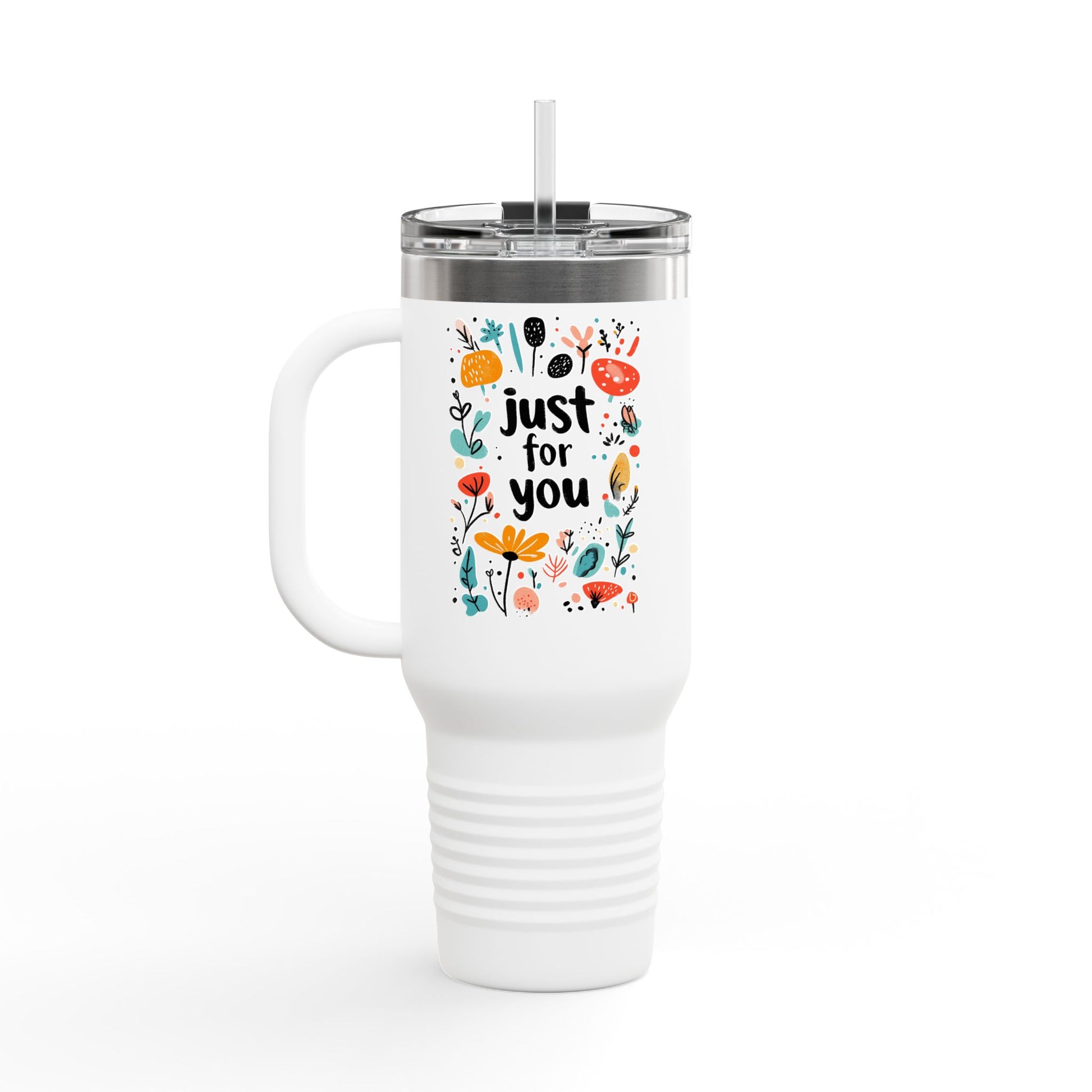 This 40oz insulated travel mug is the perfect gift for a loved one or a treat for yourself. It features a vibrant floral design and the words "just for you" written in bold black letters. The mug is made with durable stainless steel and features double-wall vacuum insulation to keep your drinks hot or cold for hours. The leak-proof lid and comfortable handle make it perfect for on-the-go adventures or enjoying a beverage at home.