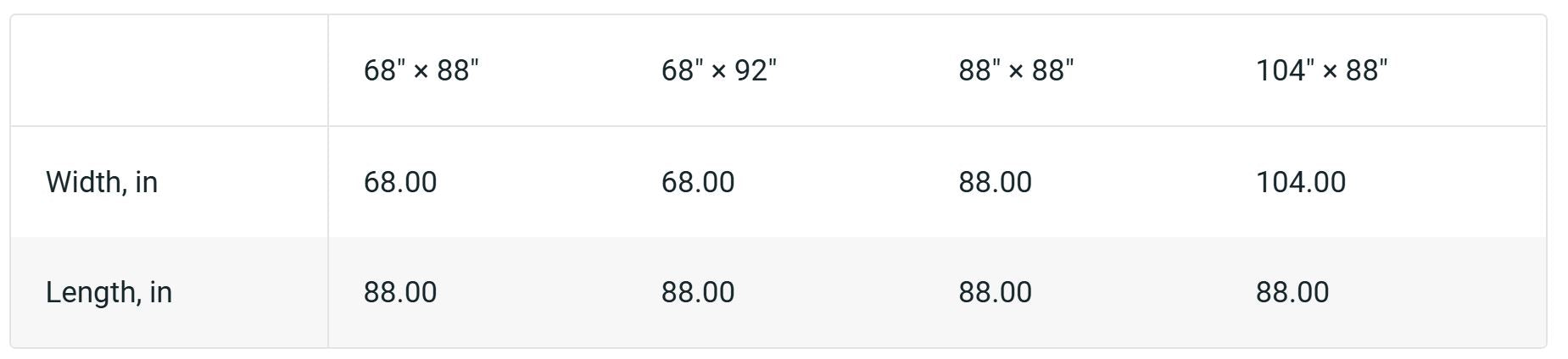 - Available in 4 sizes: 68" × 92", 88" × 88", 104" × 88", and 68" × 88"