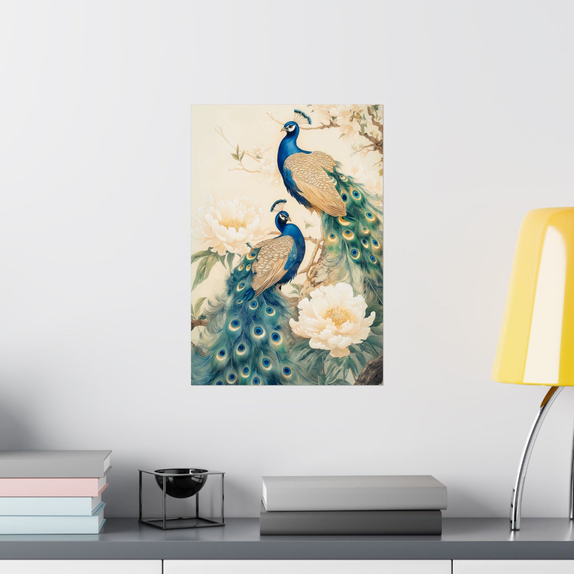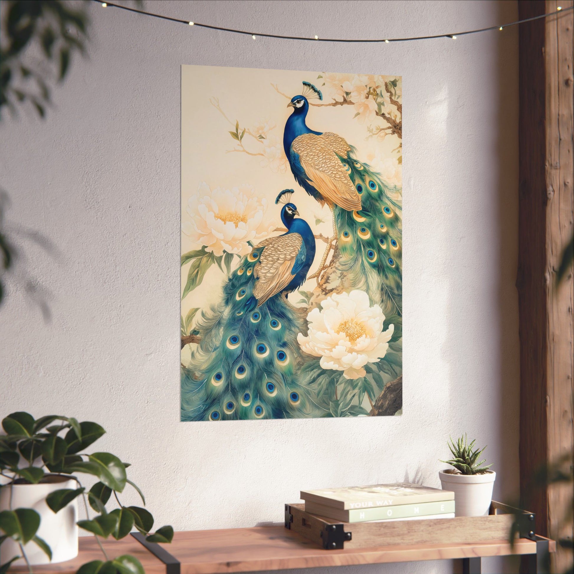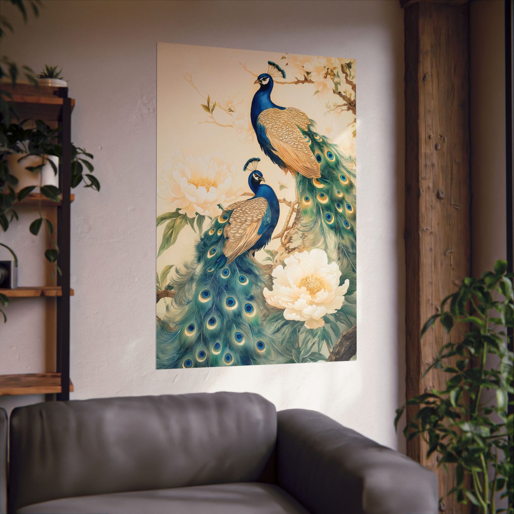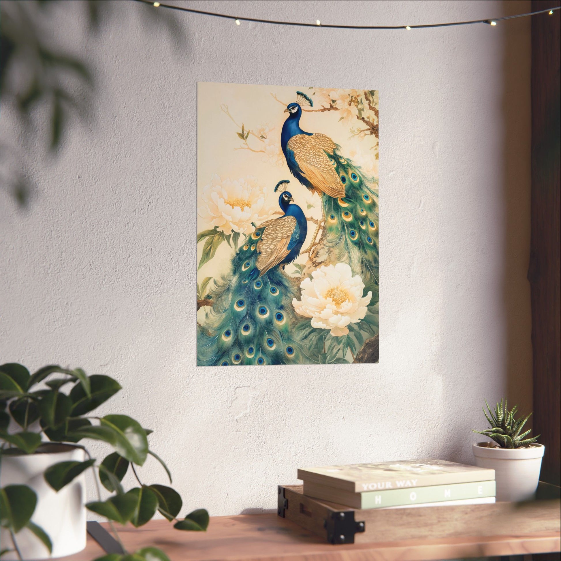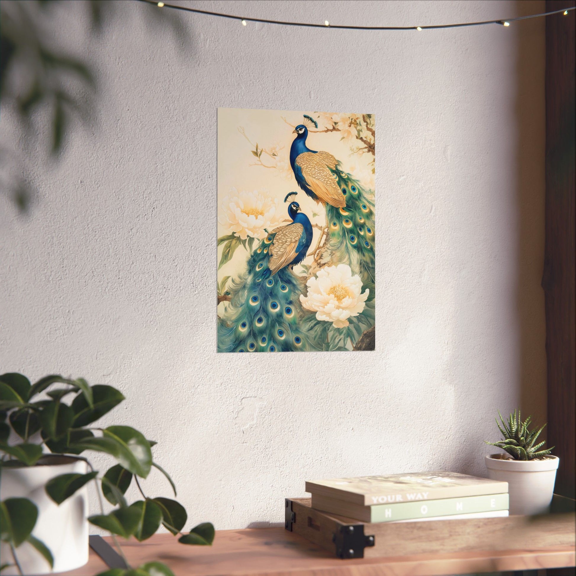 Elevate your home décor with our Matte Vertical Peacocks Posters, a stunning piece of wall art that captures the regal beauty and vibrant colors of peacocks in a modern, artistic design. These elegant print posters feature two majestic peacocks in a vertical orientation, their feathers displayed in intricate detail against a subtle background, adding a touch of sophistication and charm to any room. These custom posters, made with museum-grade paper, translate any digital artwork into exquisite real-life décor.