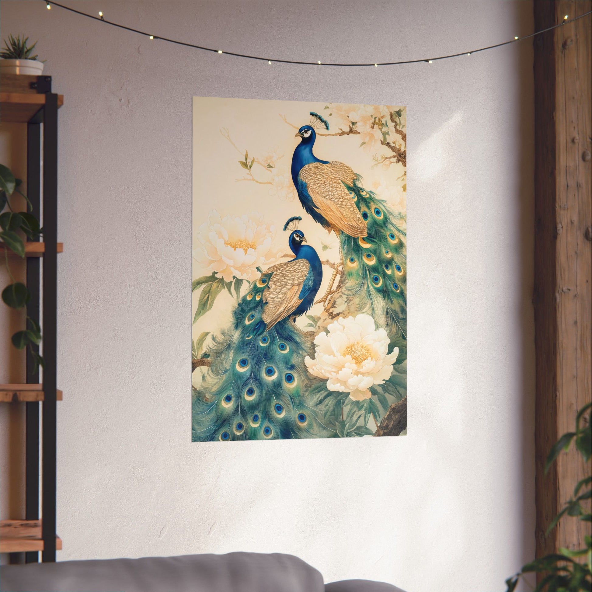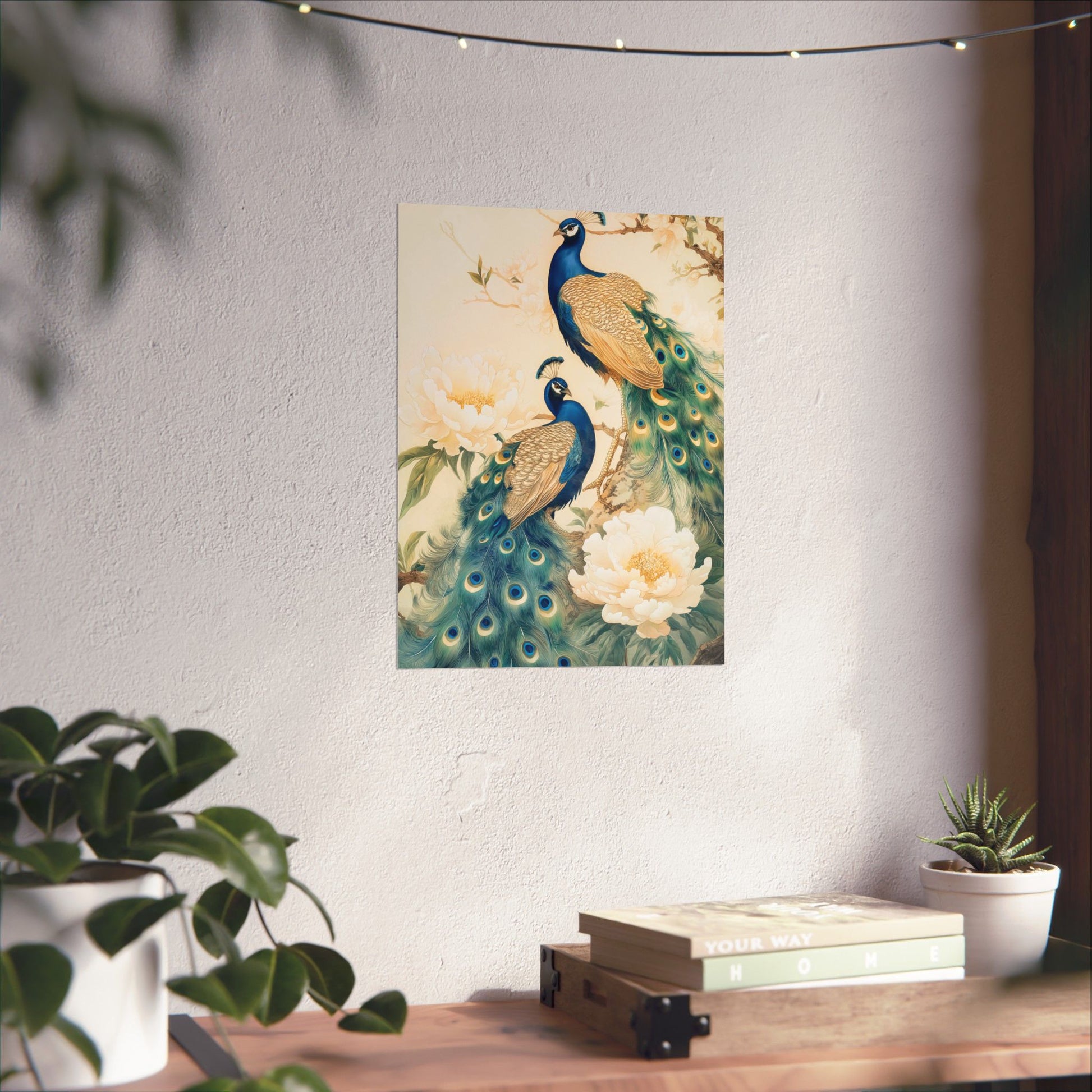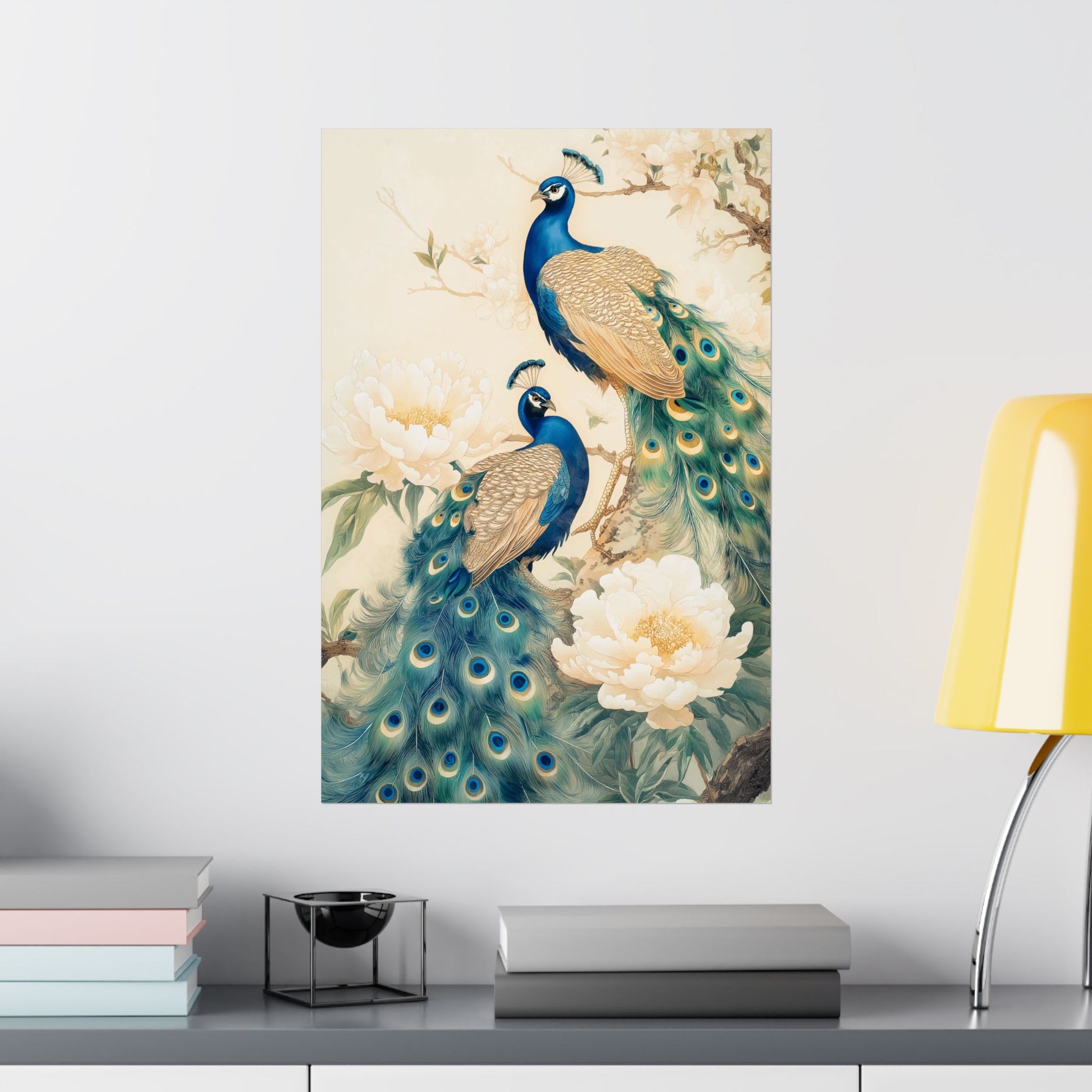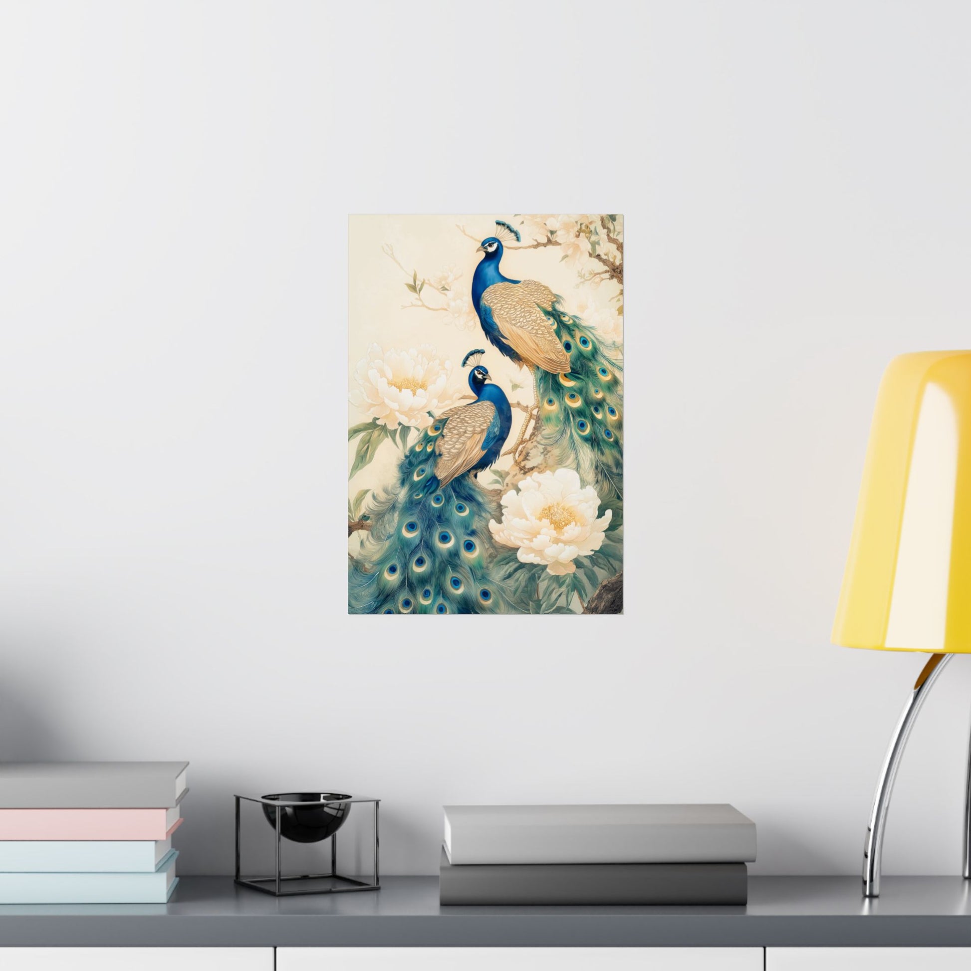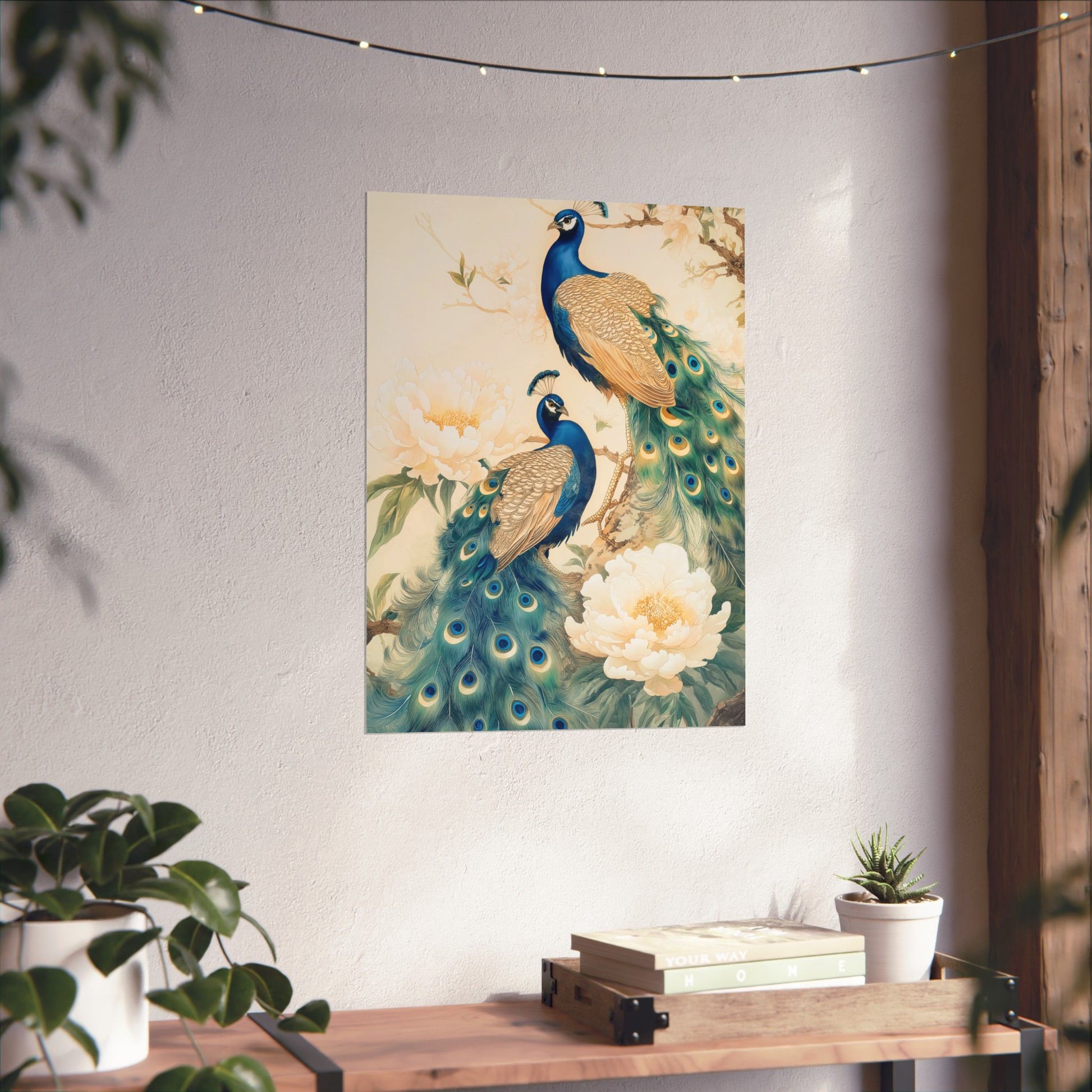 Elevate your home décor with our Matte Vertical Peacocks Posters, a stunning piece of wall art that captures the regal beauty and vibrant colors of peacocks in a modern, artistic design. These elegant print posters feature two majestic peacocks in a vertical orientation, their feathers displayed in intricate detail against a subtle background, adding a touch of sophistication and charm to any room. These custom posters, made with museum-grade paper, translate any digital artwork into exquisite real-life décor.