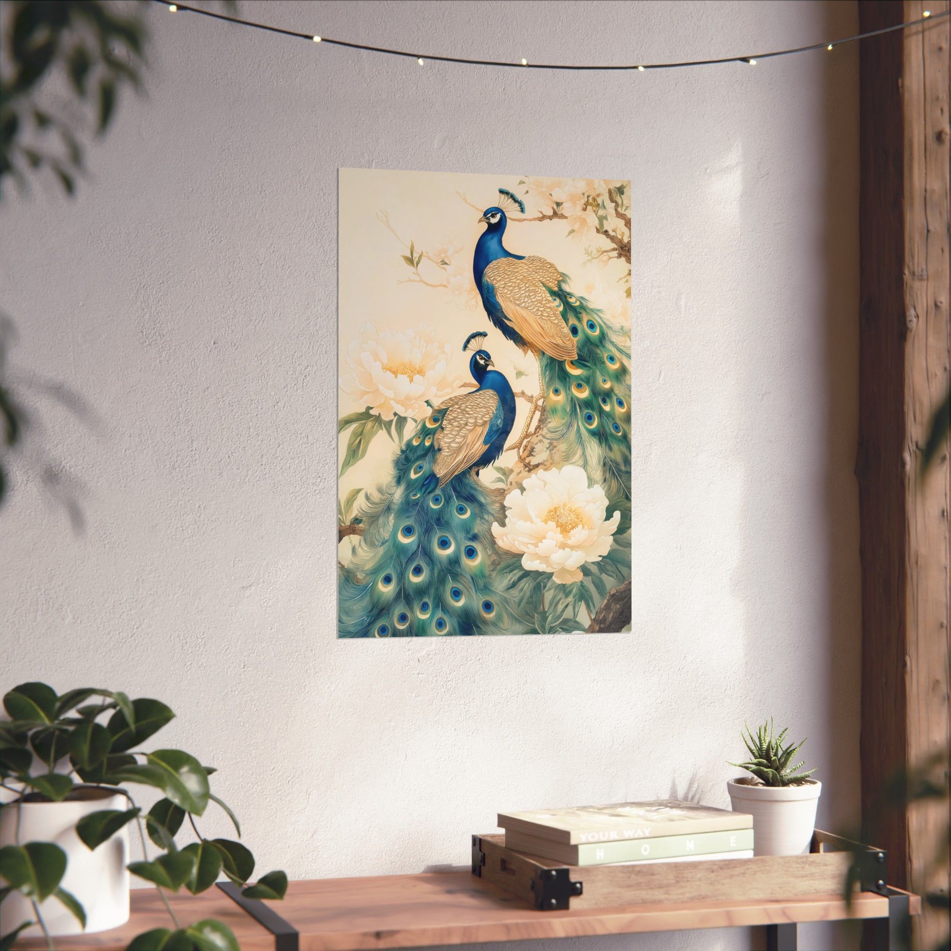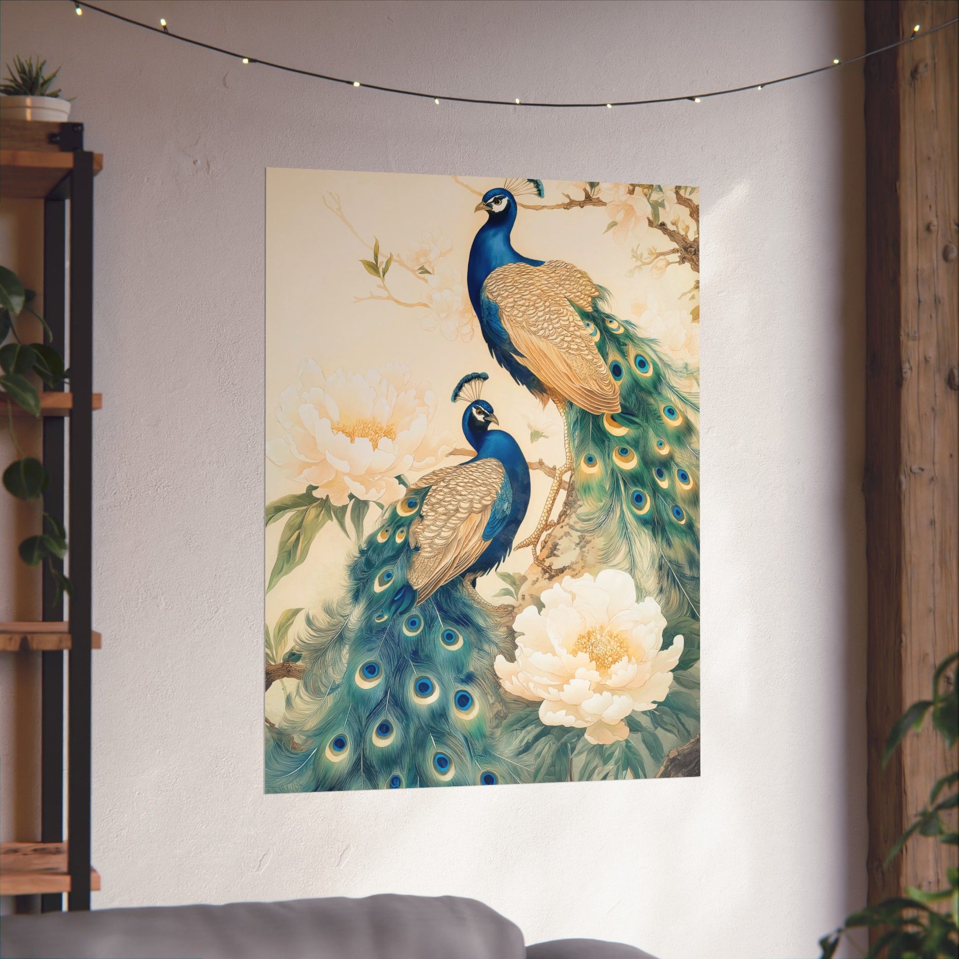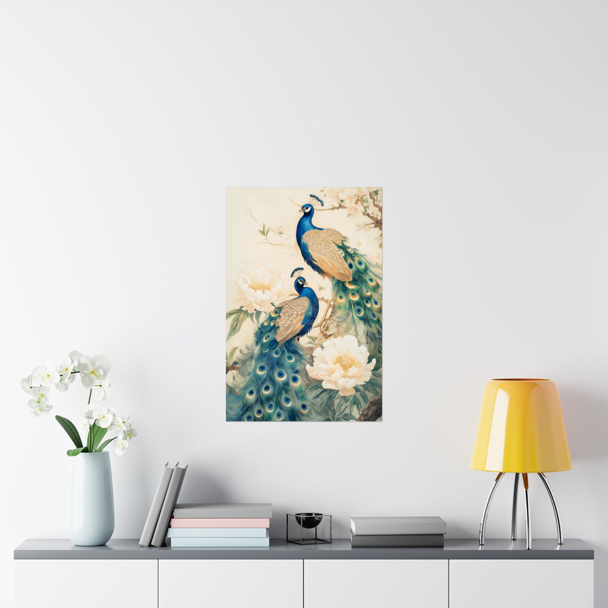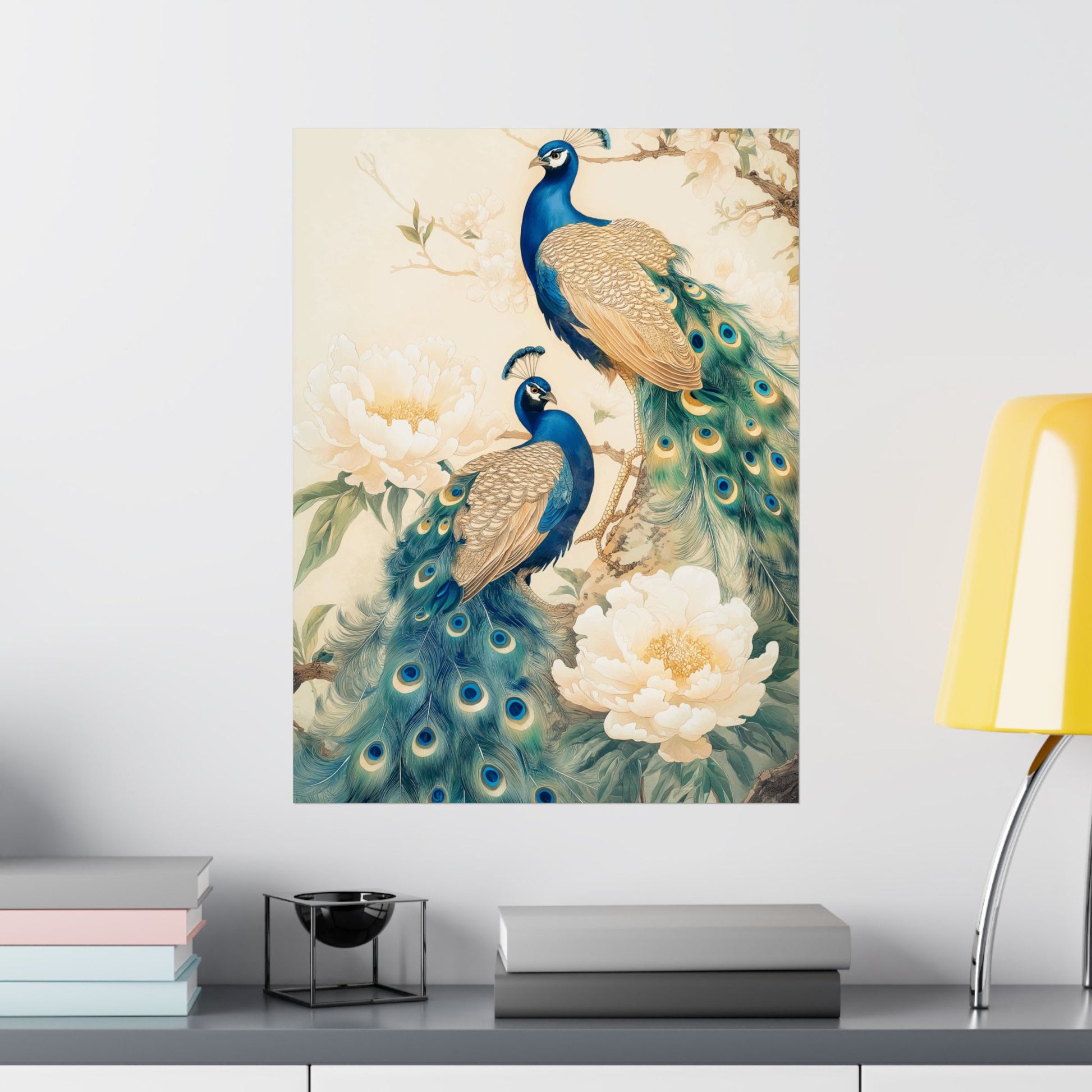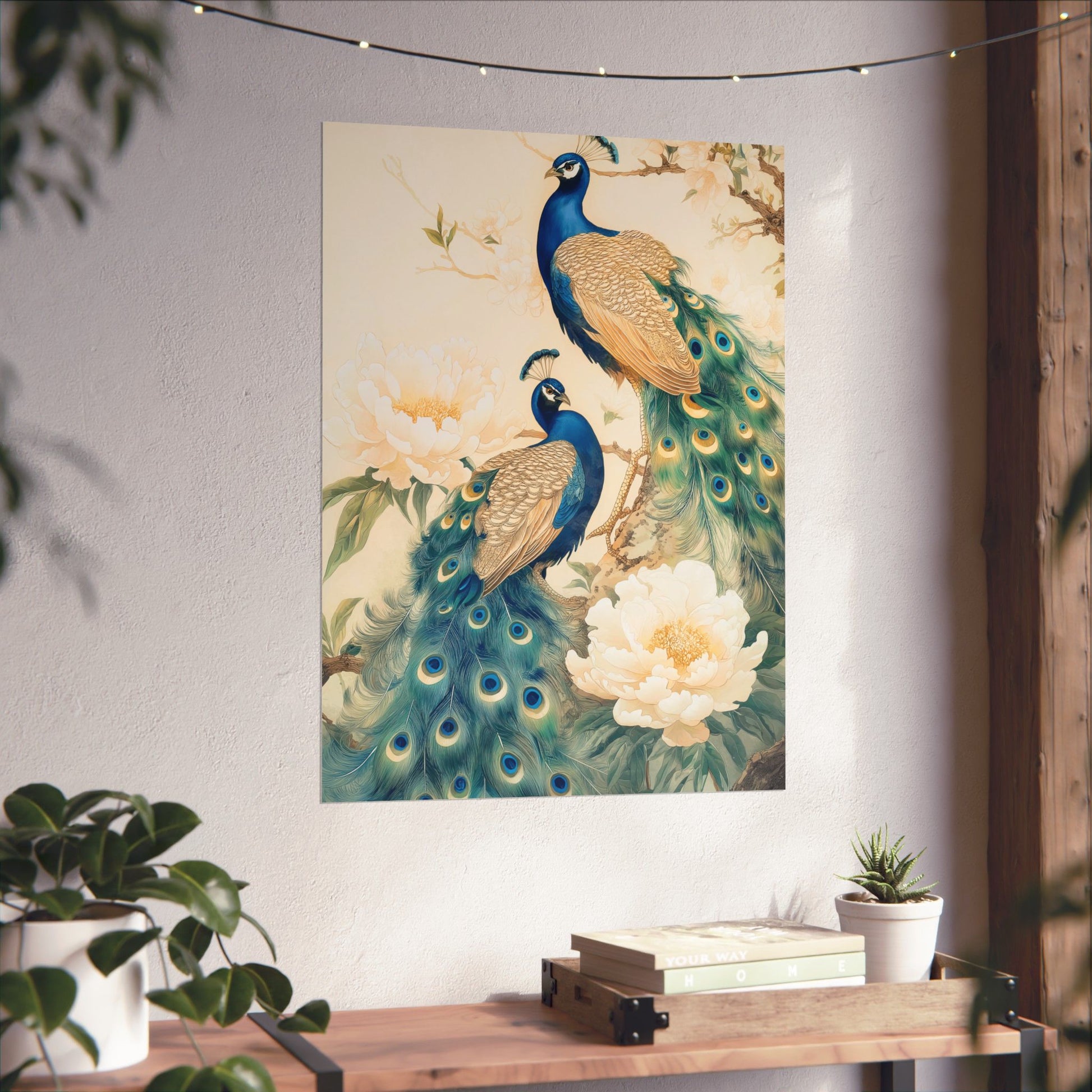 Elevate your home décor with our Matte Vertical Peacocks Posters, a stunning piece of wall art that captures the regal beauty and vibrant colors of peacocks in a modern, artistic design. These elegant print posters feature two majestic peacocks in a vertical orientation, their feathers displayed in intricate detail against a subtle background, adding a touch of sophistication and charm to any room. These custom posters, made with museum-grade paper, translate any digital artwork into exquisite real-life décor.