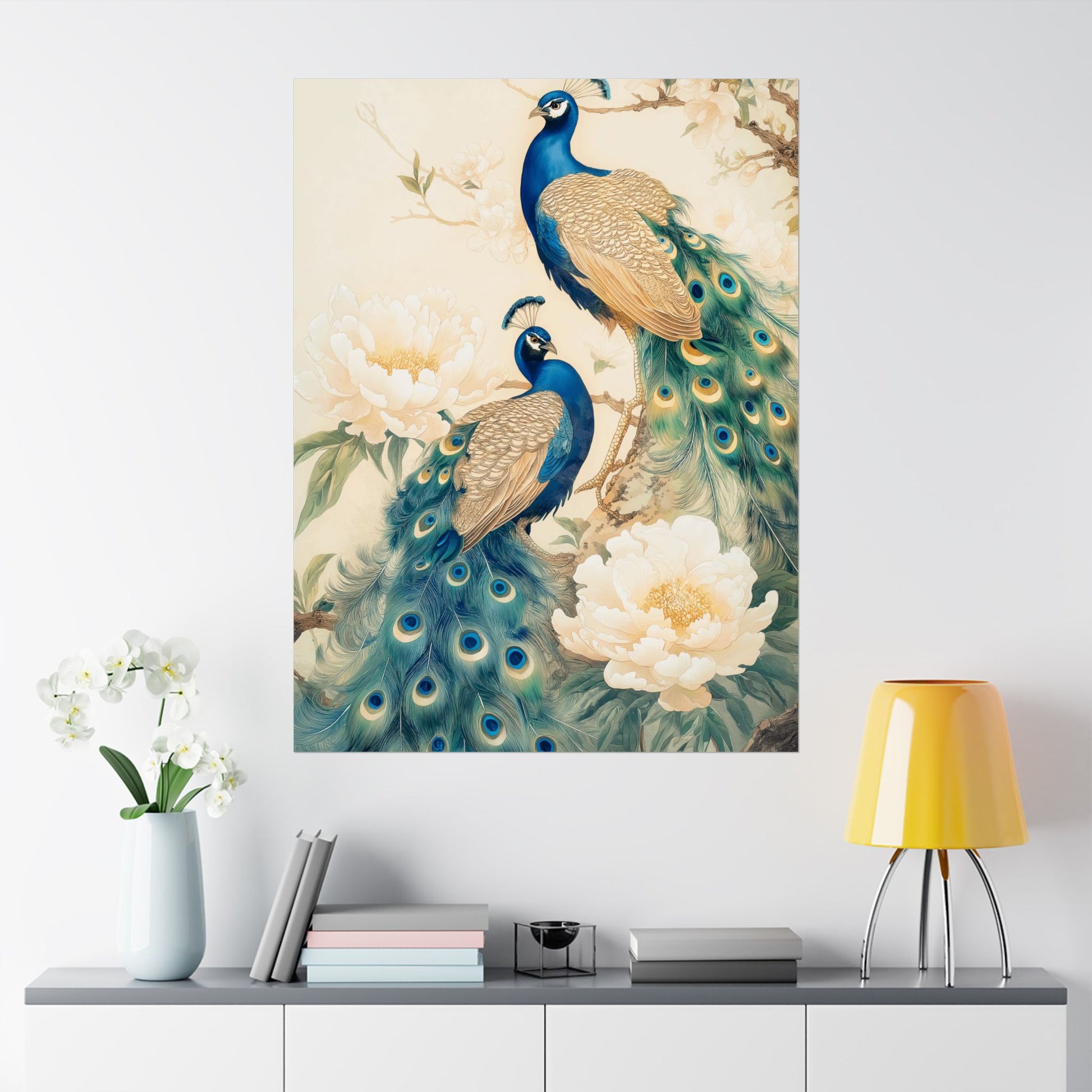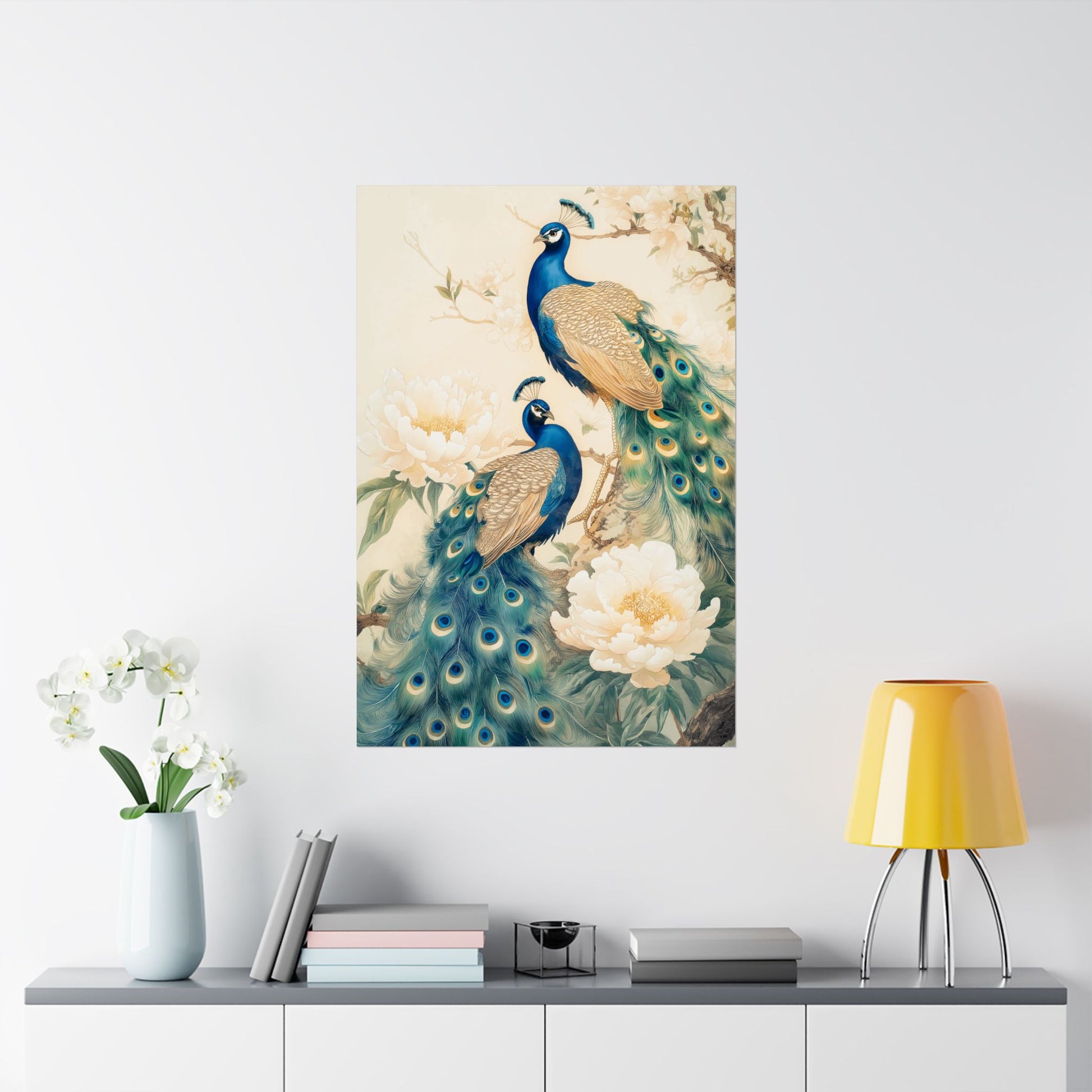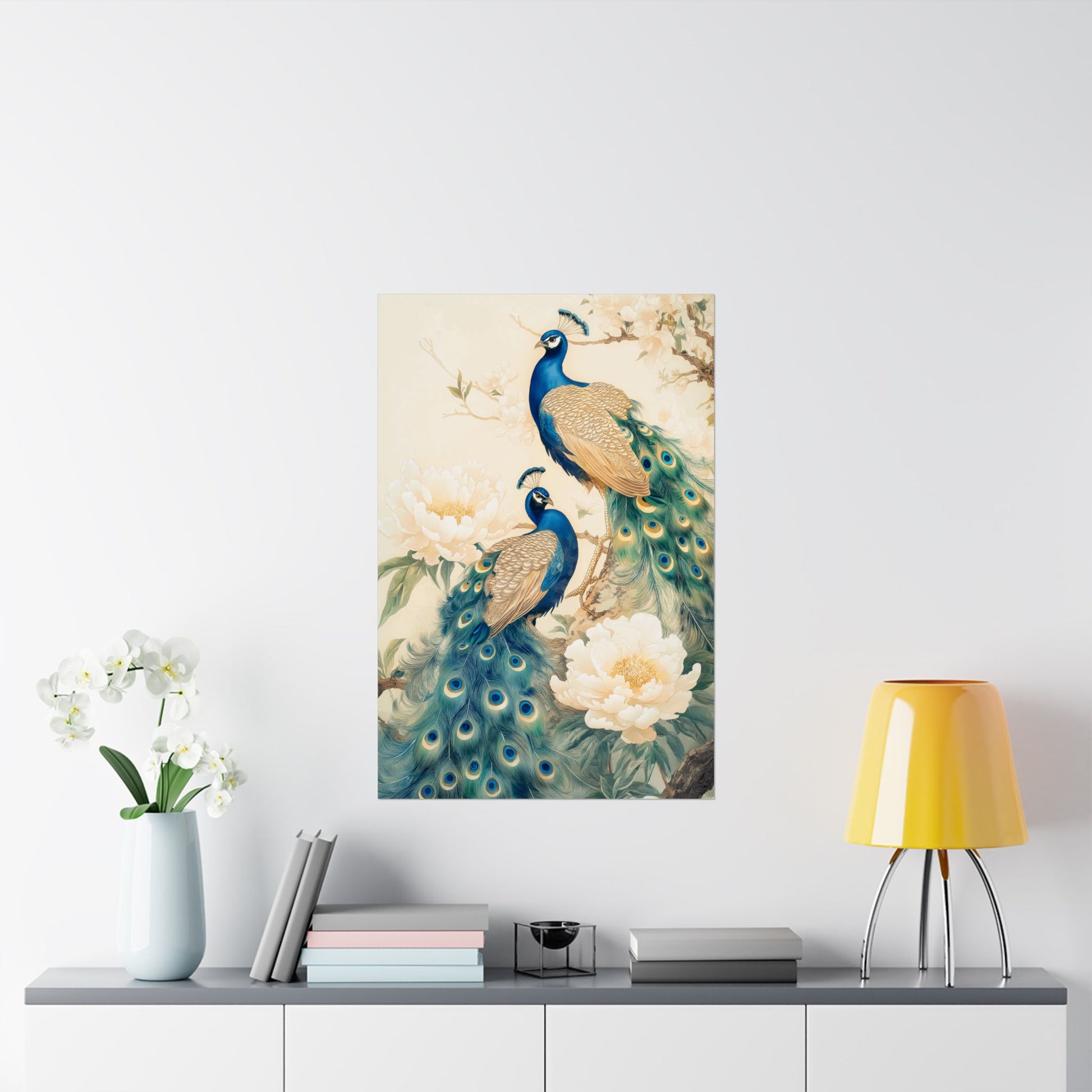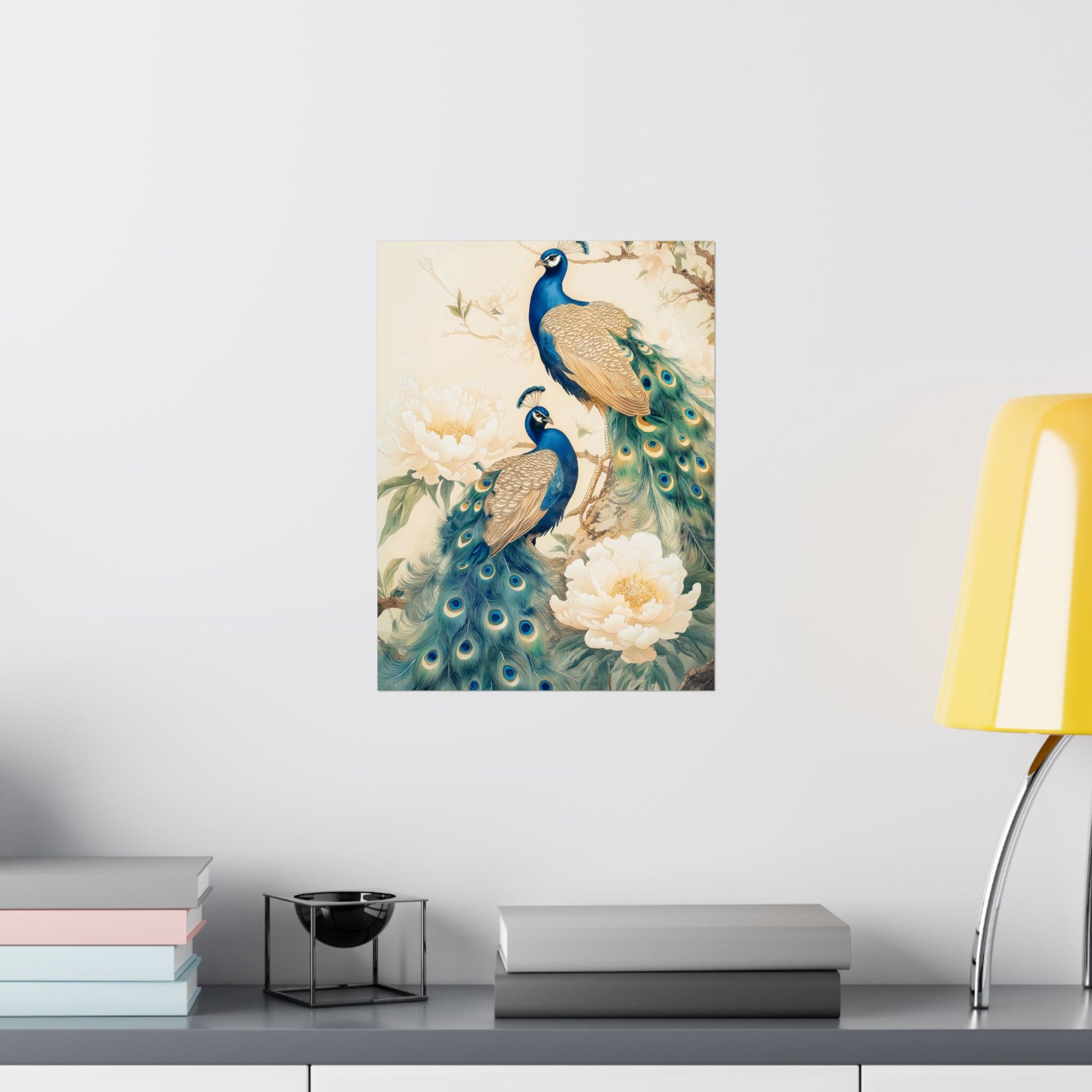 Elevate your home décor with our Matte Vertical Peacocks Posters, a stunning piece of wall art that captures the regal beauty and vibrant colors of peacocks in a modern, artistic design. These elegant print posters feature two majestic peacocks in a vertical orientation, their feathers displayed in intricate detail against a subtle background, adding a touch of sophistication and charm to any room. These custom posters, made with museum-grade paper, translate any digital artwork into exquisite real-life décor.