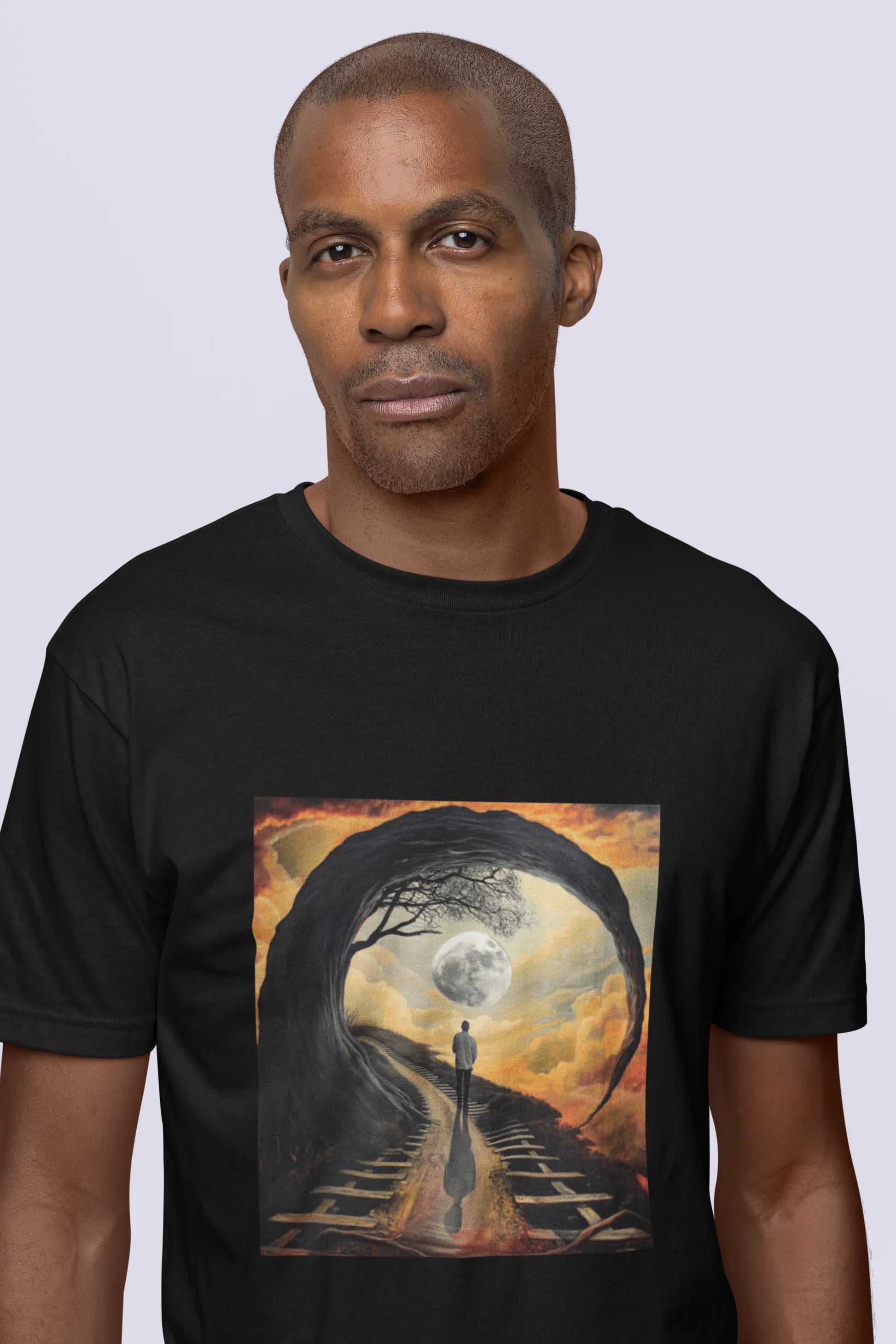 Explore the allure of the night with our Men's Cotton Crew Tee featuring a captivating Moonlit Tunnel Path design. This stunning moonlit tee showcases a serene nighttime scene of a tunnel path illuminated by the soft glow of the moon, evoking a sense of mystery, adventure, and tranquility.