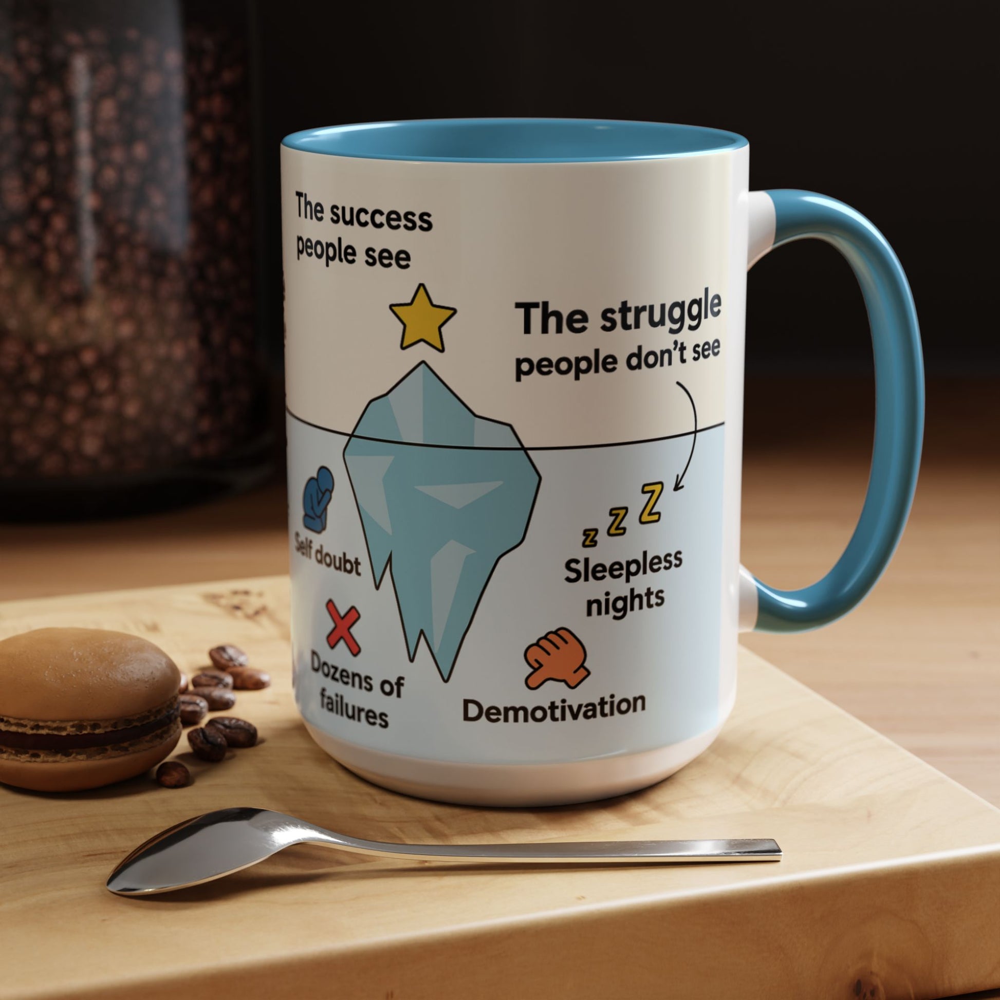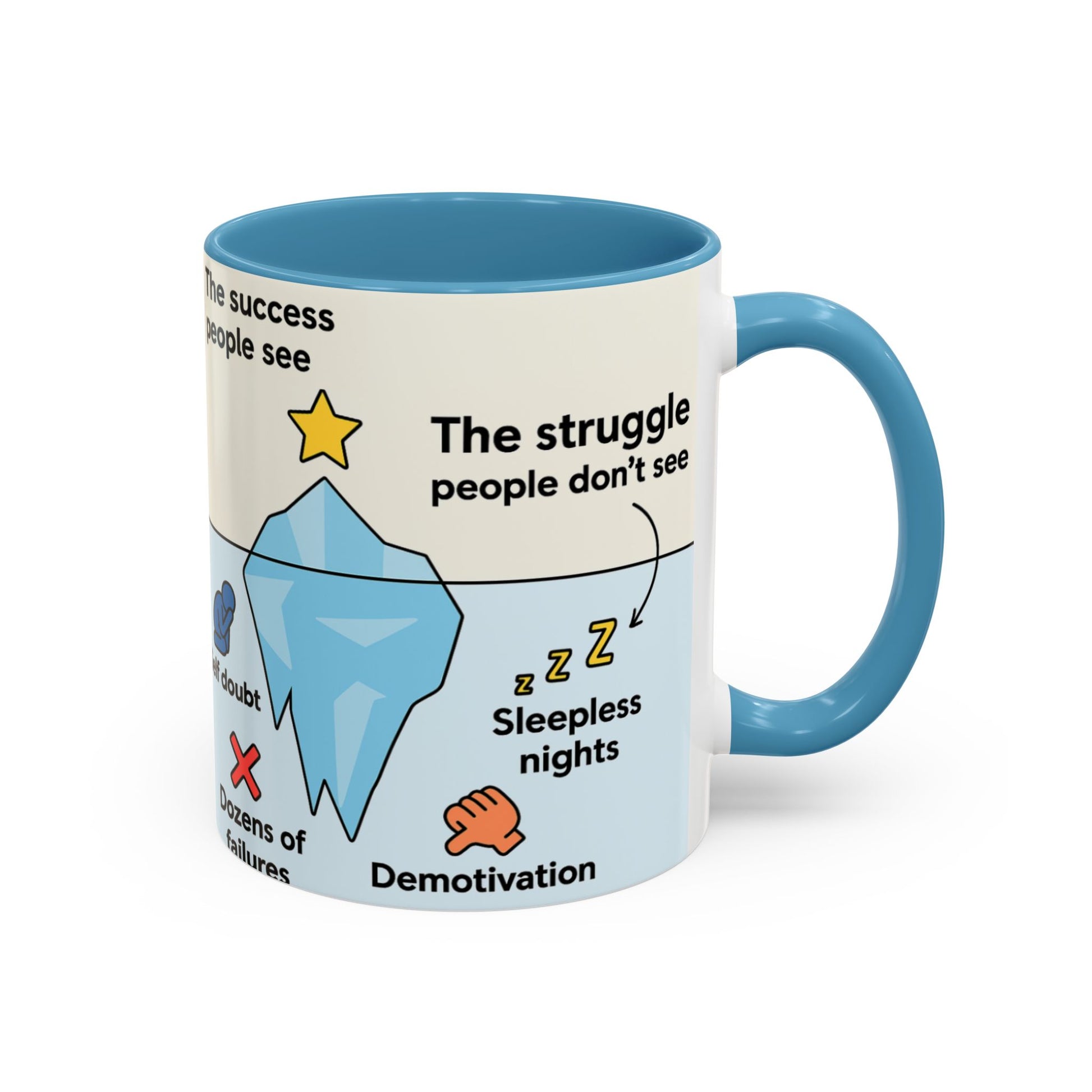 Introducing our vibrant Accent Coffee Mug, perfect for those who appreciate a little motivation with their morning brew. This mug features a unique design that showcases the journey of success, reminding you that every achievement has its hidden struggles. Ideal for students, professionals, entrepreneurs, graduates, hardworking professionals, or anyone on a personal growth journey. This mug not only serves your favorite beverages but also sparks inspiration every time you use it. Whether it's a casual coffee chat with friends or a cozy evening with tea, this mug adds a touch of color and positivity to your day. Perfect for gifting during occasions like graduations, birthdays, or simply as a pick-me-up for yourself!