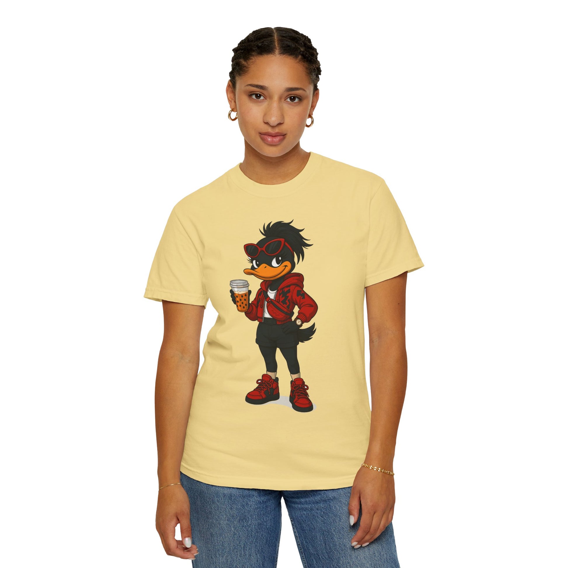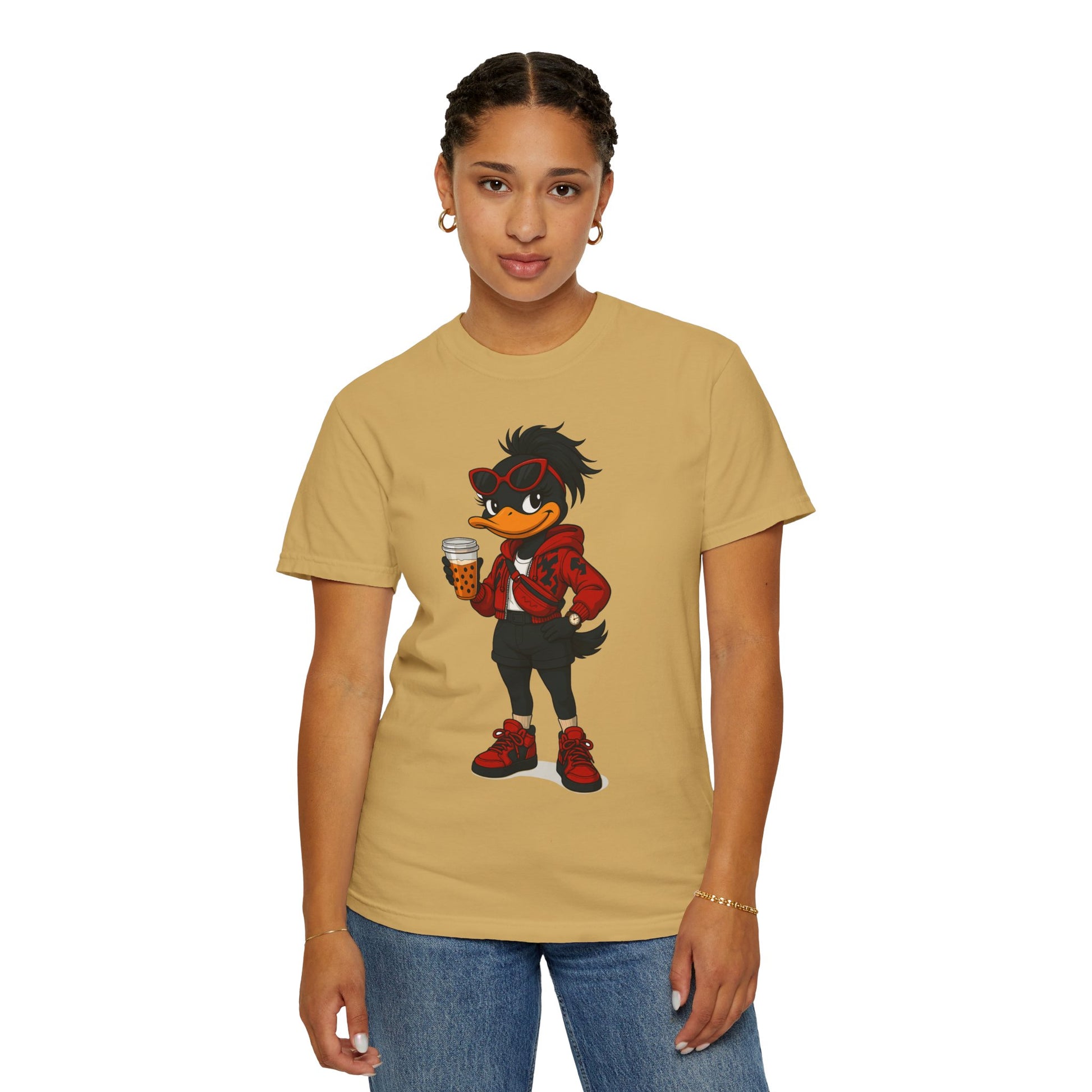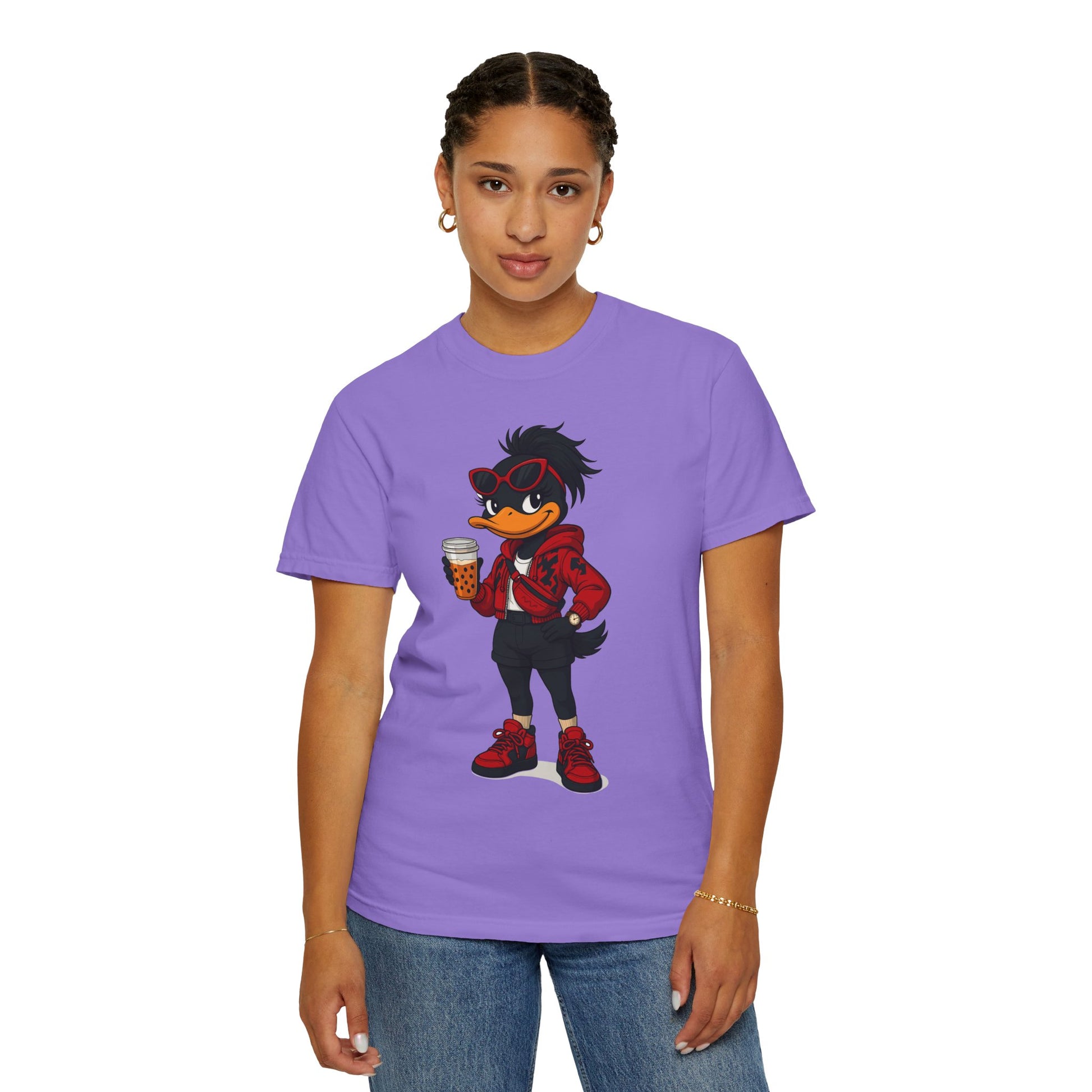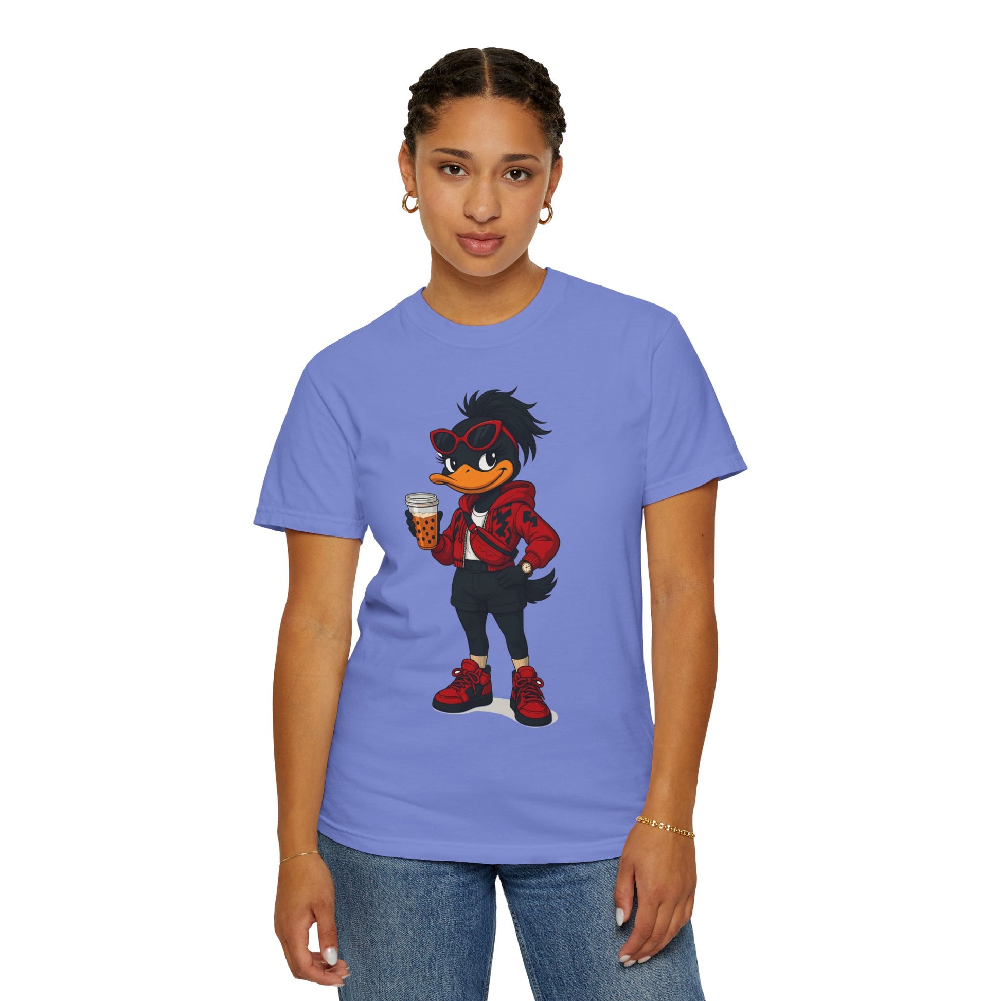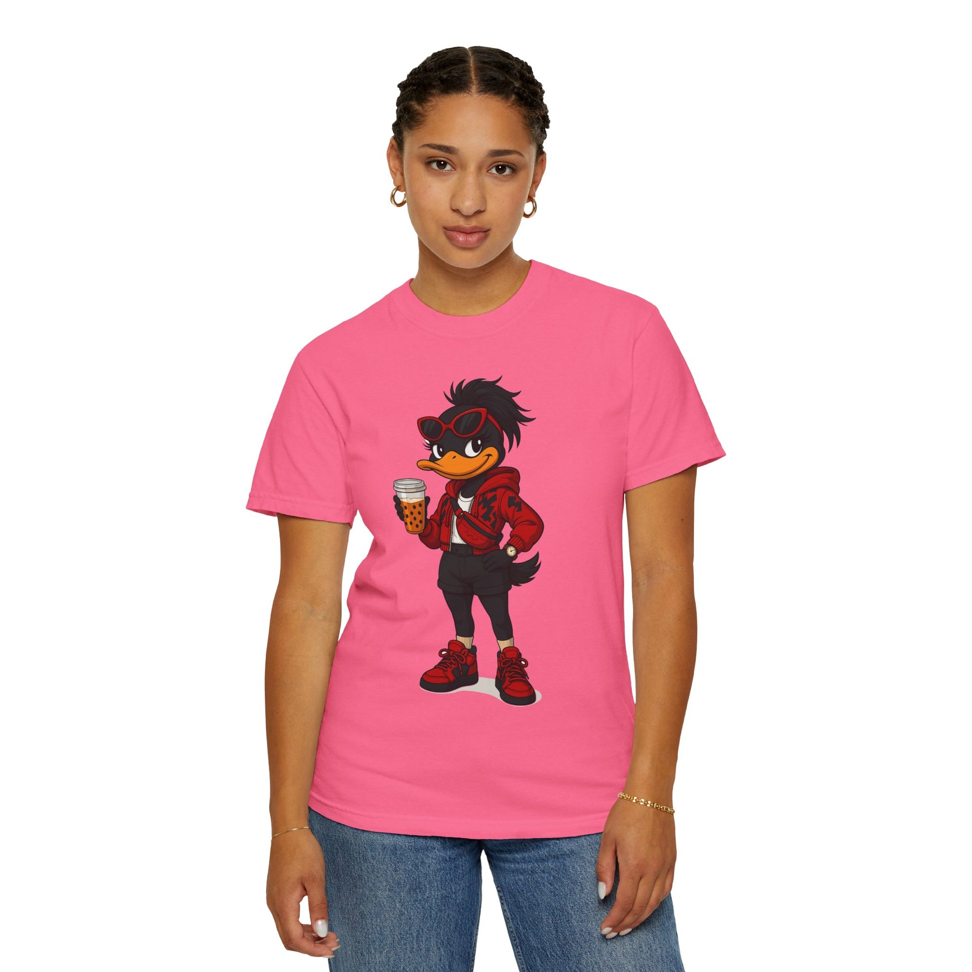 Introducing a vibrant and stylish woman's garment-dyed graphic t-shirt, designed for creative souls who love to stand out with its unique artistic character design. This soft and breathable tee brings a playful vibe to casual outings or relaxed days at home. Perfect for expressing individuality, this casual comfort is ideal for anyone who loves to blend comfort with flair —be it artists, designers, or free spirits. Whether you’re enjoying a laid-back weekend, celebrating casual gatherings, or just hanging out with friends, this shirt fits seamlessly into everyday life. Also, a great gift for birthdays, holidays, or any occasion that calls for a little fun!