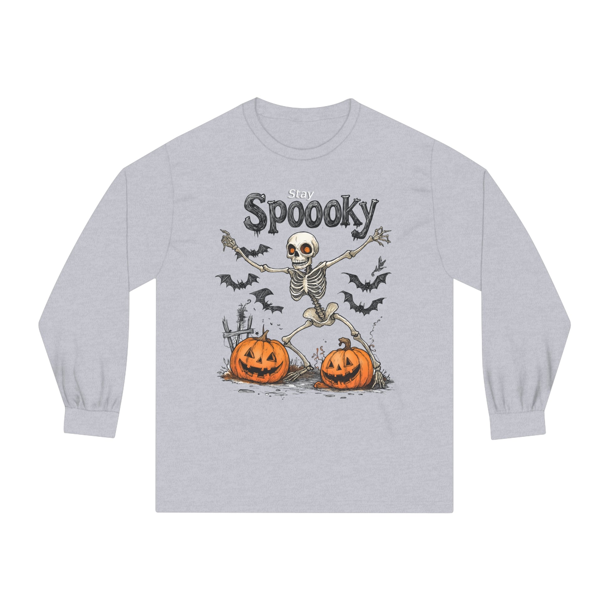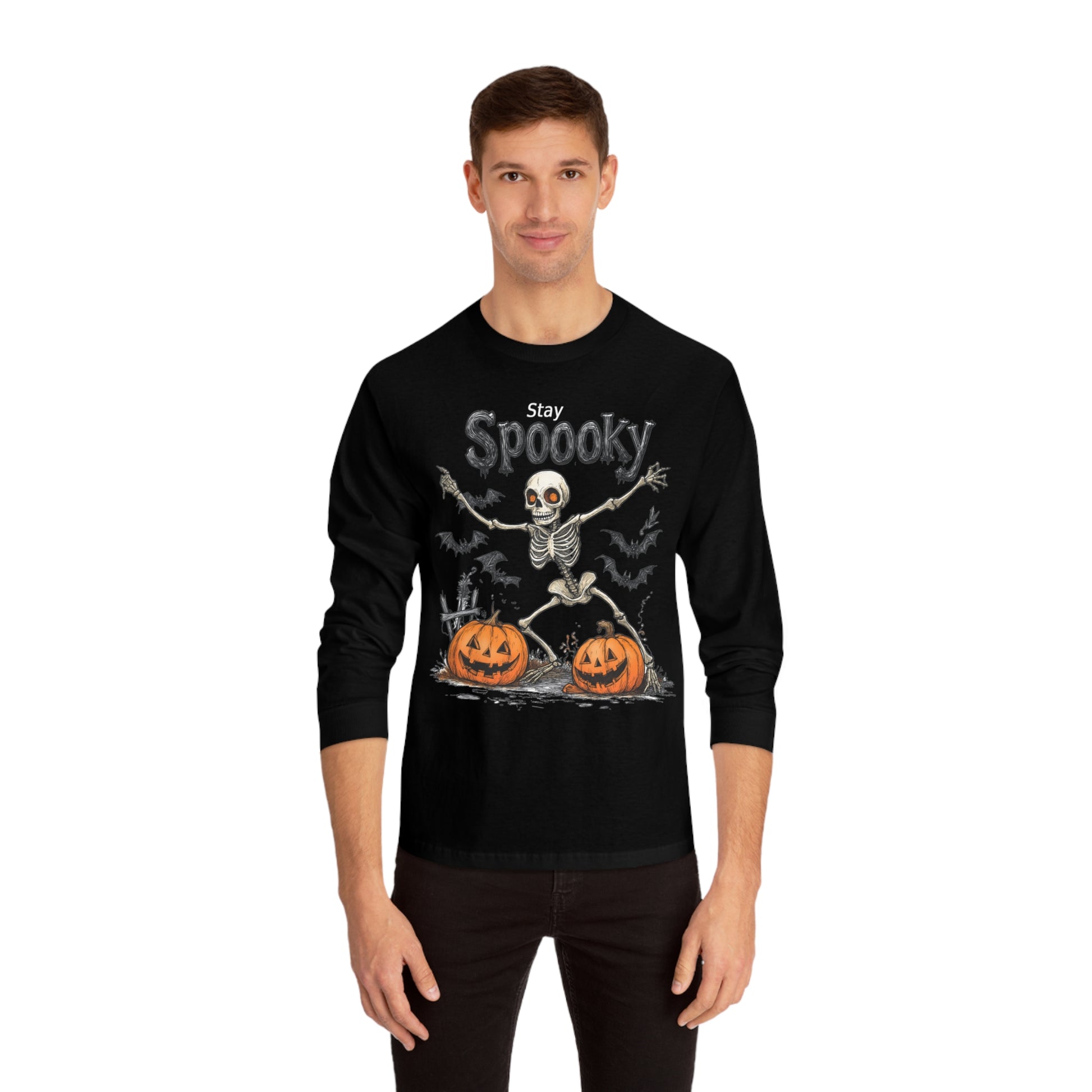 Get into the spirit of Halloween with the Spooky Dance Party: Unisex Long Sleeve Tee! This festive tee features a captivating hand-drawn illustration of a scary yet attractive skeleton dancing with pumpkins and bats. The "Stay Spoooky" text adds a playful touch to this spooky design.