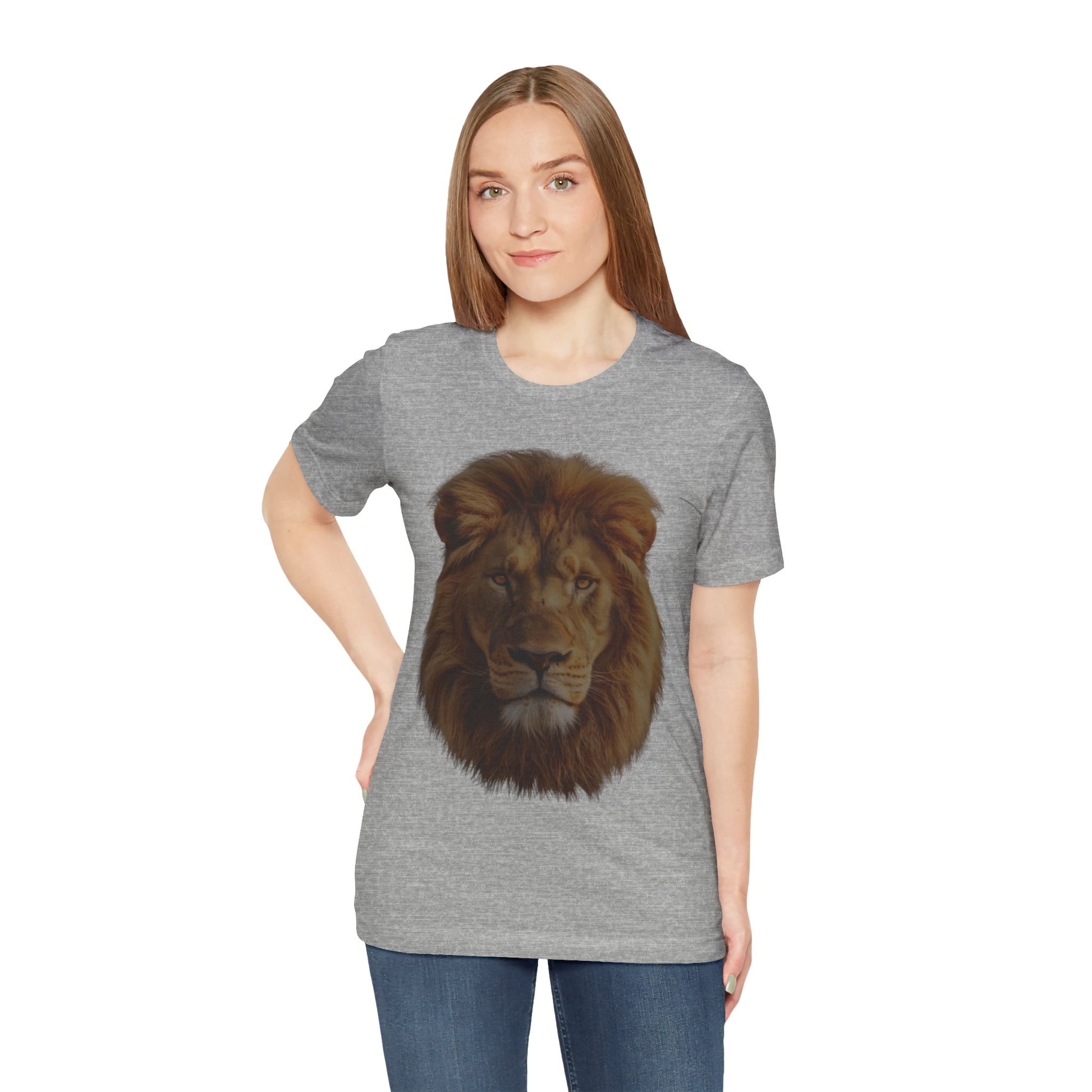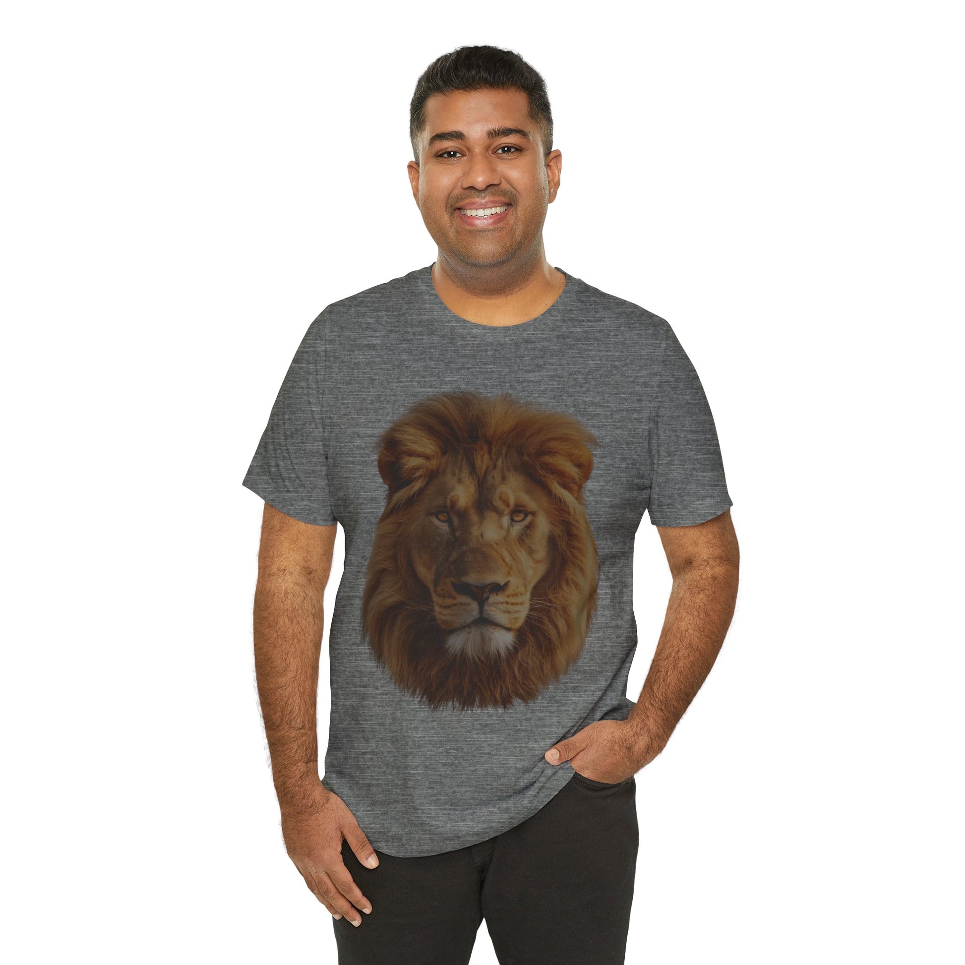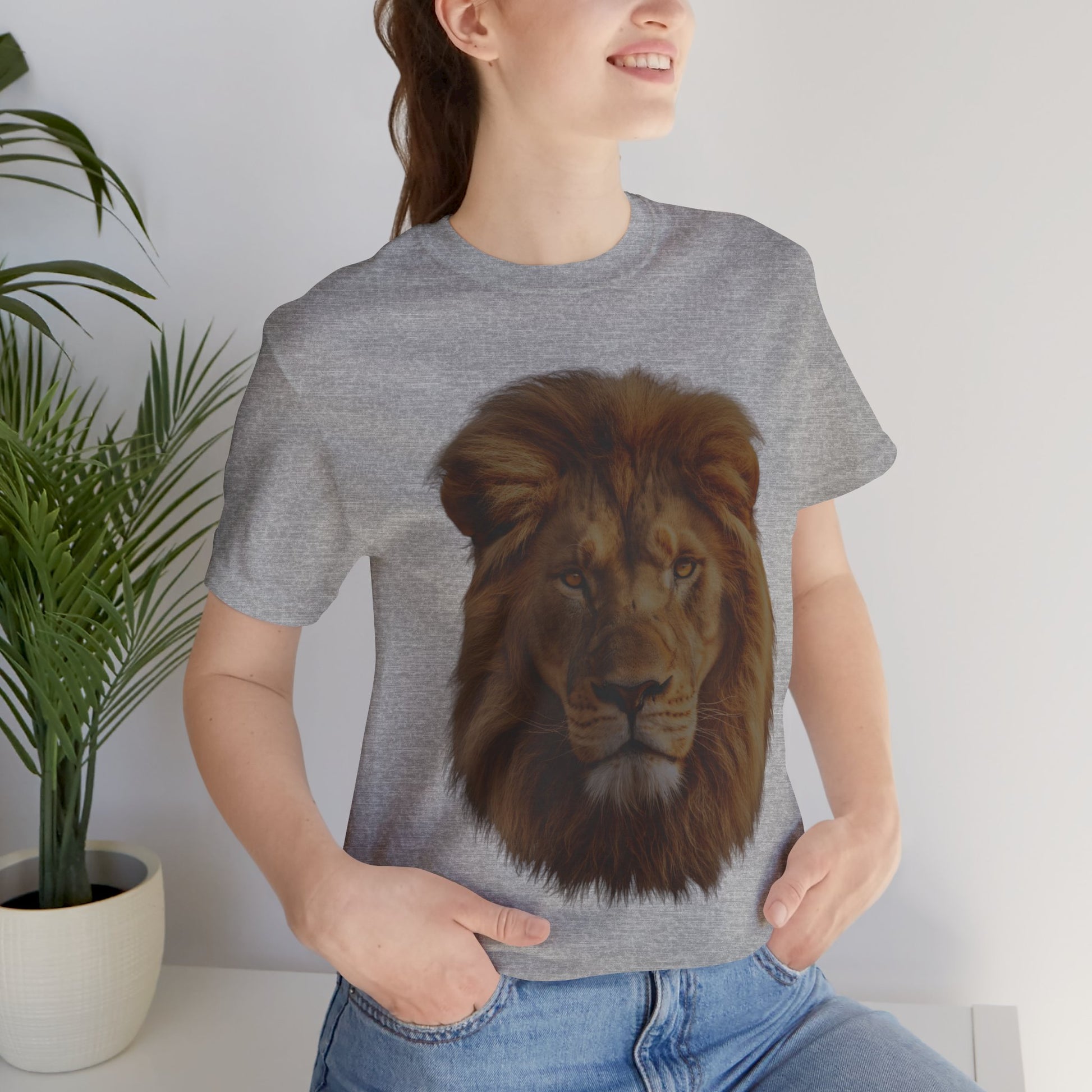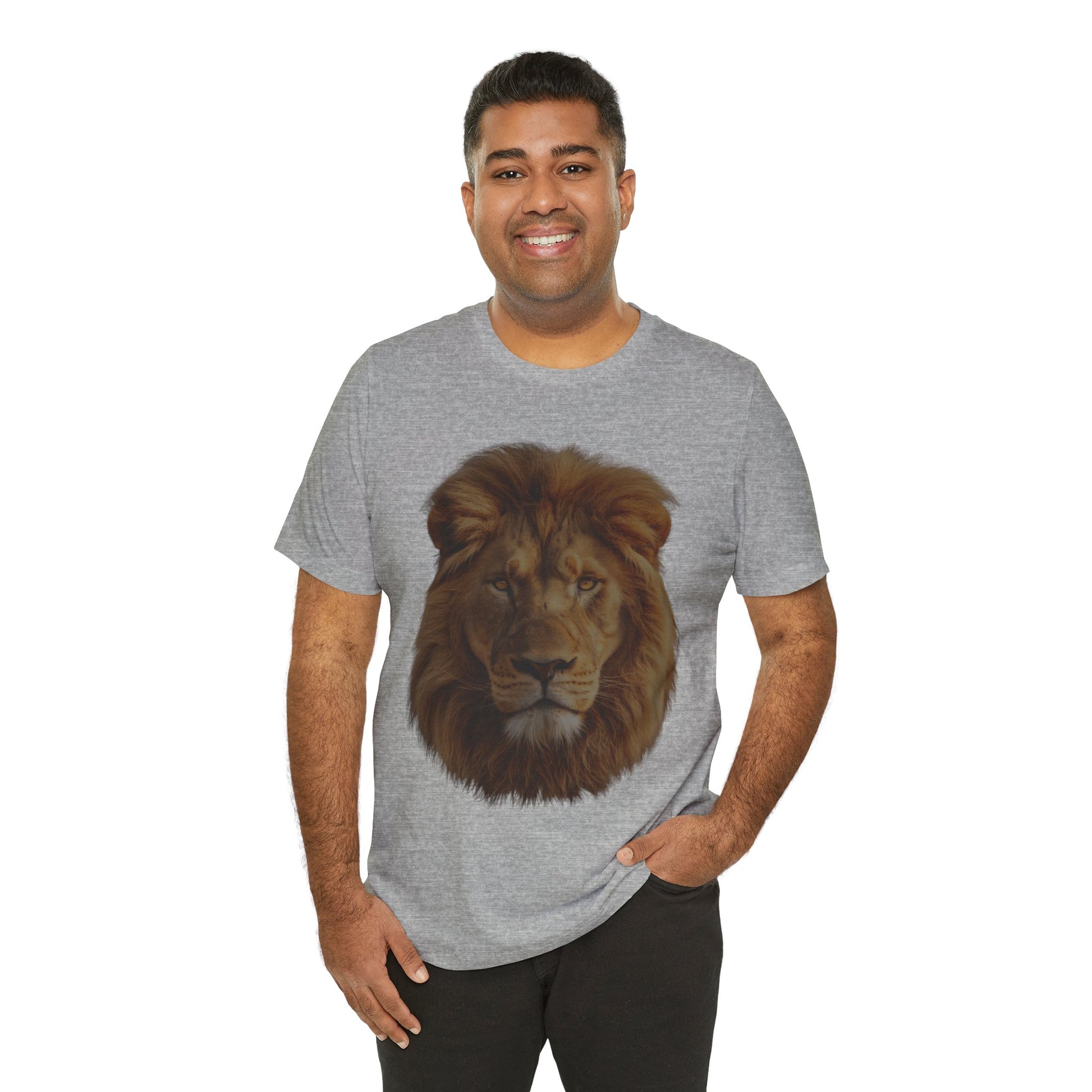 Embrace the power of the wild with this stunning unisex lion portrait Unisex Jersey Short Sleeve Tee. This high-definition design captures the raw majesty of a lion; The realistic depiction and deep contrast of the lion's mane and features create an immersive savannah environment, transporting you to the heart of the wild. Whether you're a wildlife enthusiast, a lover of powerful animal imagery, or simply looking for a unique and striking piece of clothing, this t-shirt is for you. Its versatile unisex fit makes the t-shirt suitable for all genders and pairs perfectly with jeans, shorts, or layered under a jacket.
