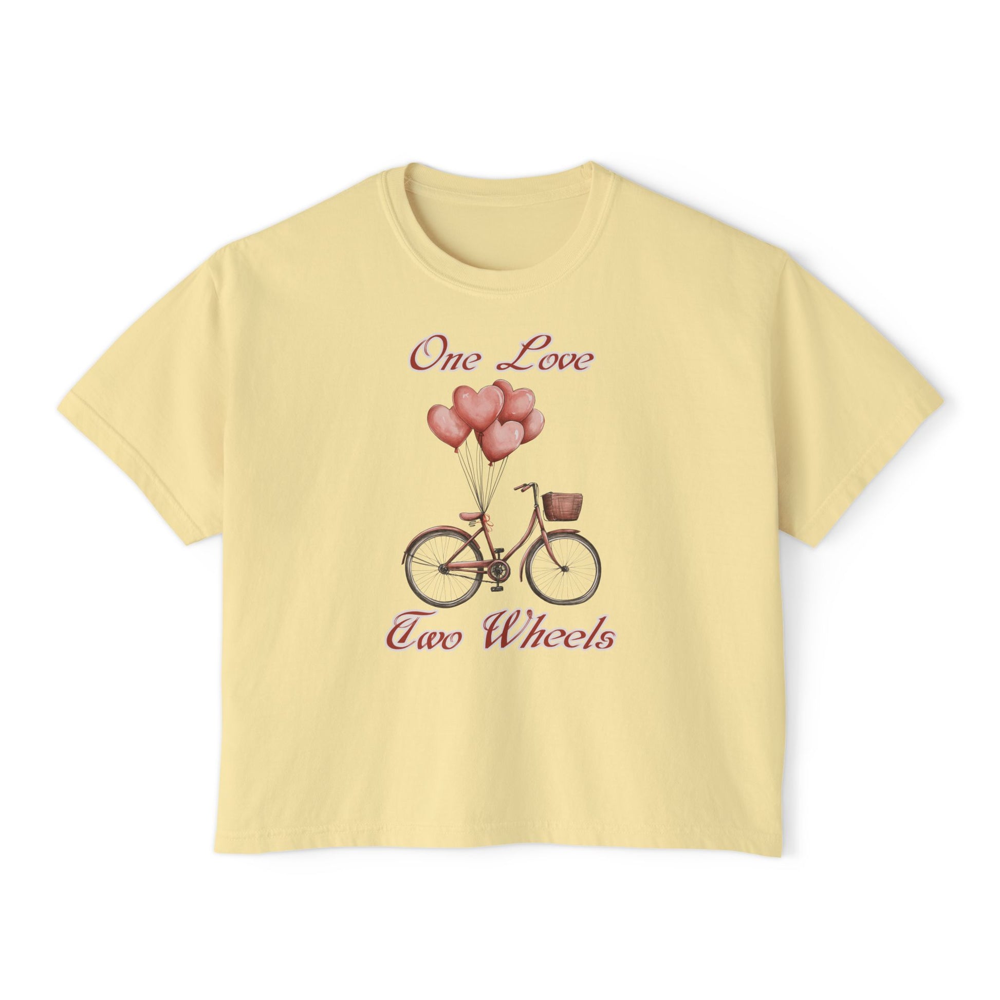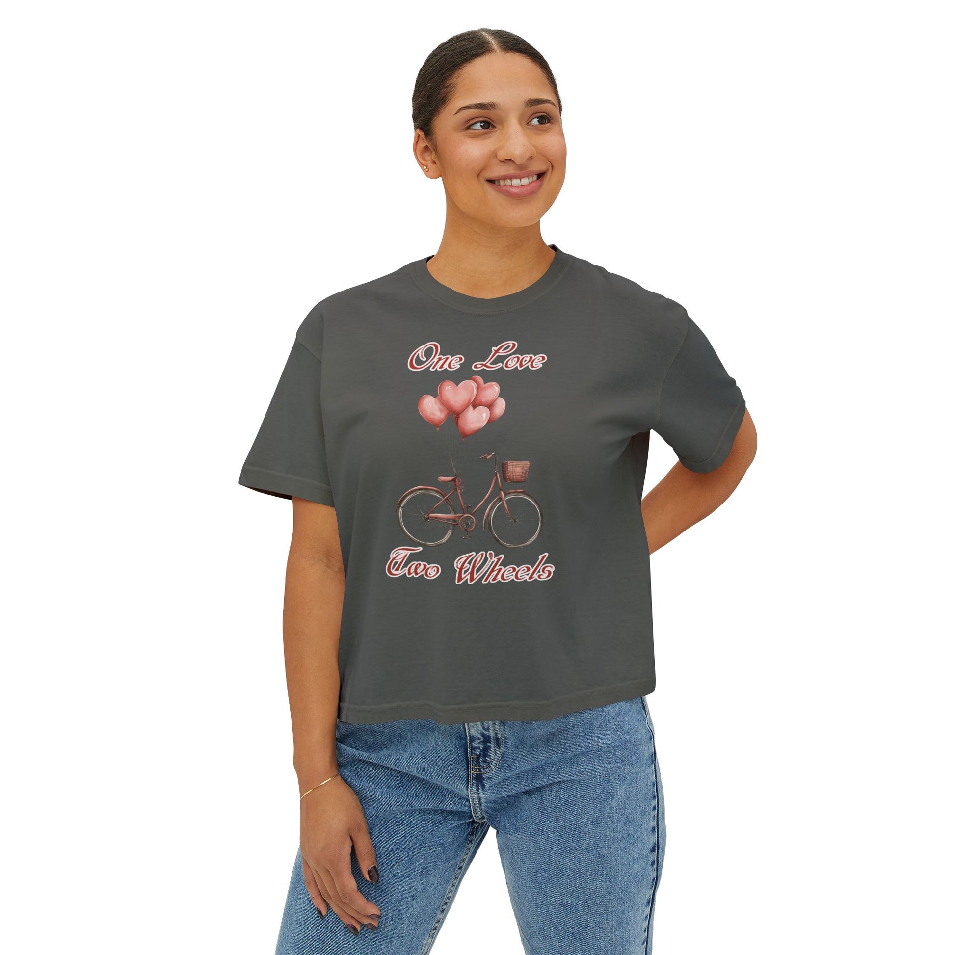 Vintage Bike Boxy Tee - Valentine's Day Women's Boxy Tee with Heart Balloons Graphic