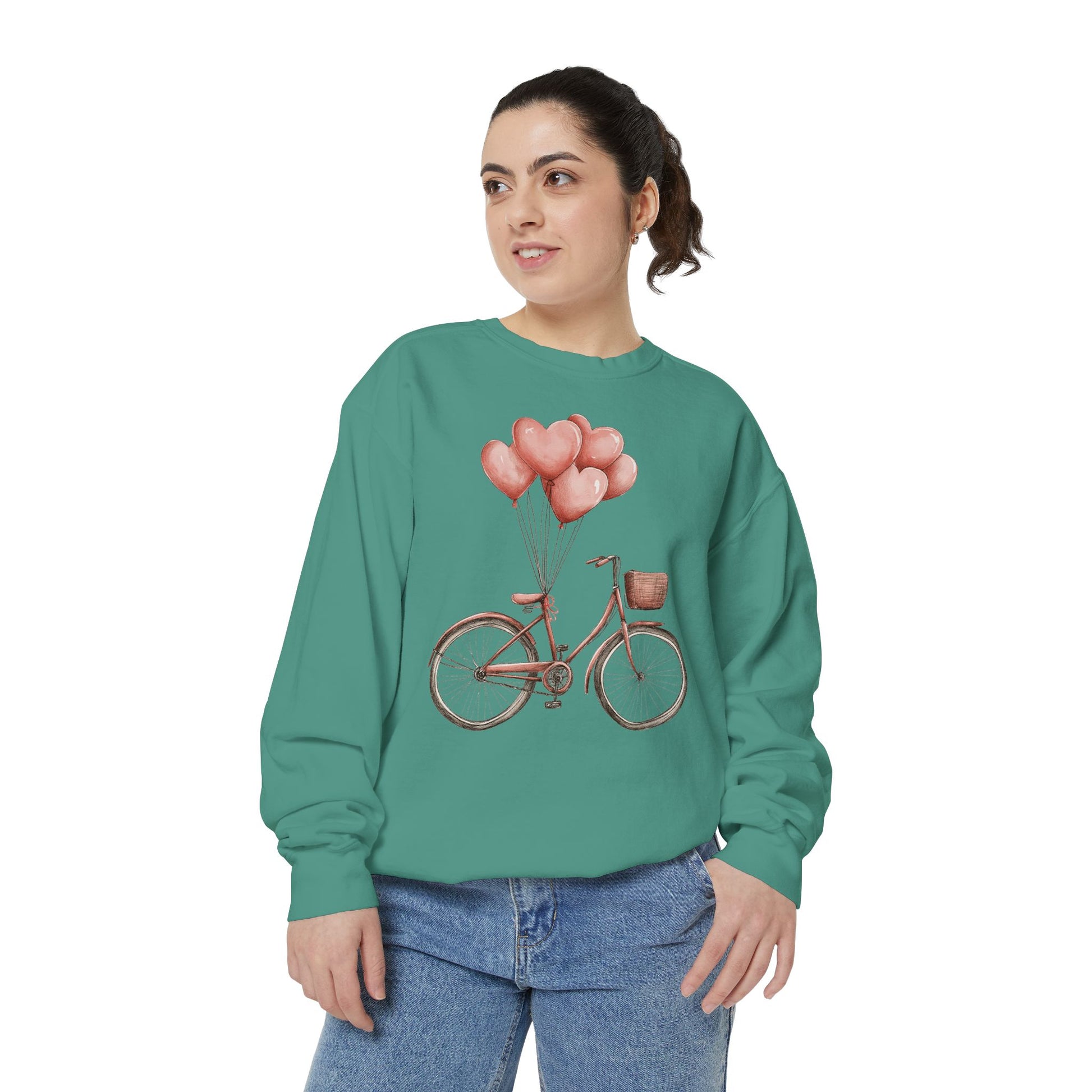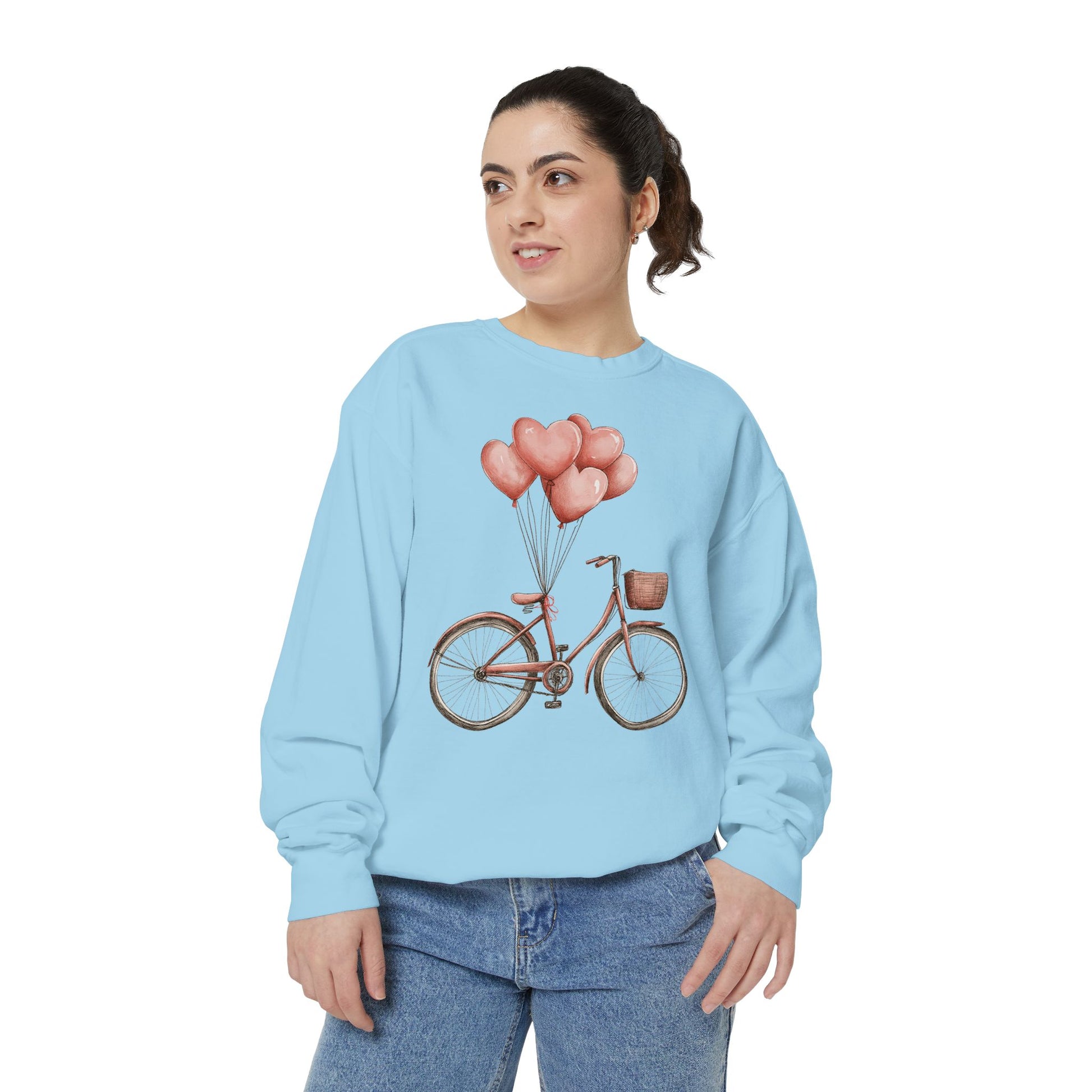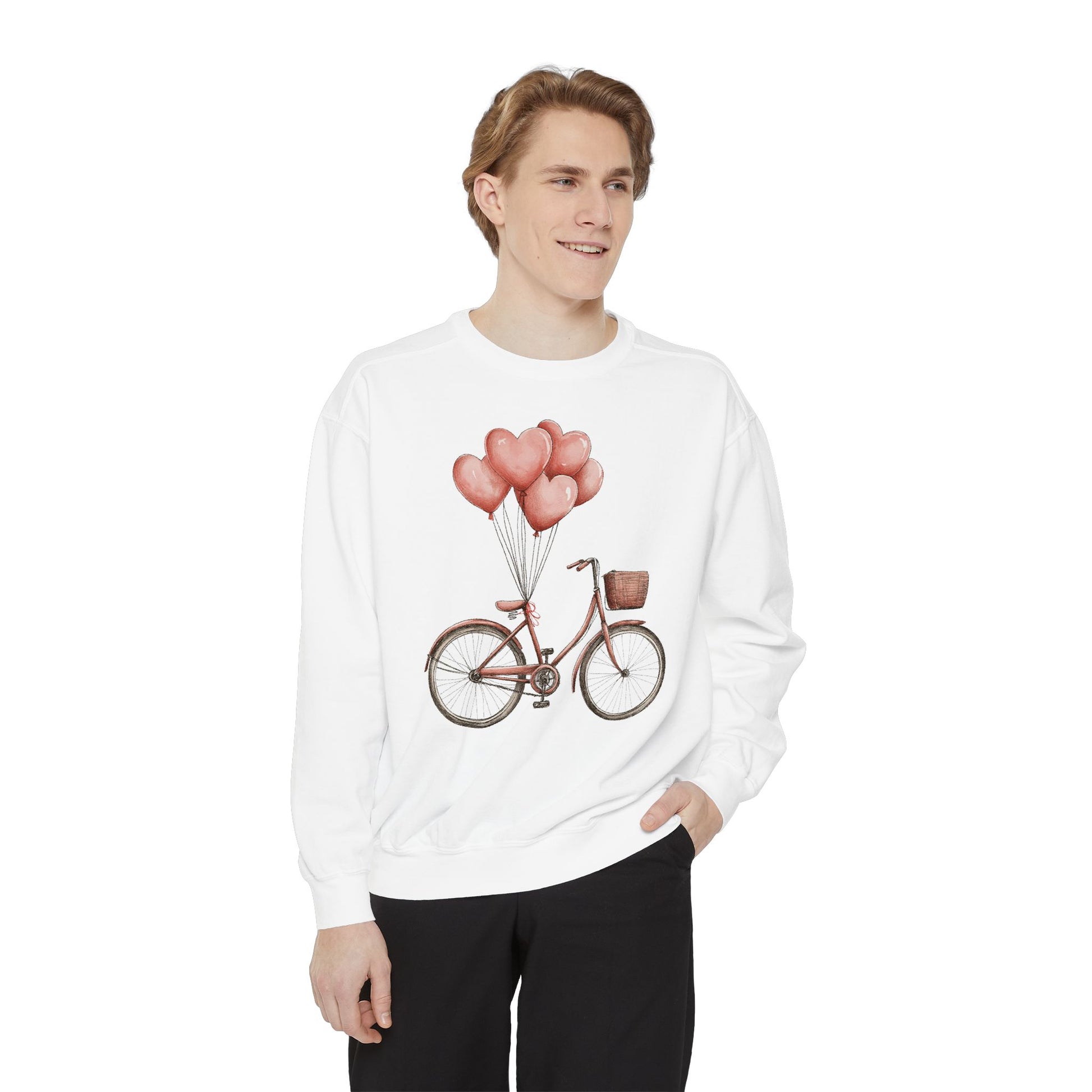 Stay cozy and stylish with this Unisex Garment-Dyed Sweatshirt, featuring an adorable vintage bicycle with heart-shaped balloons tied to the back, illustrated in soft pink and red tones. The clipart style and intricate details create a nostalgic, romantic vibe, adding a charming, sticker-like look that introduces a touch of whimsy to your wardrobe. The high-detail artwork offers a delightful balance of vintage flair and modern style, making this sweatshirt a standout piece for casual wear. Each sweatshirt has a rolled-forward shoulder and a back-neck patch.
