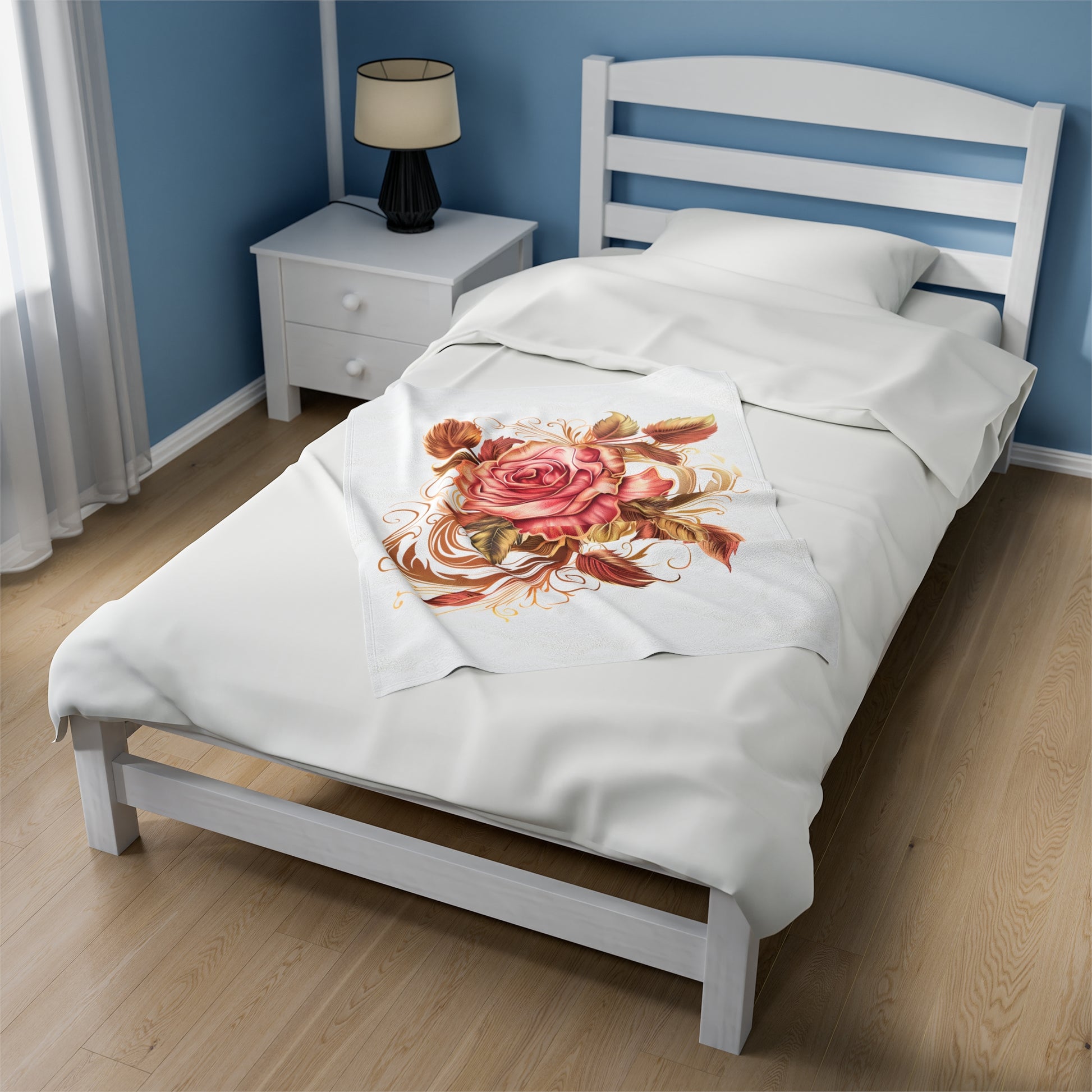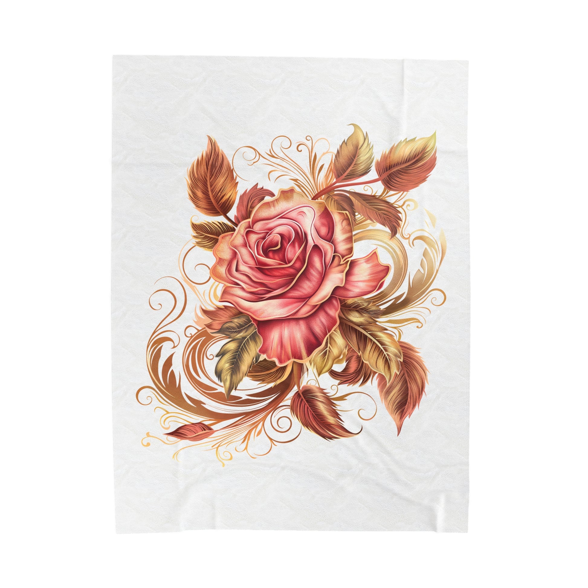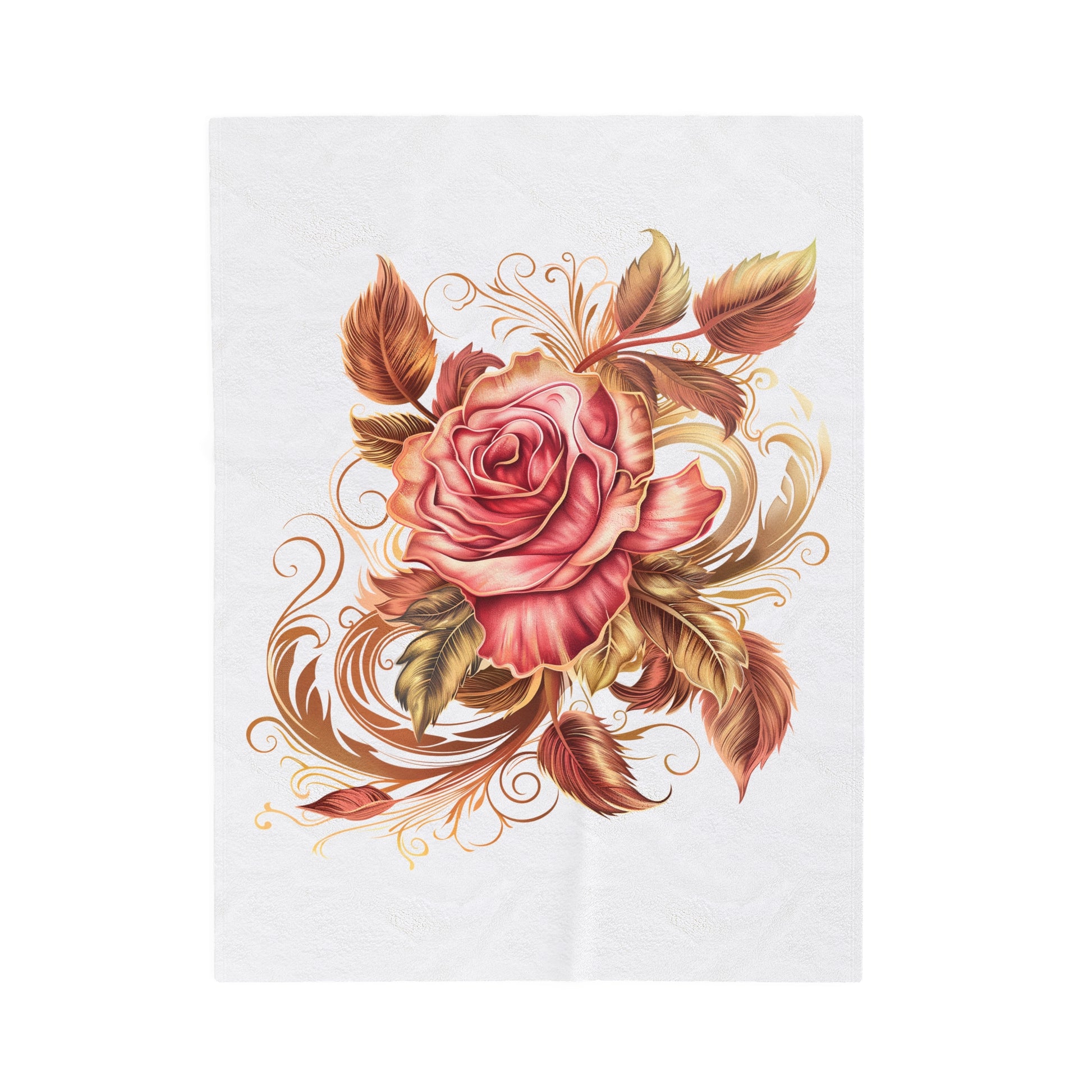 Velveteen Plush Blanket with an enchanting pink rose surrounded by swirling leaves, reminiscent of a romantic garden scene. The mood is whimsical and beautiful, with warm, golden lighting enhancing the flower's enchanting allure. This exquisite blanket is crafted to elevate your relaxation experience, enveloping you in softness and beauty. Made from high-quality materials, it provides warmth and coziness while adding a touch of elegance to any room. Explore our collection today and transform your space into a haven of relaxation and inspiration!