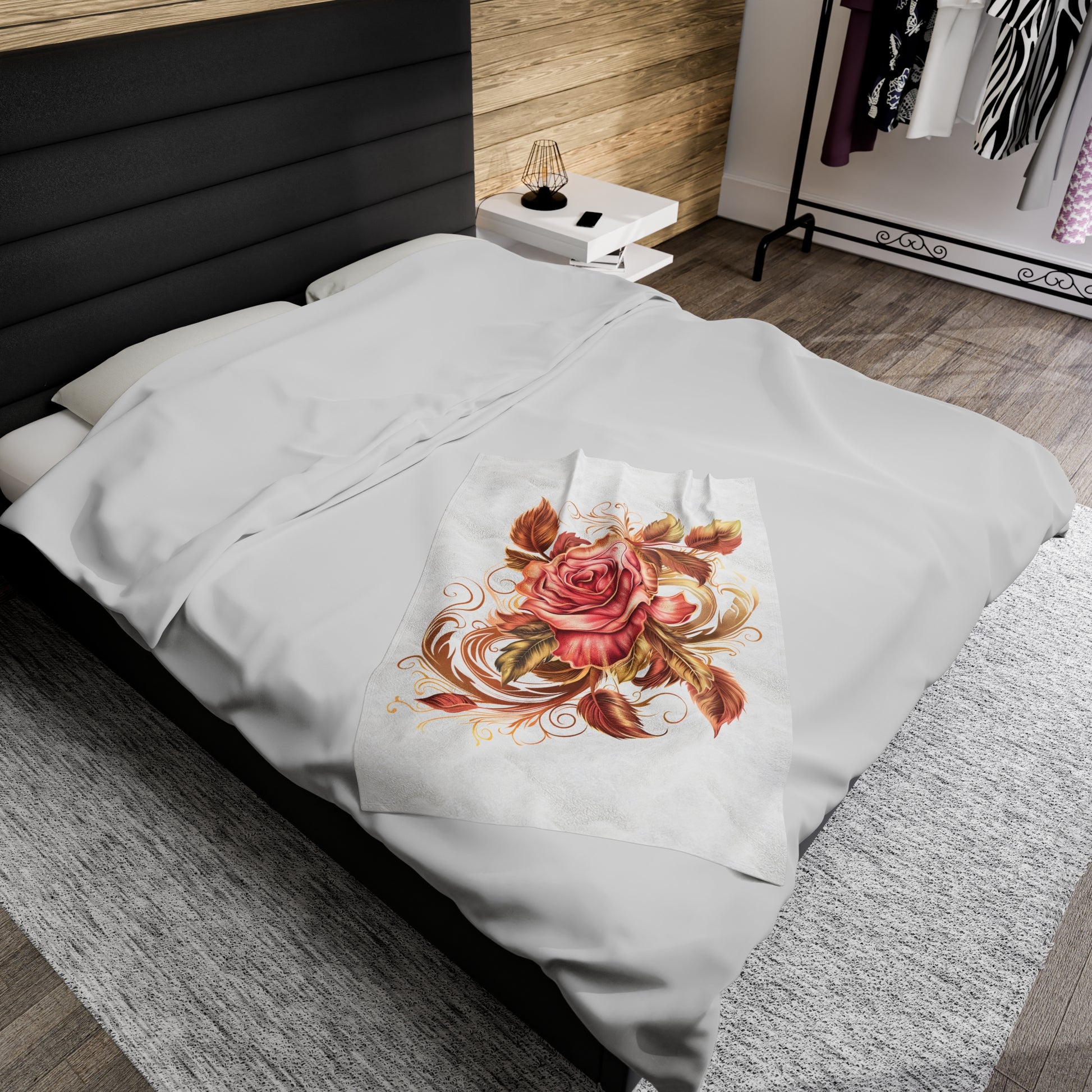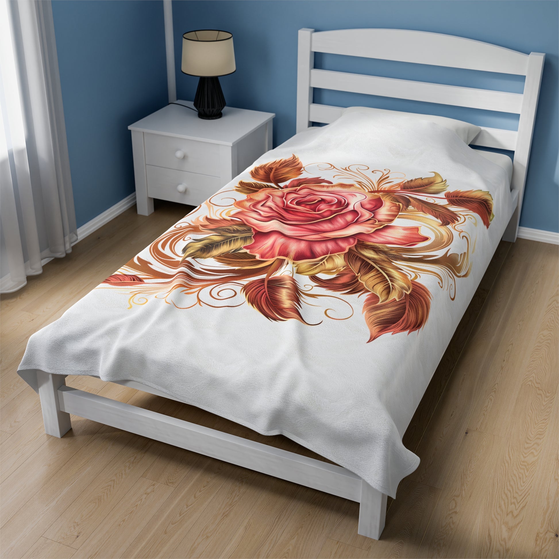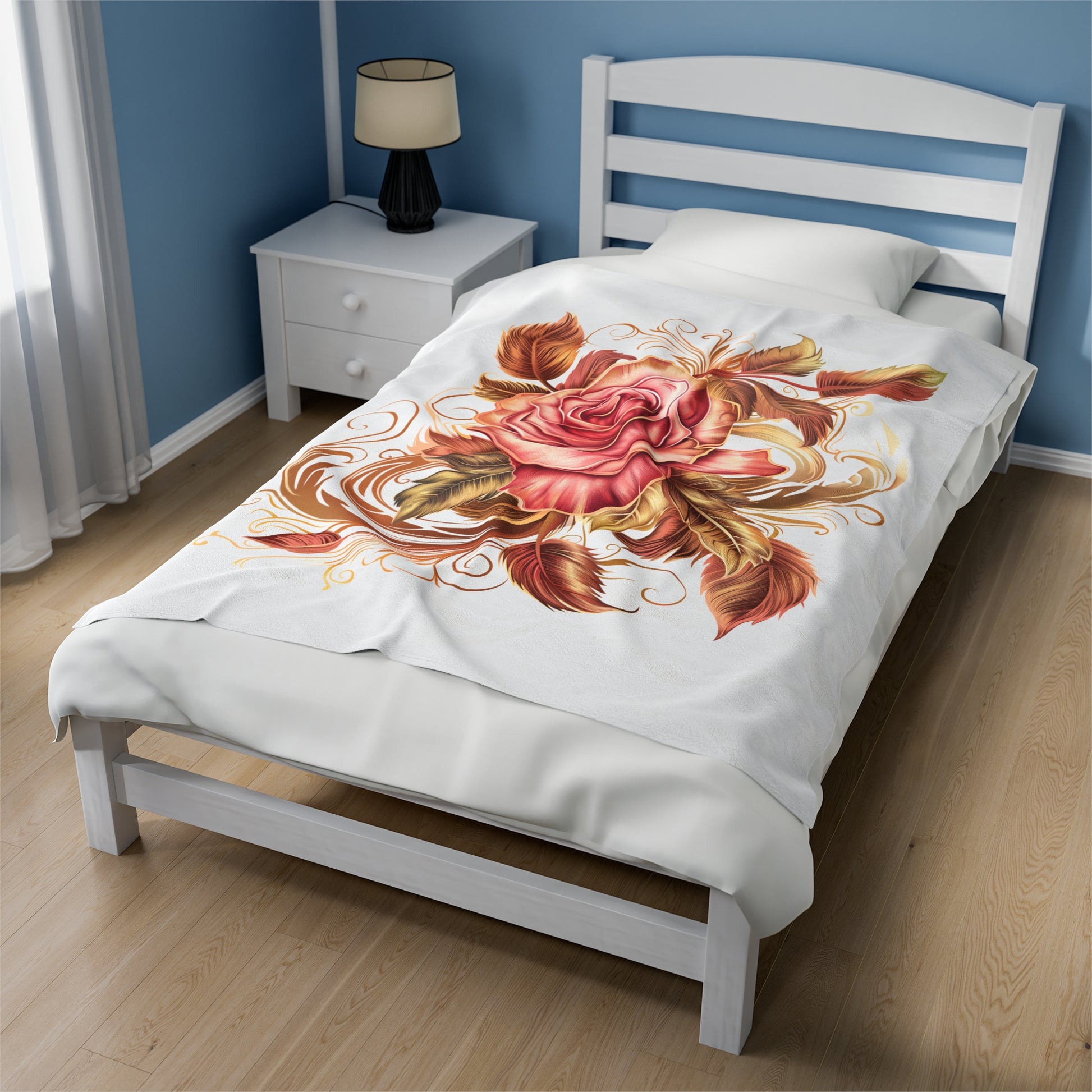 Velveteen Plush Blanket with an enchanting pink rose surrounded by swirling leaves, reminiscent of a romantic garden scene. The mood is whimsical and beautiful, with warm, golden lighting enhancing the flower's enchanting allure. This exquisite blanket is crafted to elevate your relaxation experience, enveloping you in softness and beauty. Made from high-quality materials, it provides warmth and coziness while adding a touch of elegance to any room. Explore our collection today and transform your space into a haven of relaxation and inspiration!